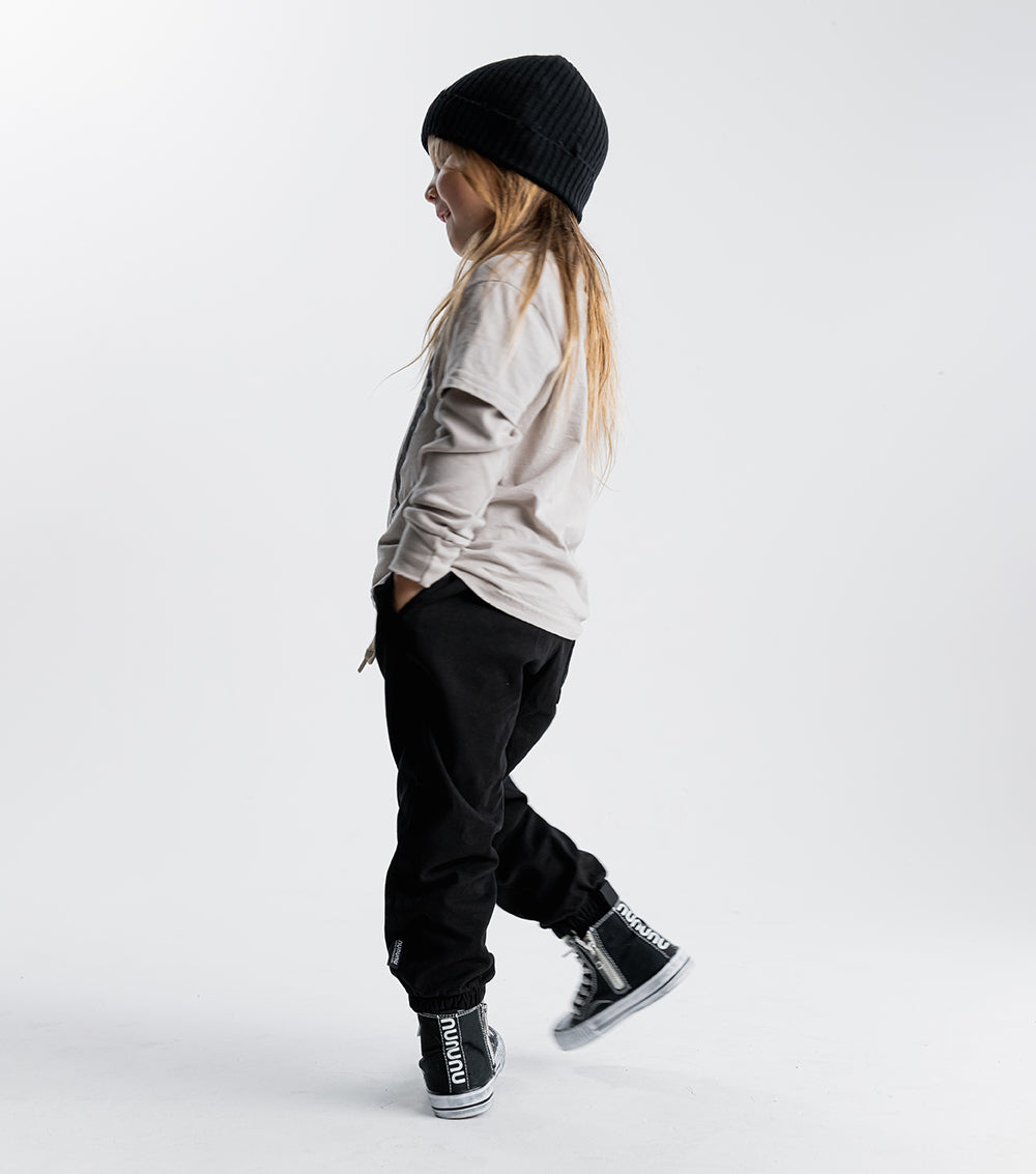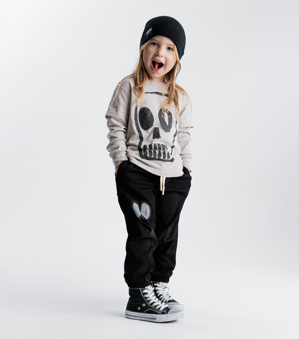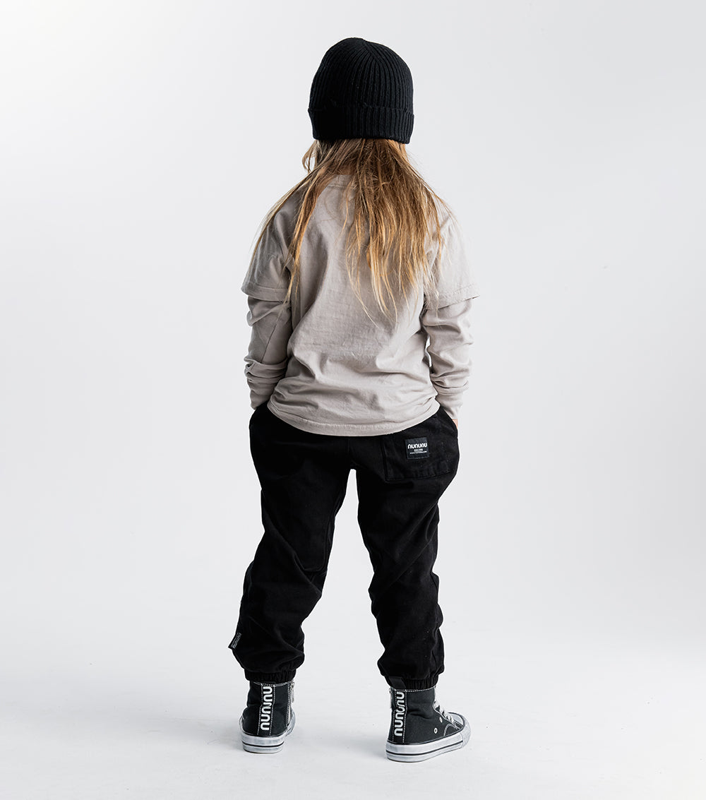 these gender neutral black pants are so having a moment. perfect for heading to class, stunting on the playground, or scooting around town. the material is extra soft & breathable light drill and they’ve got a cinched drawstring waistband & matching ankle cuffs for jogger-style comfort. the fit gives it a more dressed look which we are all about. plus a big old back pocket on the right side with a sick flap to pop open when stashing snacks.