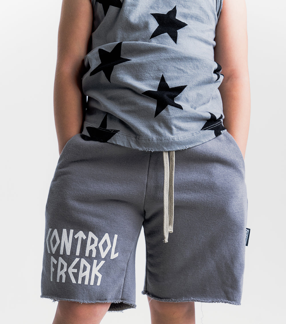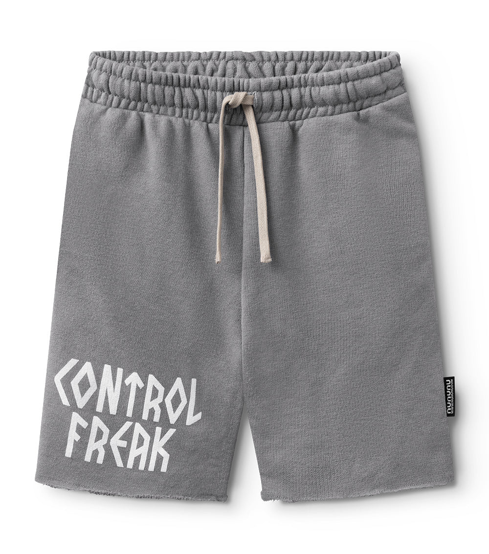 let your kid get their island vibes on with this super comfy concrete french terry shorts. they’re a basic gender-neutral cut with control freak printed on the side in a font that looks like it could have been written in sticks on a sandy beach. the t in control is an arrow pointing up so everyone knows who these shorts are talking about. side pockets are there for keeping hands warm & a drawstring makes sure they’ll stay put. this fit is perfect for throwing on after wading around in the waves or chilling in front of the bonfire on summer nights.