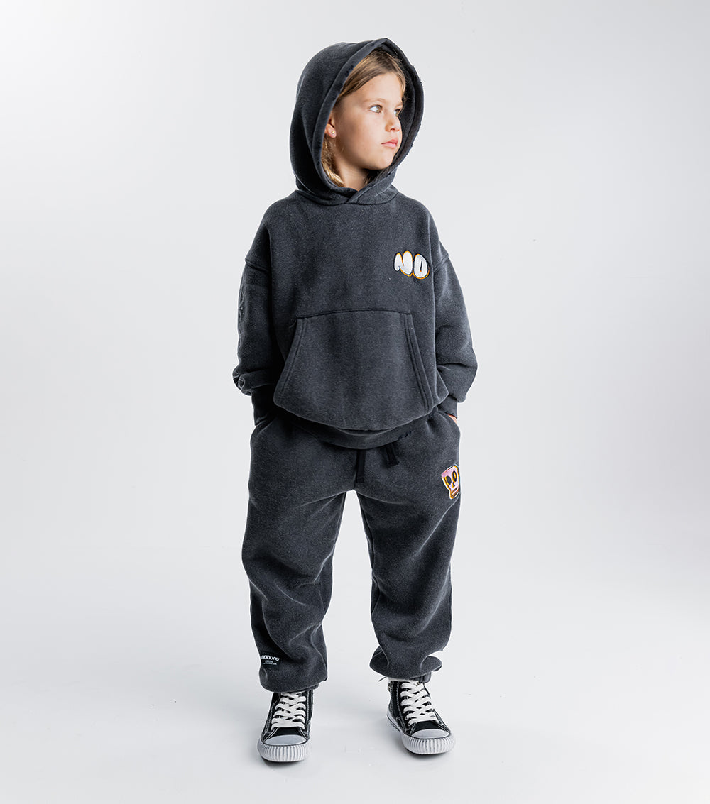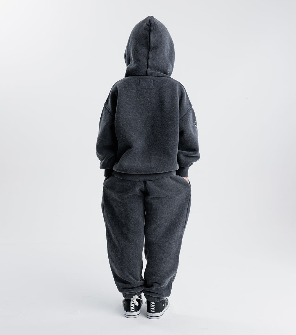 introducing the coziest sweatpants literally ever. take your usual pair and throw them out the window because we are pretty sure these are the only ones your kid is gonna want to rock. these gender neutral graphite sweatpants are made with inner brushed heavy french terry so pretty much like wearing a walking hug. they’ve got cinched ankle cuffs and a matching drawstring waistband so that slouchy look wears like perfection. plus we added some spook with this embroidered skull patch created in collab with artist shay id alony. style with a bold t or make it a full cozy look with the matching hoodie.