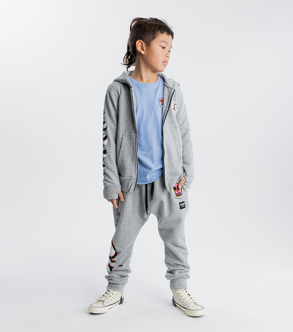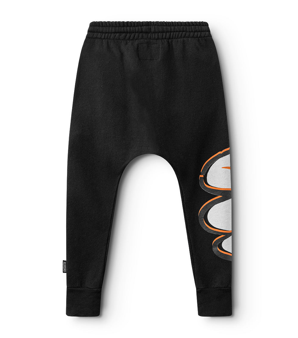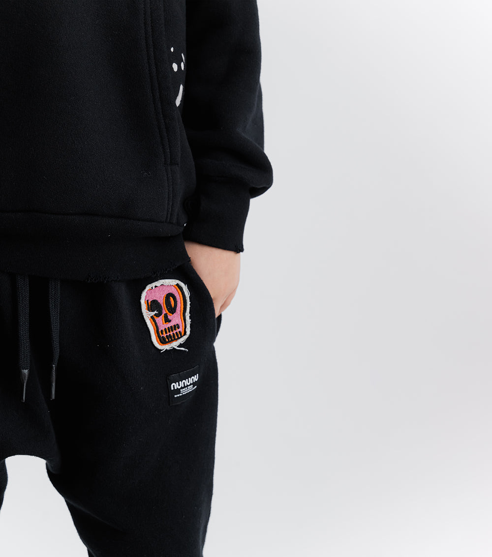 when your kid is feeling extreme and wants the world to know it, these black gender neutral baggy pants are so it. we’ve added drippy, bubbly graffiti letters up the calf that scream “no,” just how your kid is probably feeling on the day they wear these. oh yeah, and peep the super rad embroidered skull patch made in collab with artist shay id alony. they’re made of super soft french terry and are extra roomy so they’re def as comfy as they look. we’ve added a cinched waistband with a drawstring for that classic sweatpants feel. they’ve got hidden pockets for sticking one hand in when leaning against the wall at the playground. you know, as the hip kids do.