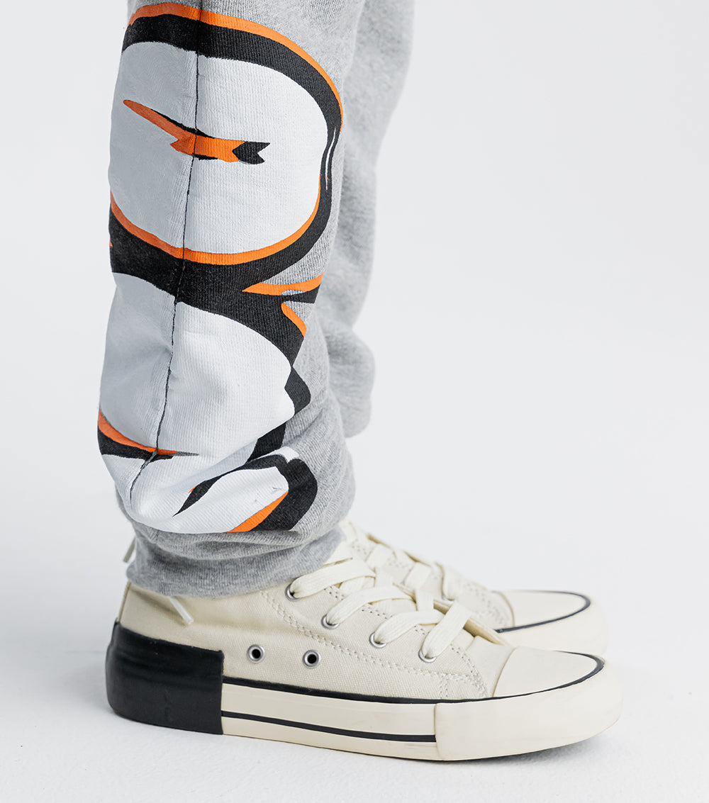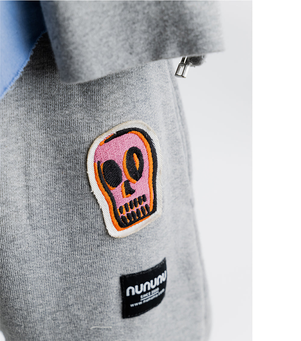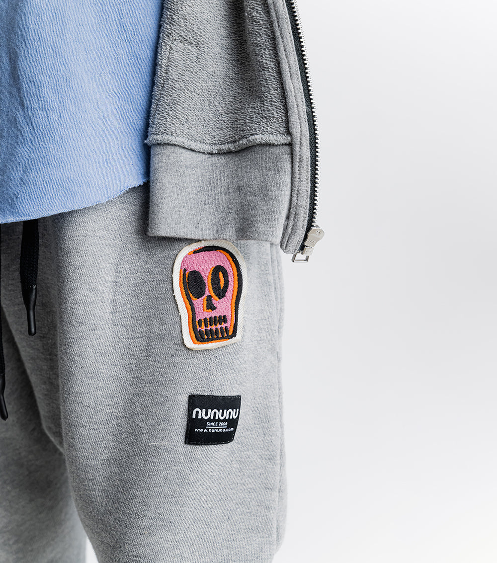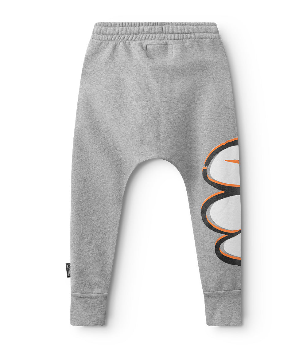 when your kid is feeling extreme and wants the world to know it, these heather grey gender neutral baggy pants are so it. we’ve added drippy, bubbly graffiti letters up the calf that scream “no,” just how your kid is probably feeling on the day they wear these. oh yeah, and peep the super rad embroidered skull patch made in collab with artist shay id alony. they’re made of super soft french terry and are extra roomy so they’re def as comfy as they look. we’ve added a cinched waistband with a drawstring for that classic sweatpants feel. they’ve got hidden pockets for sticking one hand in when leaning against the wall at the playground. you know, as the hip kids do.