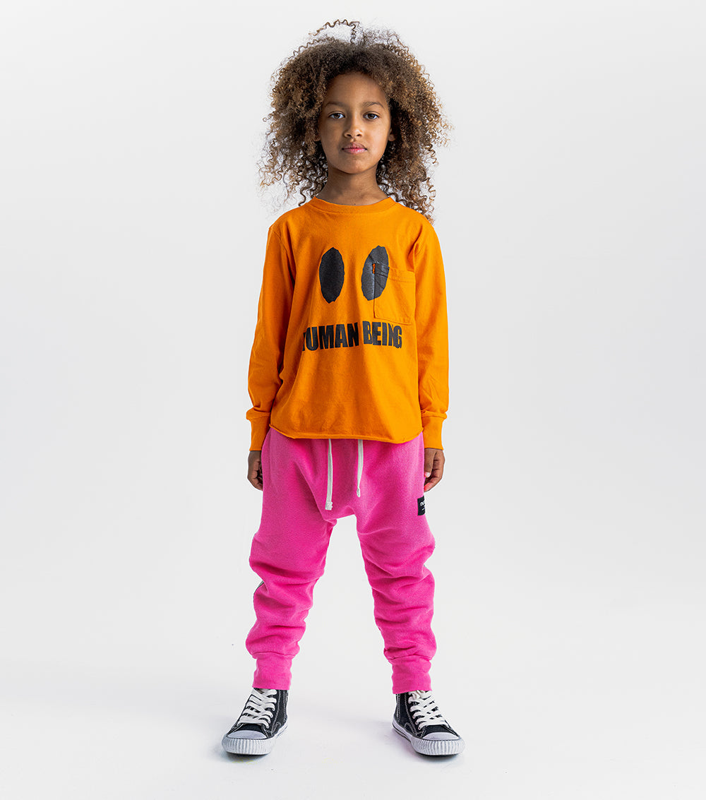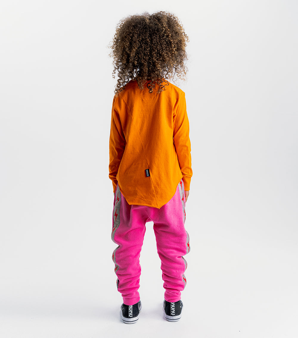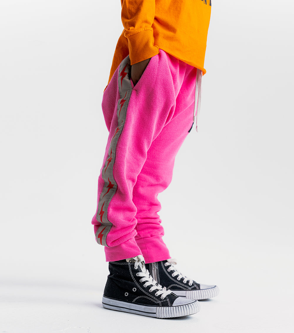 take our fave baggy pants and light them up. literally. we’ve added a way too lit grey ribbon detail on the side with mini lightning bolts striking in bright red from hips to ankles. made of super soft & cozy hot pink french terry for that i-never-want-to-take -these-off kind of feel. to make them even better they’re a universally flattering unisex cut with a drawstring waistband & the coolest wide cuffs. as always, they’re roomy & slouchy, giving legs the freedom they need to run, play & perhaps even sit still at times.