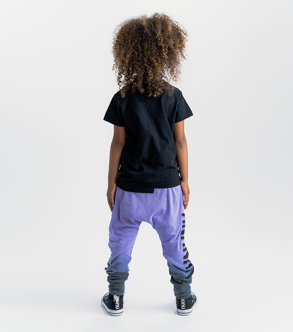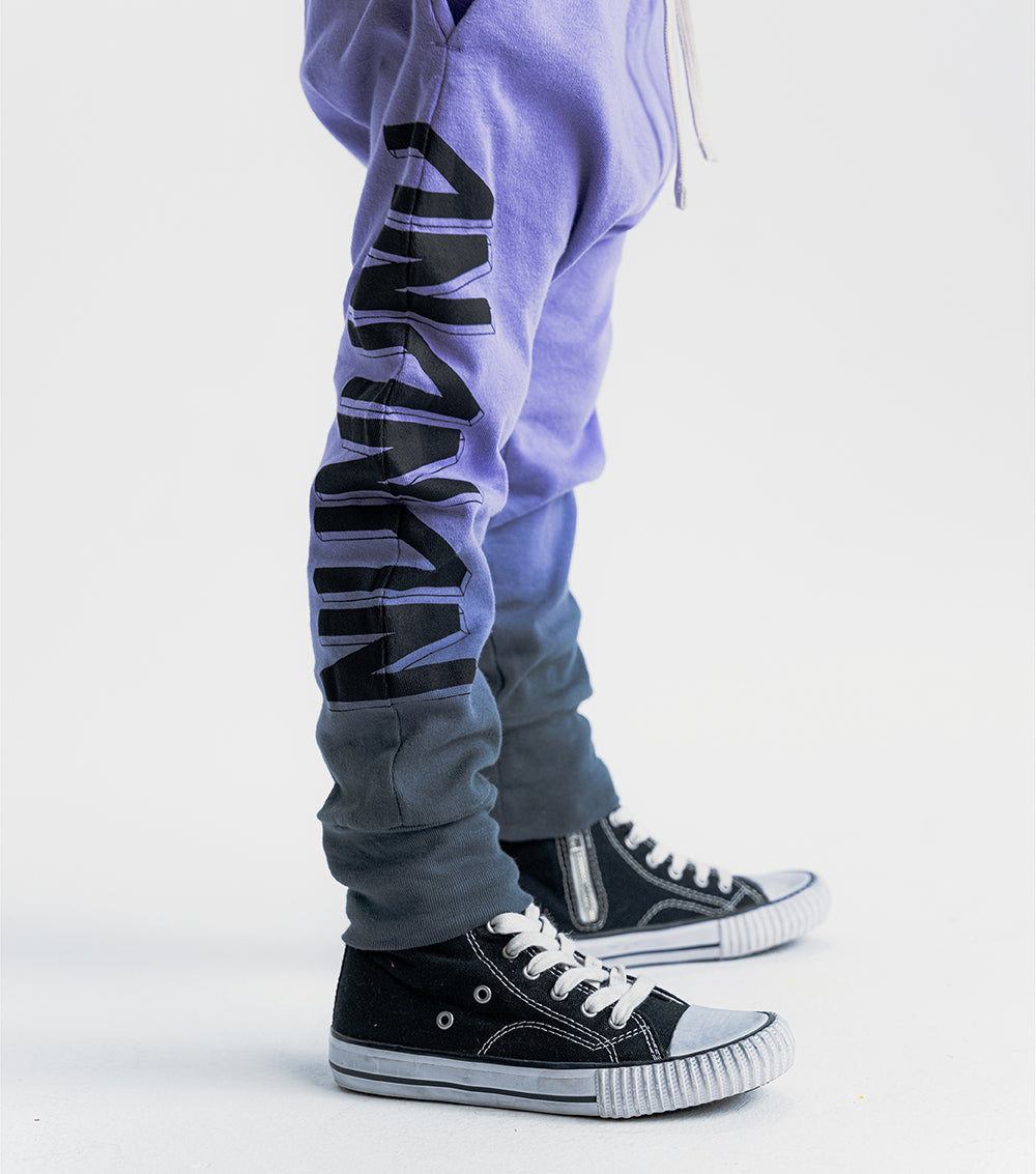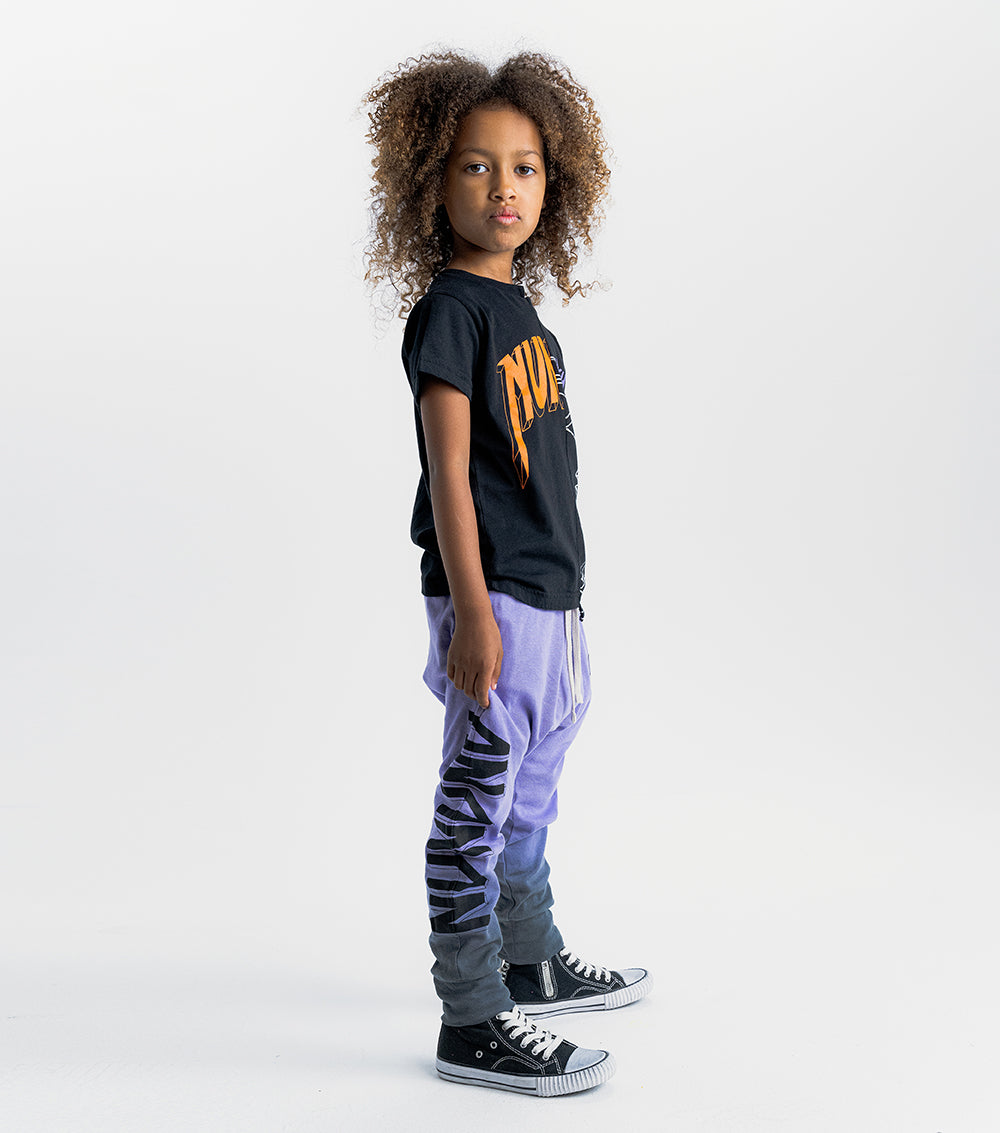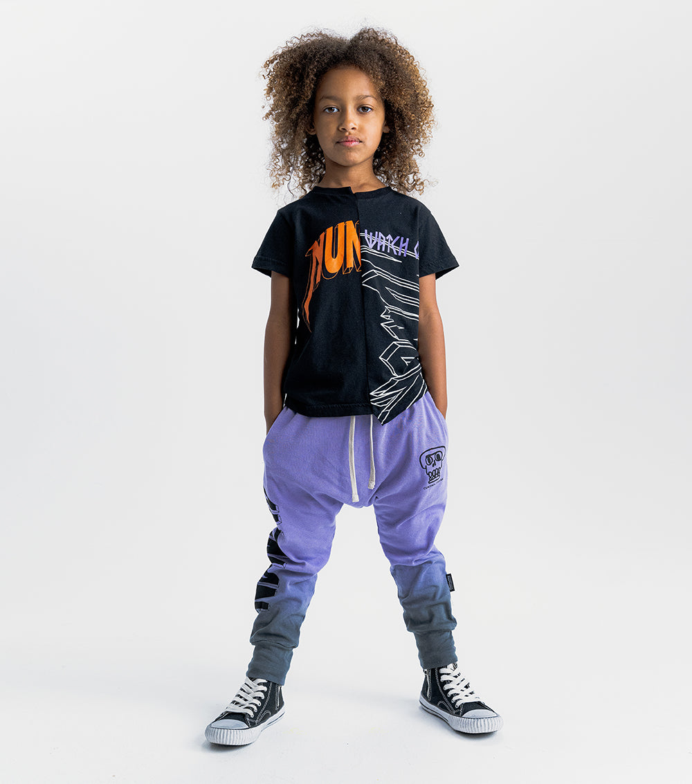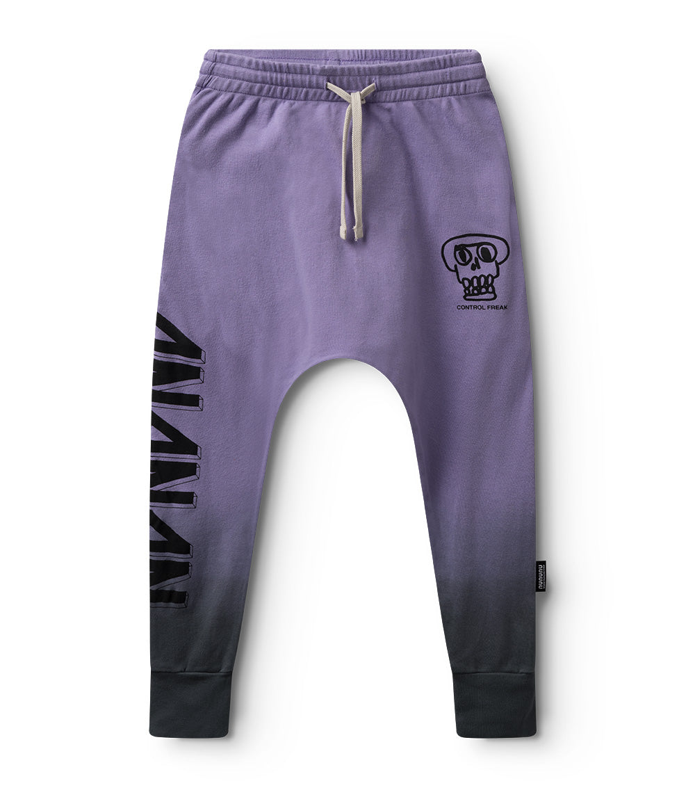 nothing says this kid rules the school like a pair of bold baggy pants. these ones are the perfect example. they’re a mauve mist ombre with total attitude in a universally flattering unisex cut that's as roomy as it is slouchy. they’re made of fine rib so they’re literally so light & easy to wear. plus they’ve got a drawstring waistband, slanted pockets, and a wide lower cuff for full functionality. to amp up the aesthetic they’ve got the nununu rock n roll inspired logo printed in 3d font nice & big on the side. oh yeah and peep the kooky skull up top created in collab with international artist shai id alony with control freak spelled out just below to ward off anyone close enough to read it.