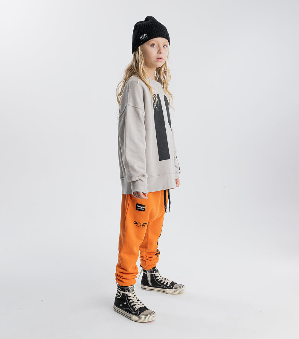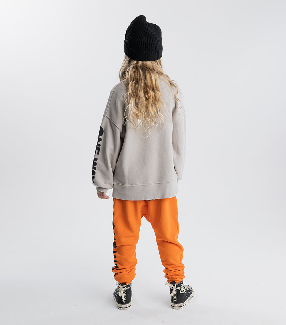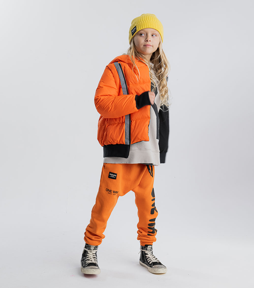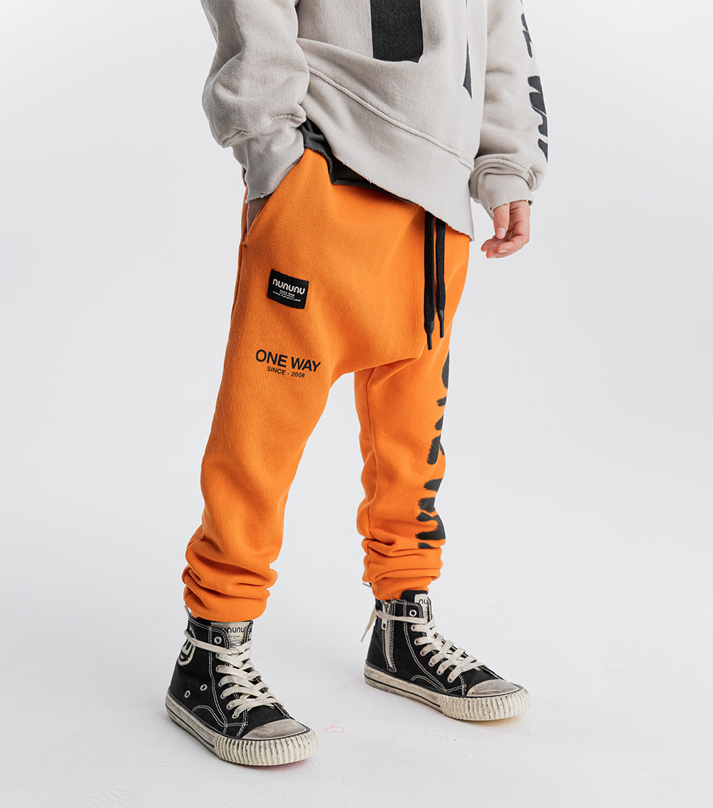 do your kid a solid and get them these way-too-cool orange baggy pants for boys & girls. the one way details with a spray painted and stenciled vibe give off that funky fresh look, just like your kid. the slightly slanted pockets are there for shoving fists inside or hiding candy contraband. when they’re feeling active, a drippy shoelace drawstring, dropped crotch, and jogger-style ankle cuffs make this the perfect fit for pounding that pavement.