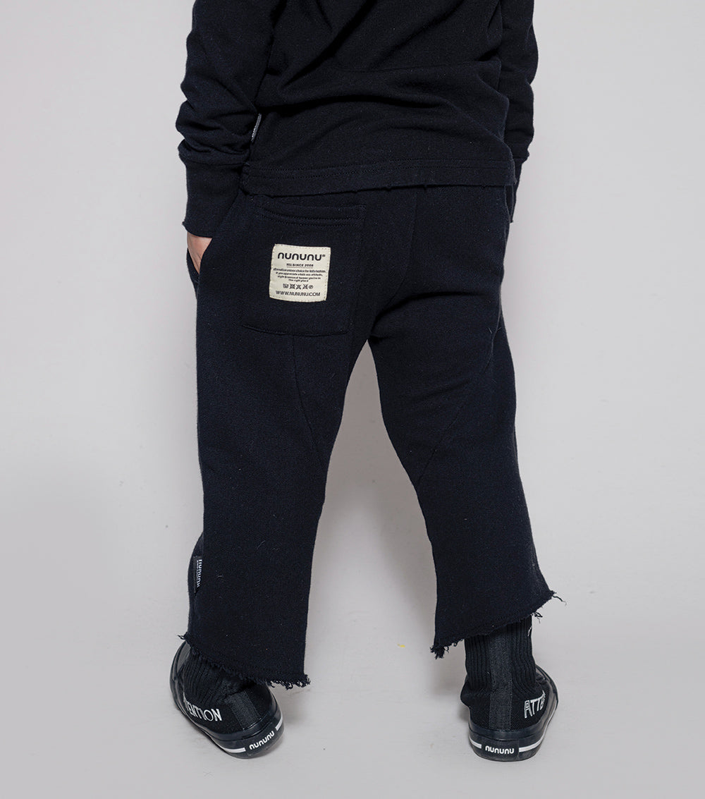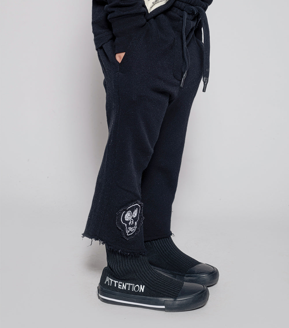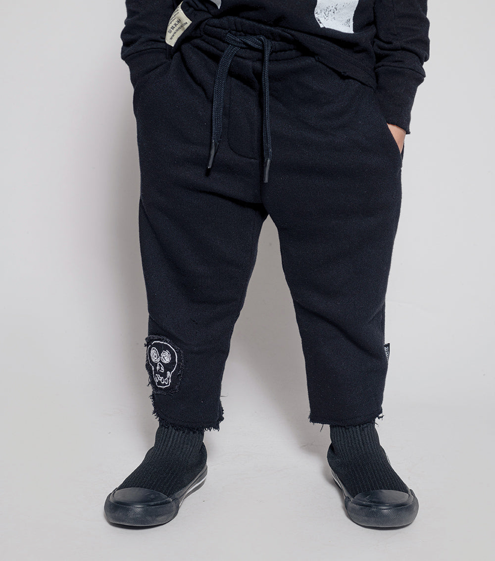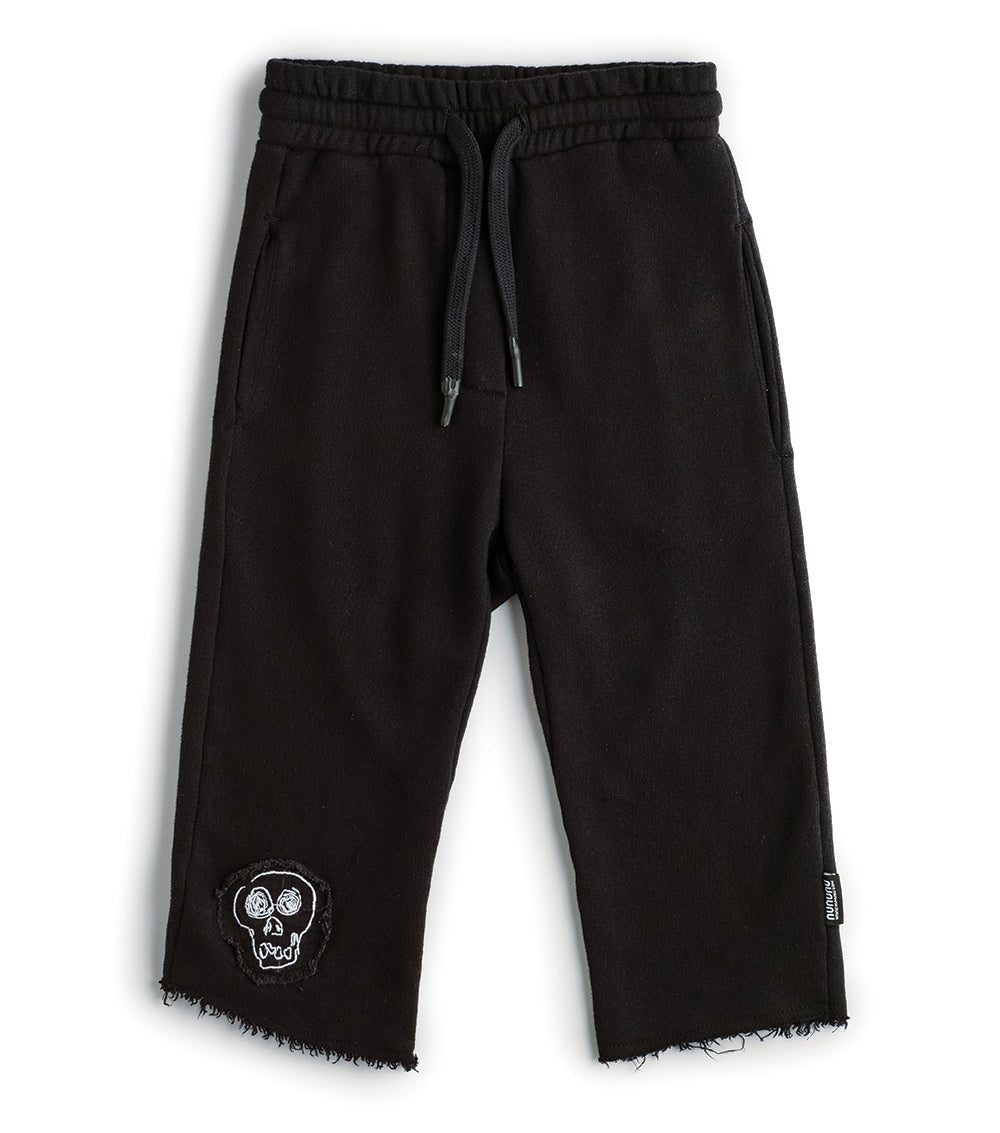 these pants are rough & ready for all the fall fun you can imagine. made of fine french terry in black, they’re relaxed & cool, chopped off at the shin with the ends left raw & ragged. an embroidered skull patch lives at the hem & the waist is nice & comfy with elastic & a handy drawstring. oh, and the care tag is on the butt pocket because we don’t do things like everyone else.