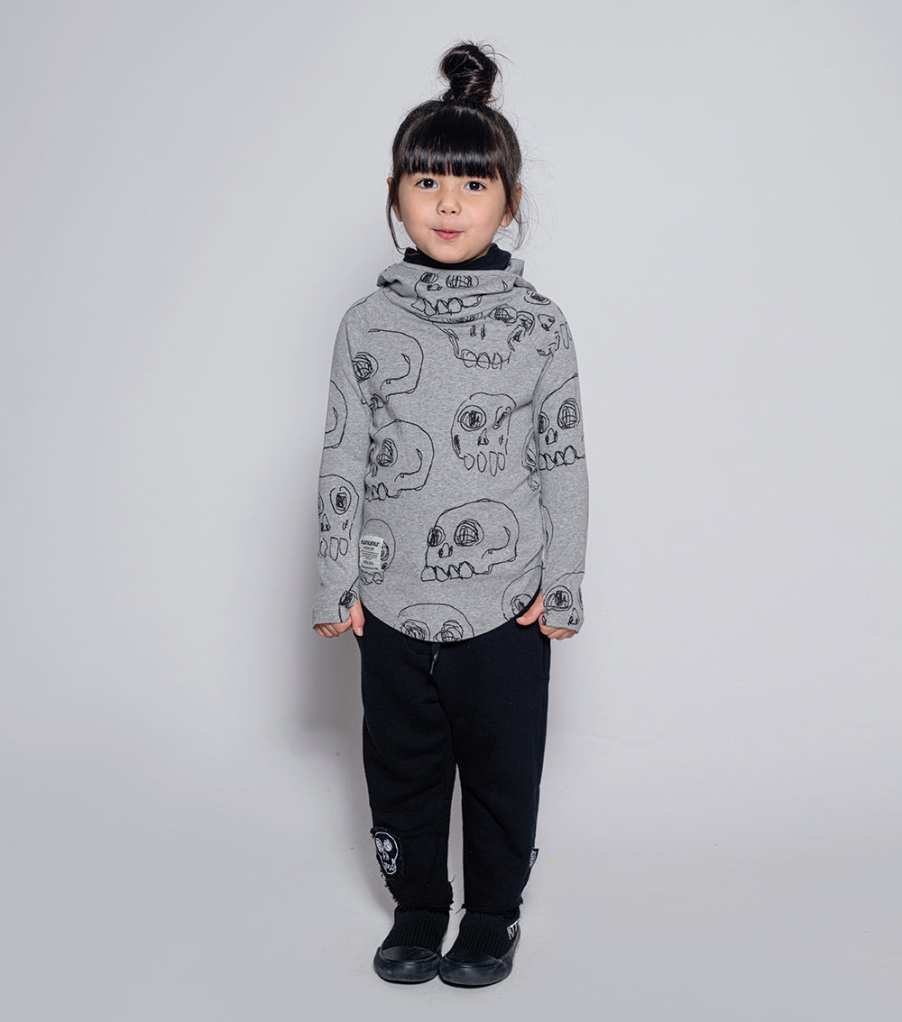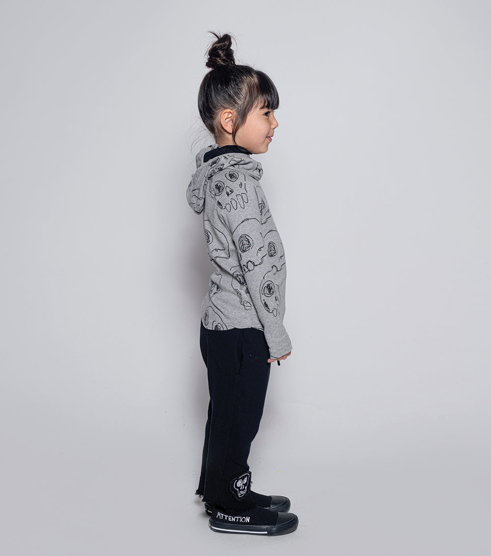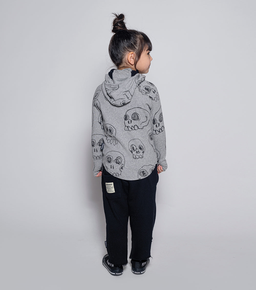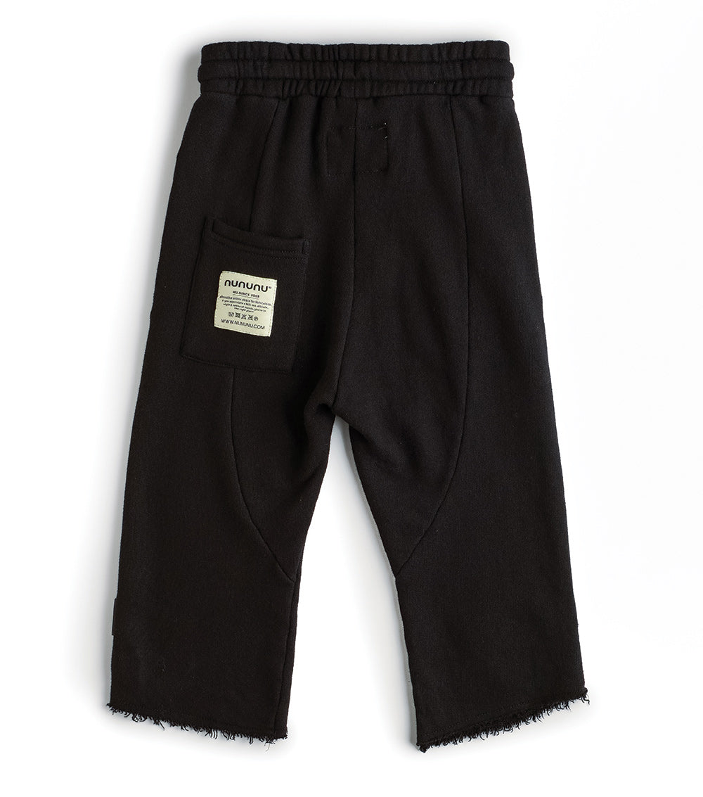 these pants are rough & ready for all the fall fun you can imagine. made of fine french terry in black, they’re relaxed & cool, chopped off at the shin with the ends left raw & ragged. an embroidered skull patch lives at the hem & the waist is nice & comfy with elastic & a handy drawstring. oh, and the care tag is on the butt pocket because we don’t do things like everyone else.