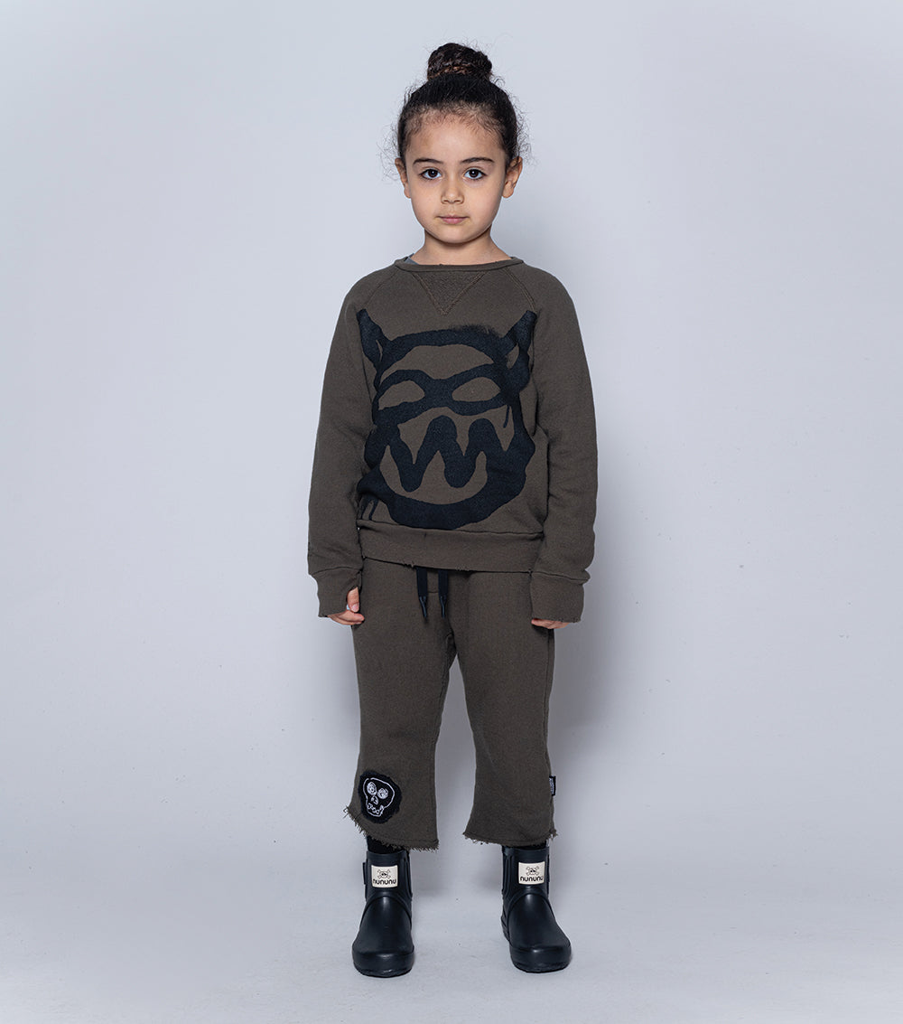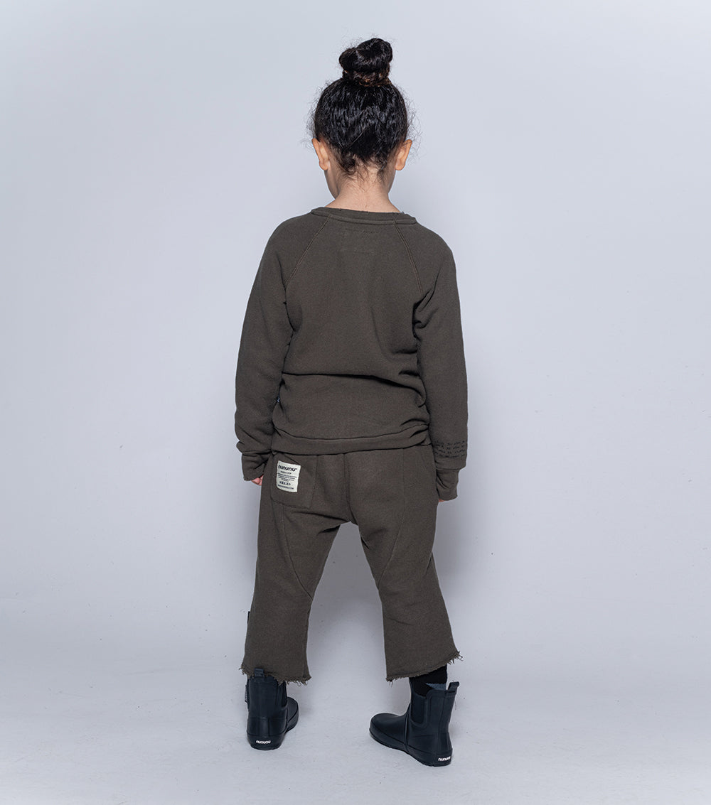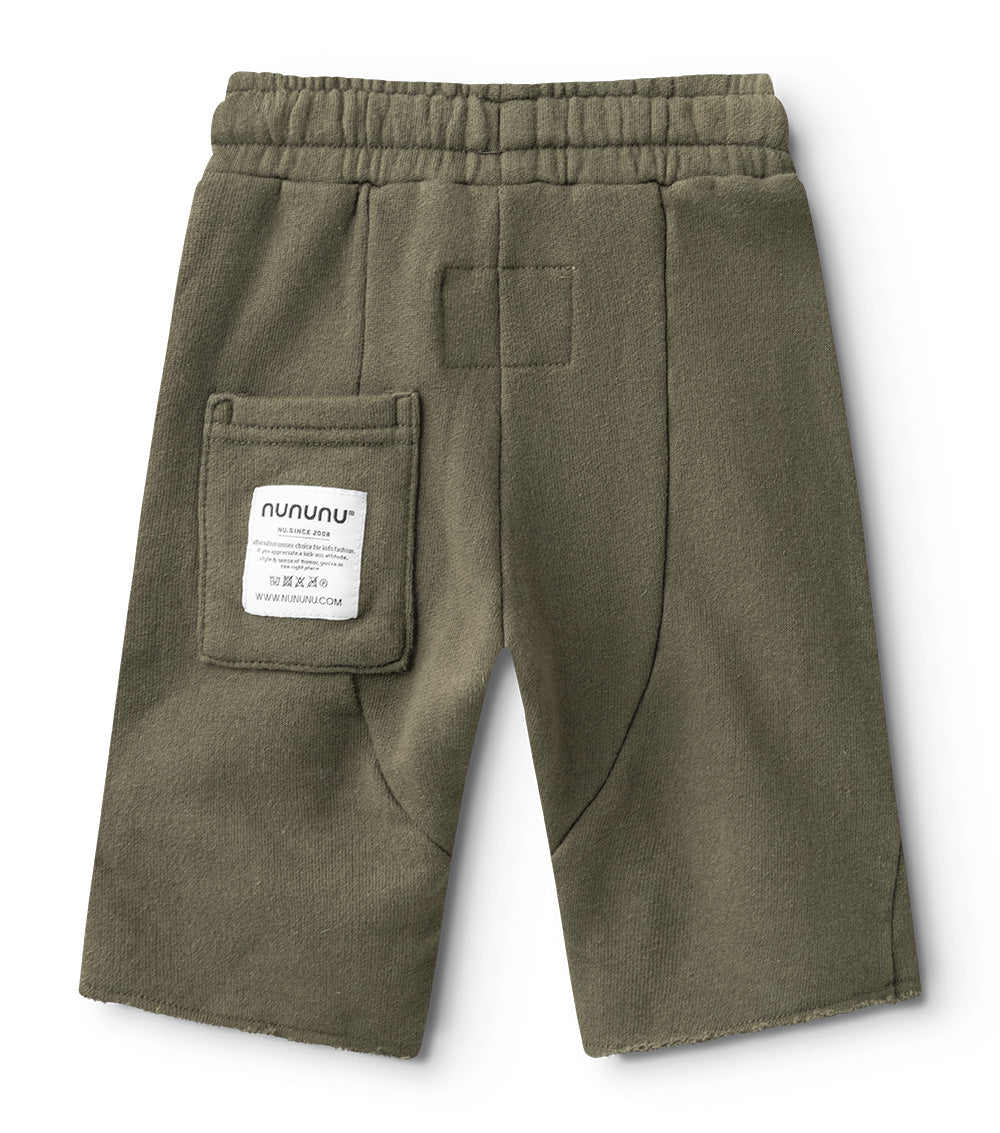 these pants are rough & ready for all the fall fun you can imagine. made of fine french terry in olive, they’re relaxed & cool, chopped off at the shin with the ends left raw & ragged. an embroidered skull patch lives at the hem & the waist is nice & comfy with elastic & a handy drawstring. oh, and the care tag is on the butt pocket because we don’t do things like everyone else.