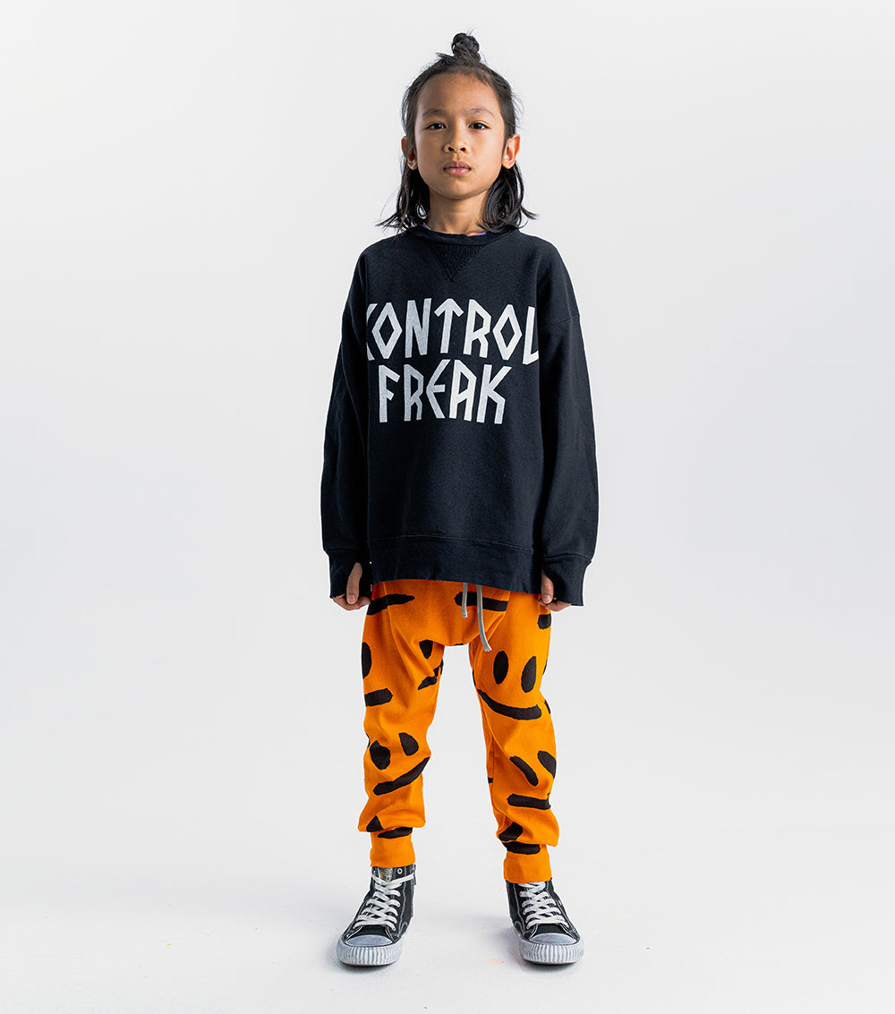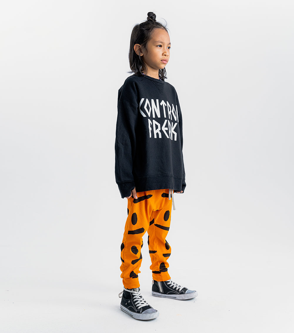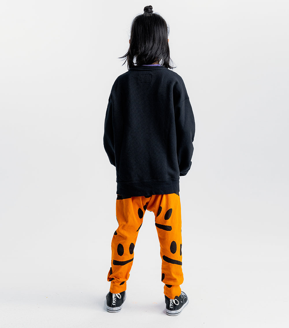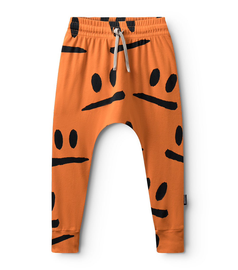 get ready for a full-on smirk-a-thon hosted by the boy or girl that wears these super cool orange sun baggy pants. they’re light & easy to wear with a drawstring waistband, slanted pockets, and a wide lower cuff. the pants are roomy & slouchy, giving legs the freedom they need to run, play & perhaps even sit still at times. the all over smirk print is ideal for kids that are lovers of mischief and want to take their trouble-making game up a couple of notches.