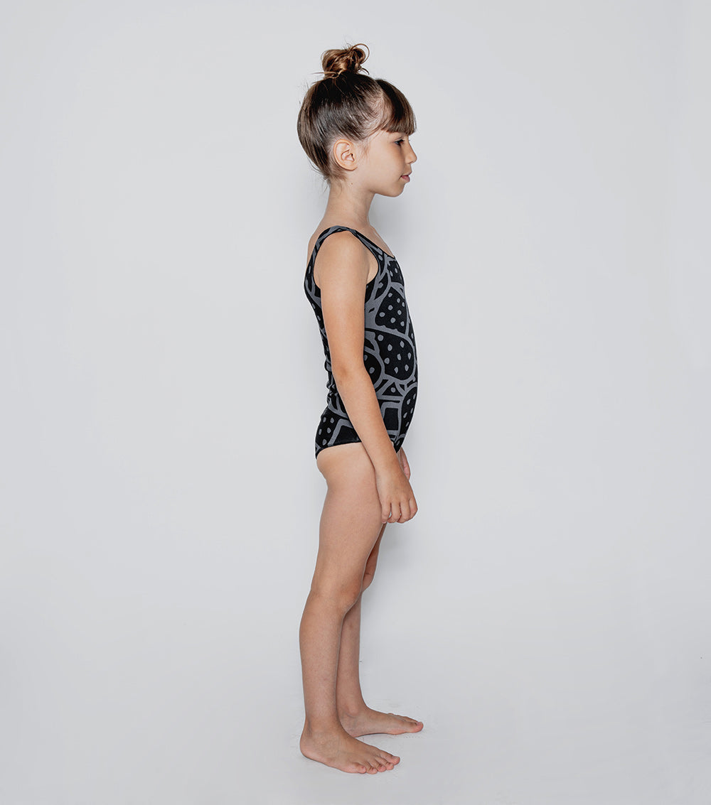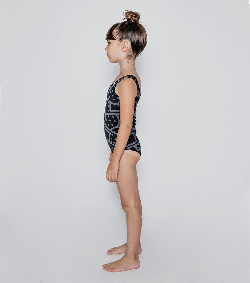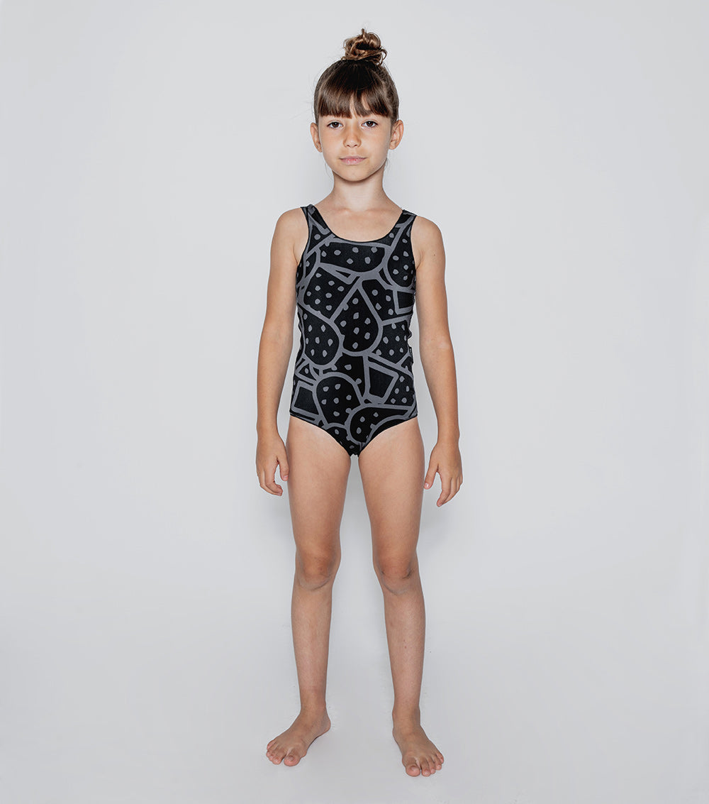 dede is an urban-style artist whose bandaid graffiti appears all over the world, sometimes in the unlikeliest places. now add to those a girls’ swimsuit. this black tank suit takes the iconic design & makes it totally wearable. the print is wild, but the grey color is neutral & the cut stays classic, making this a minimalist poolside staple with a super cool, artistic vibe.
