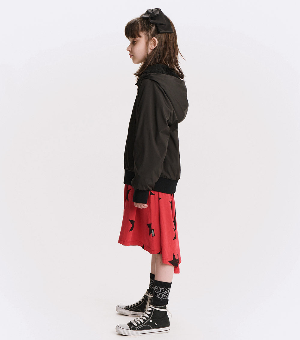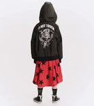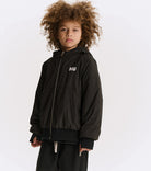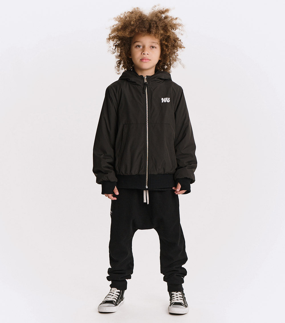 don’t let the name fool you. this fit is anything but basic. it’s a gender neutral black jacket with a light nylon layer on top for a clean, cool look. the inside features a full sherpa lining from hips to hood for next-level warmth & coziness. plus, it’s got oversized kangaroo pockets, ribbed cuffs with thumbholes, and a full front zip making it extra wearable. nu is printed on the chest in white to up the cool factor. but the real story’s on the back. a fearless feline is breaking free from captivity with the power of love. comfort & rebellion unite in one perfect package. just like your kid.