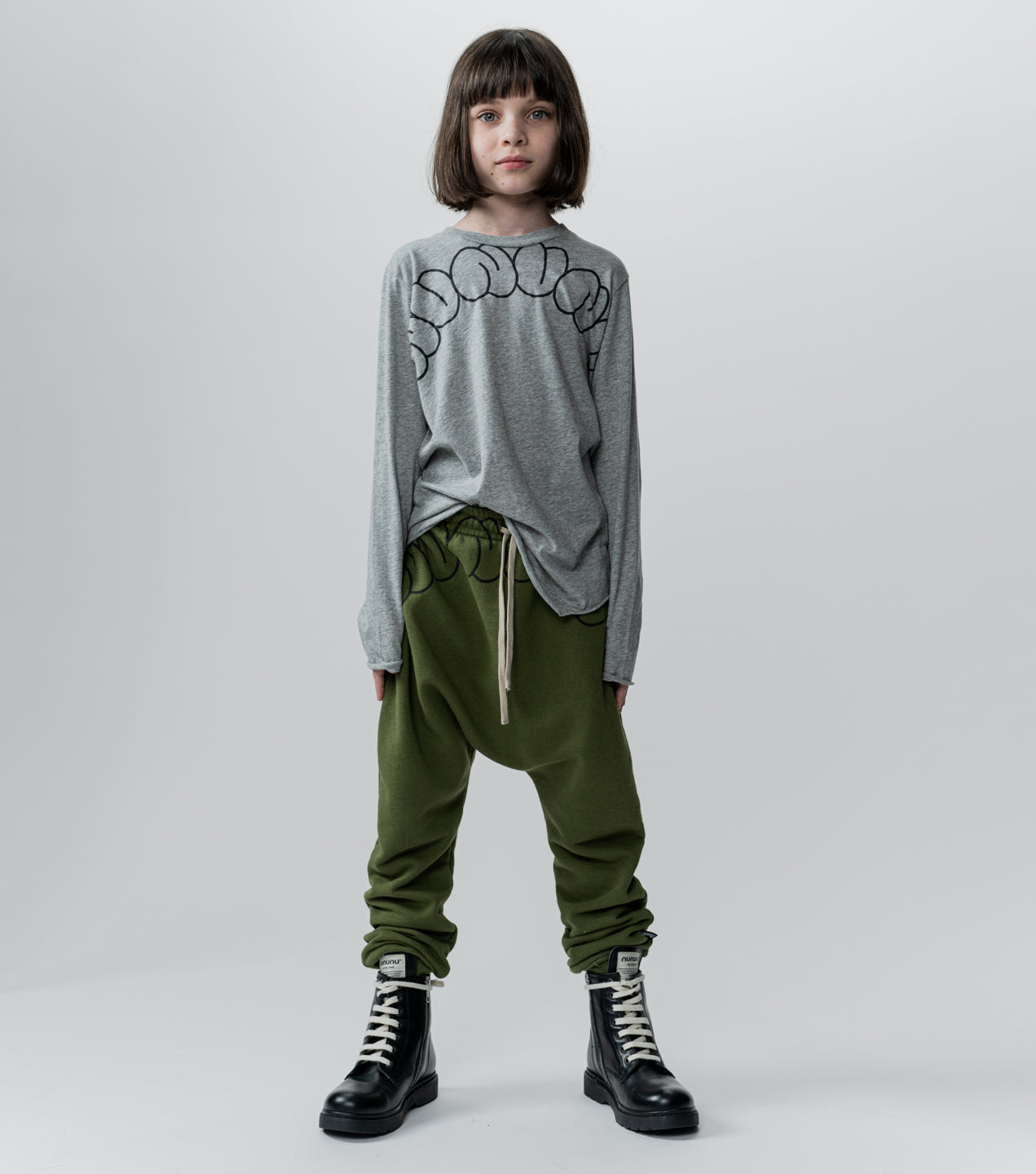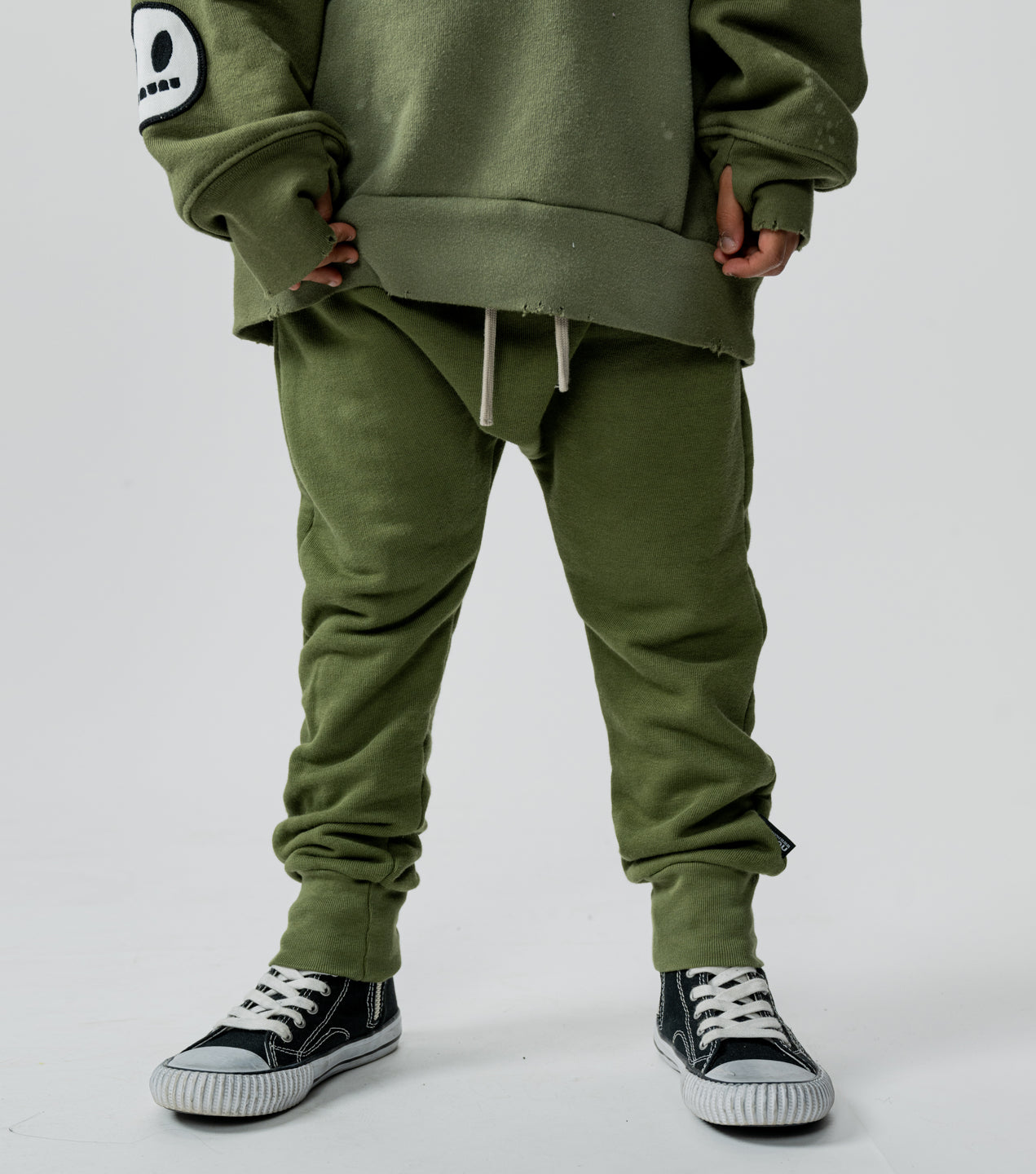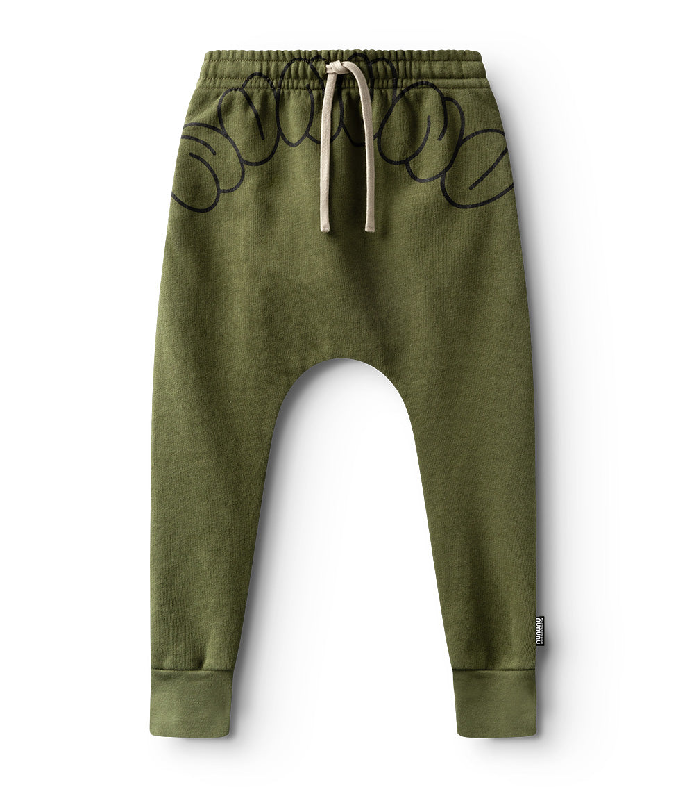 your all time fave baggy cut now has a big bubbly nununu logo right on the front in letters that look like balloon animals about to pop. this gender-neutral look has got a super comfy stretchy waistband and is made of extra soft olive french terry that kids will want to wear on the daily. plus, a drawstring & dropped crotch give that nice roomy feel while still looking like they wrote the book on kids’ style. of course, the fit is complete with two hidden slanted side pockets for stashing love notes from their countless crushes.