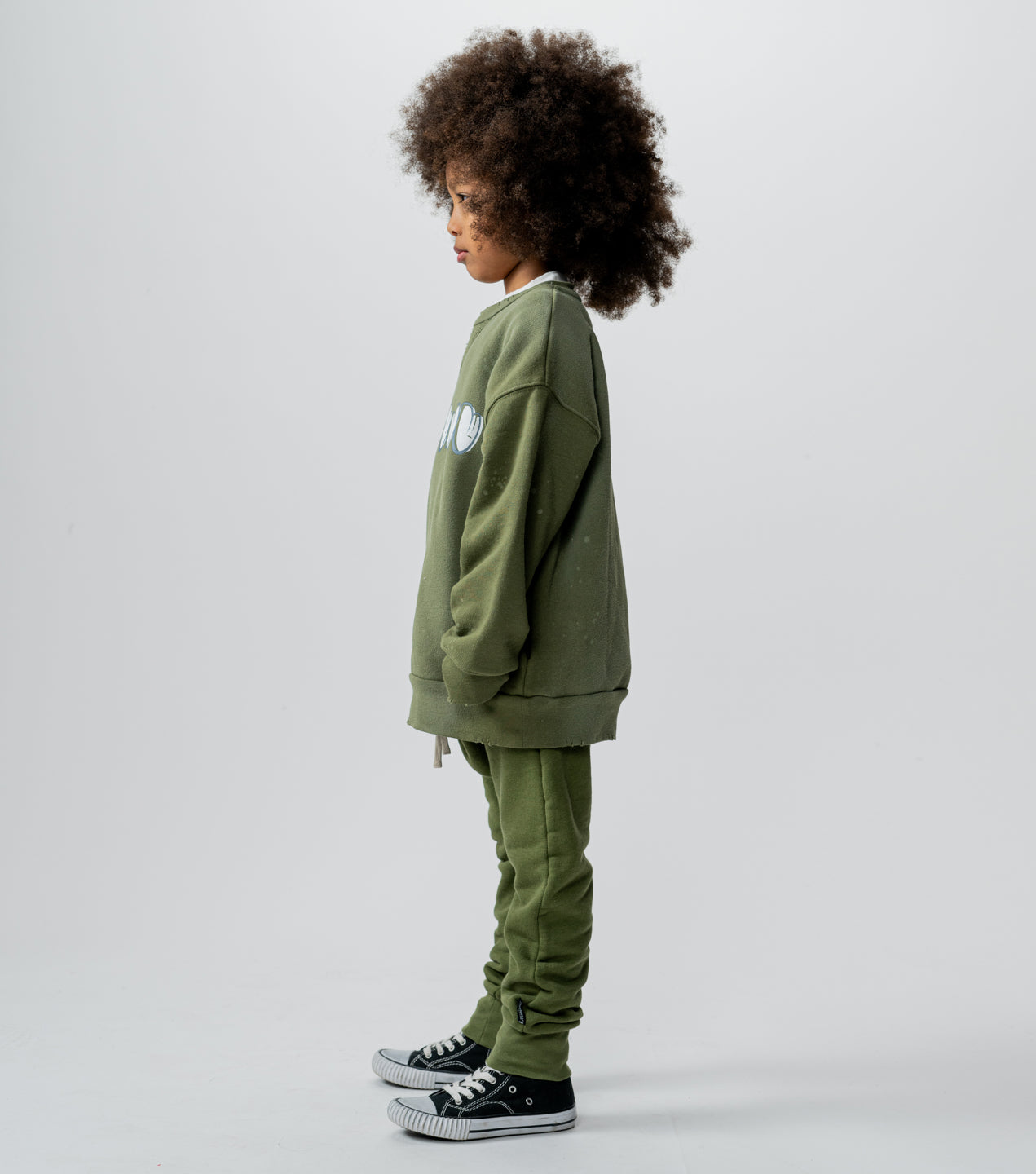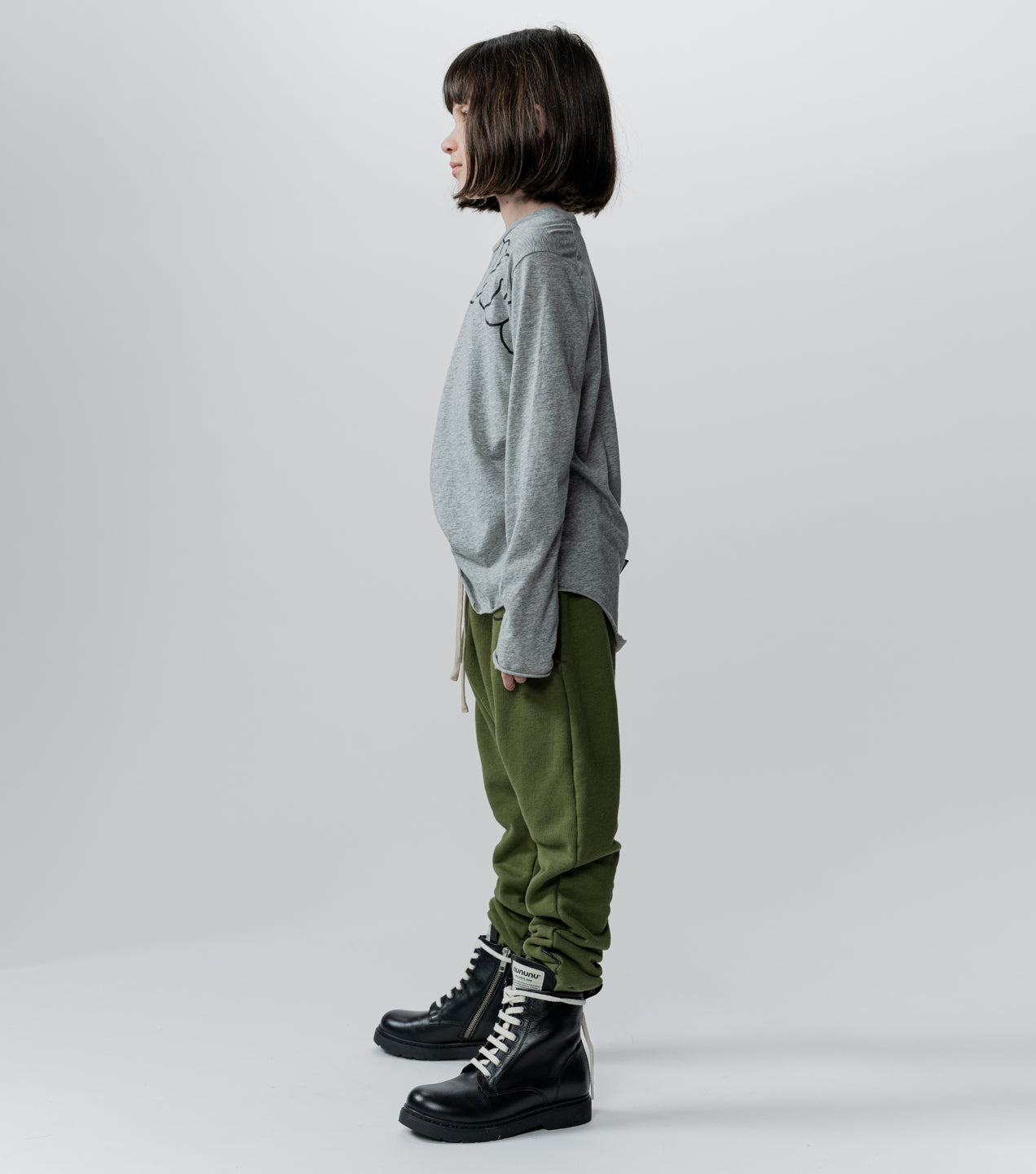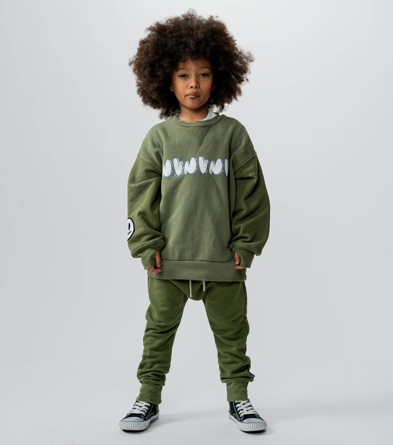 your all time fave baggy cut now has a big bubbly nununu logo right on the front in letters that look like balloon animals about to pop. this gender-neutral look has got a super comfy stretchy waistband and is made of extra soft olive french terry that kids will want to wear on the daily. plus, a drawstring & dropped crotch give that nice roomy feel while still looking like they wrote the book on kids’ style. of course, the fit is complete with two hidden slanted side pockets for stashing love notes from their countless crushes.