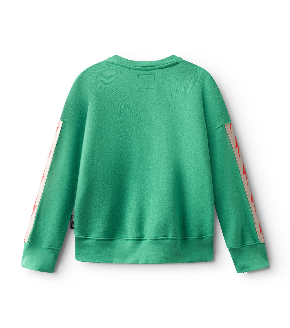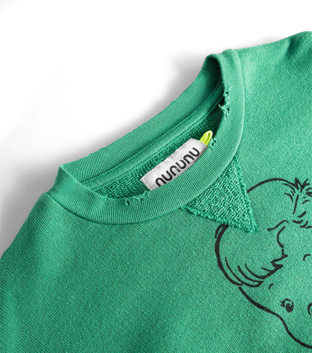 who knew a sweatshirt could silently scream the concept of world takeover and somehow still do it in a positive way? well this global kid print manages to do it all. it’s a classic nununu gender neutral sweatshirt in a super cool moss green color. a kid holds the world right on the front and right underneath it says one way in a street inspired font. because the kid wearing this piece clearly has no fear of revealing their master plan. to crank up the bold factor, grey ribbon details run up each side of the sleeves with little red lightning bolts warning of an impending strike. to edge it up even more there’s a bit of a higher hemline on the front, plus it has custom deconstruction all around. and of course, cool kid thumbholes. made of the coziest french terry, it’s the perfect look for acting innocent while making trouble.