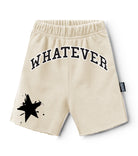 let’s hear it for a silent scream of your kid’s favorite word "whatever" raging across the front in an arch of collegiate-inspired letters on these sweat shorts. the whatever vibes are perfectly matched by the rest of this natural-colored fit. first off, the french terry is so soft there’s nothing to care about. second, the stretchy waistband is too comfy to worry about a thing. plus, the side pockets keep their favorite things close and the good vibes closer and the star splattered on the leg just makes it all the nununu way.