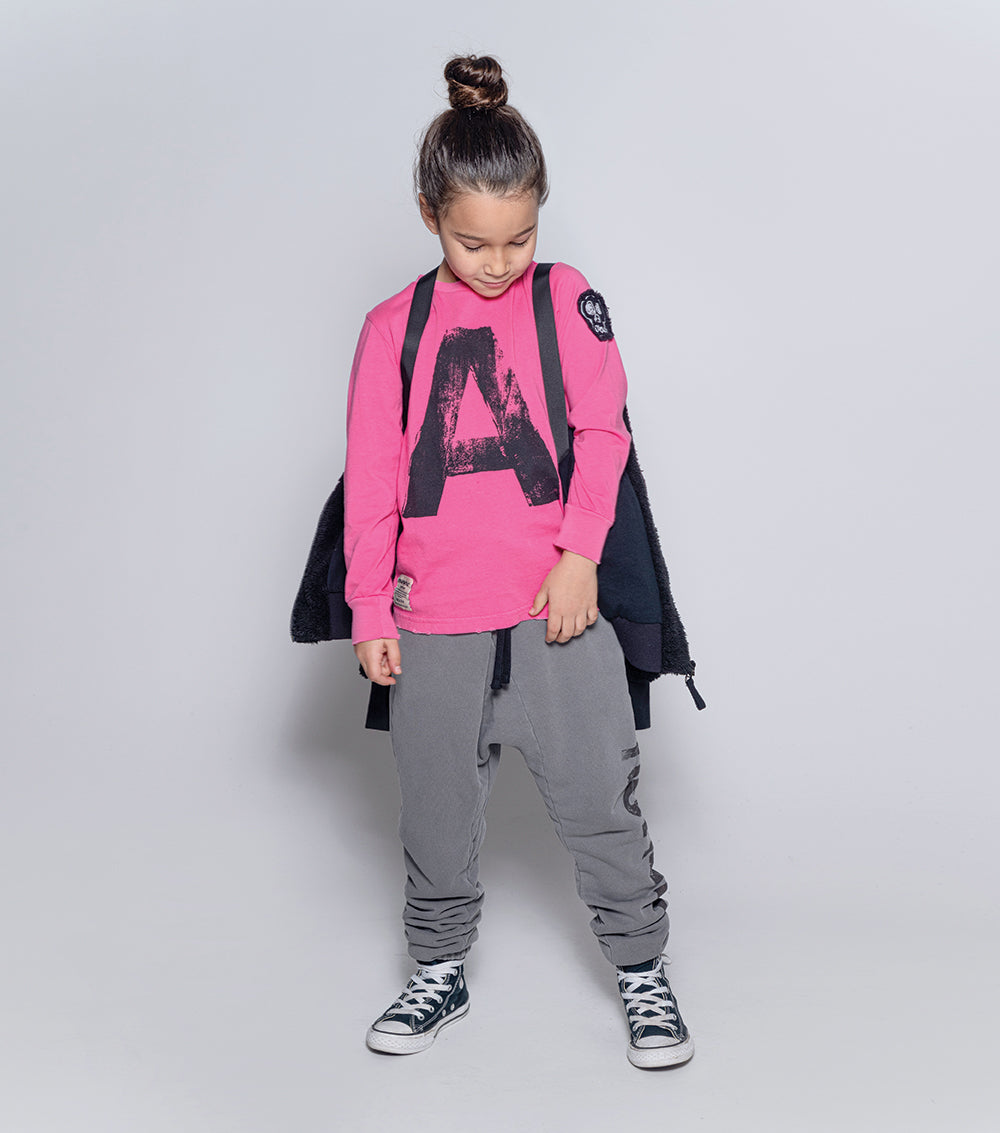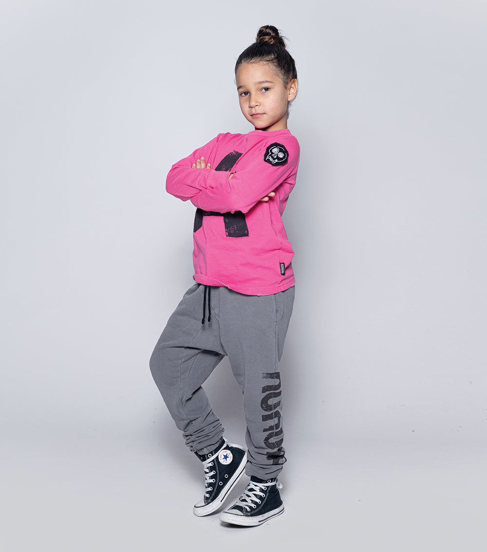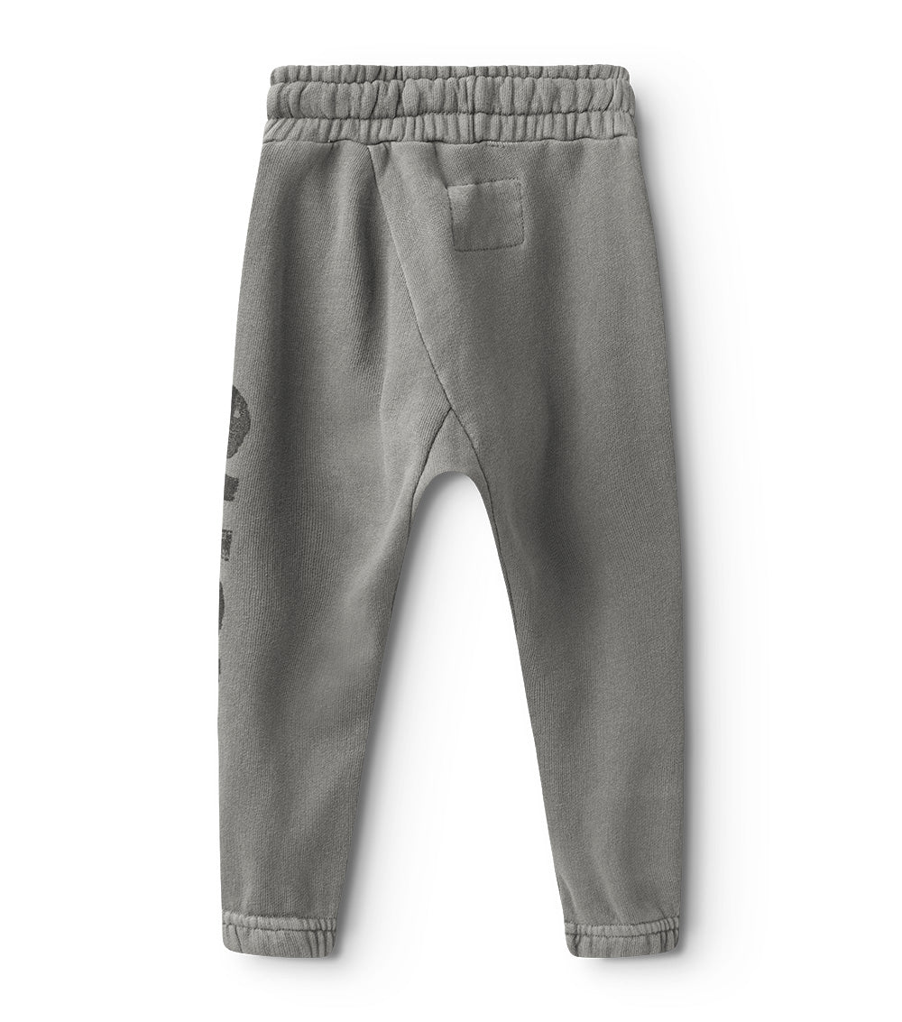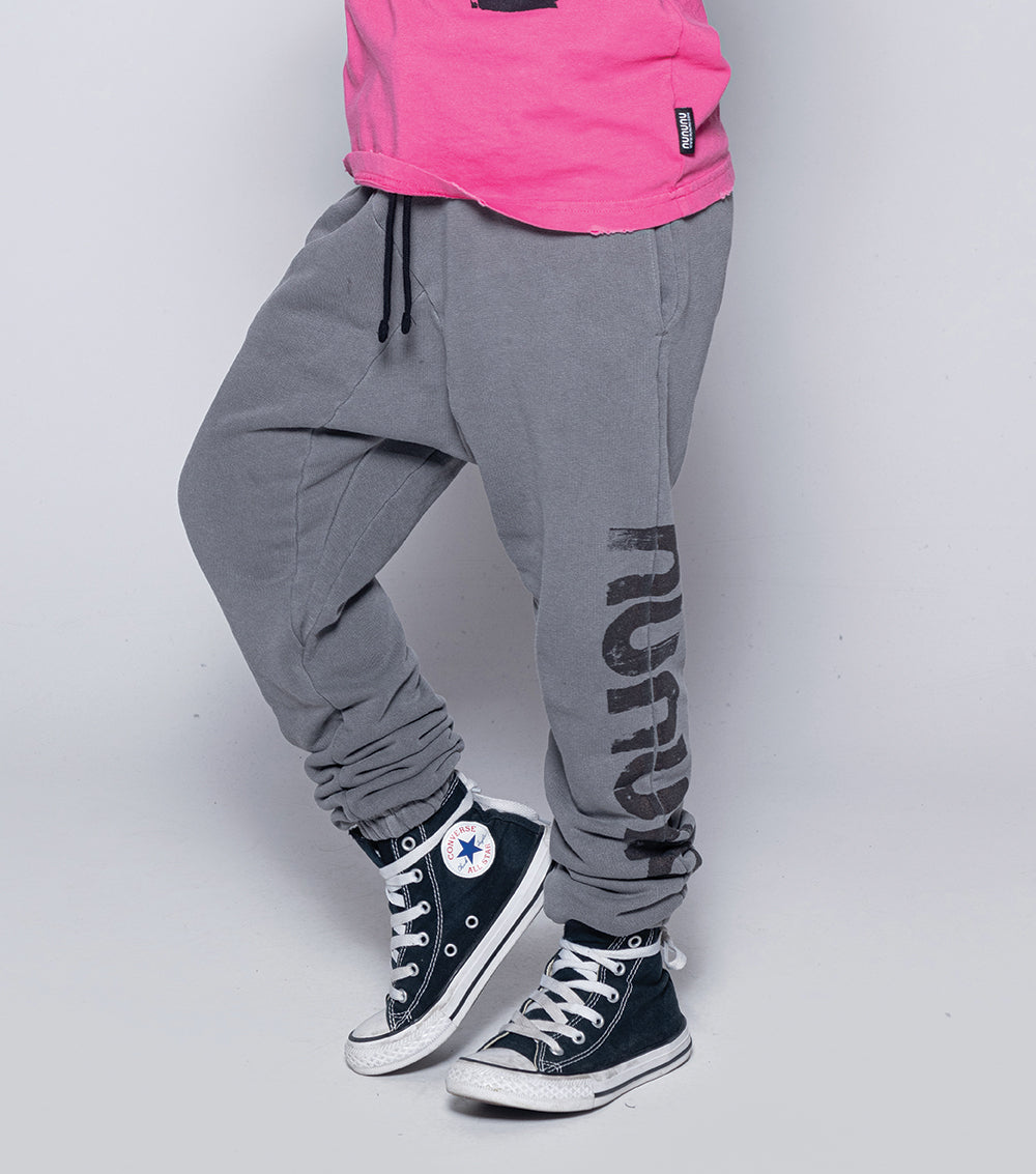 diagonal seams & raw color give these dyed grey sweatpants the kind of laid back coolness that is normally hard to achieve. these, you just slip on & tie at the elastic drawstring waist. elastic cuffs keep the look tight & our logo runs down one leg in this newsprint effect we’re loving lately. the care tag lives on the outside of the cuff, because we don’t do things like everyone else.