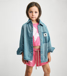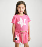 your gym class superstar finally found her perfect fit. these shorts. they’re made of hot pink french terry that's soft enough to actually get them up in time to be fashionably late for the morning school bell. the bottom hems have trim that’s a little rounded, coming up & overlapping a bit on the sides like classic retro gym shorts. of course, pockets are there for stashing notes passed in class and our splattered high voltage star is printed right across the front, so everyone knows who the real star is.