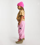 for the kid that loves a good charge up to max energy, we’ve got your new favorite fit. The perfect sweatpants made of super soft and super pink french terry with side pockets, cinched elastic cuffs & a drawstring waistband. it’s got a faded wash through the legs and our new fave print, our star with a lightning bolt running through it in hot pink to spike it up a bit!