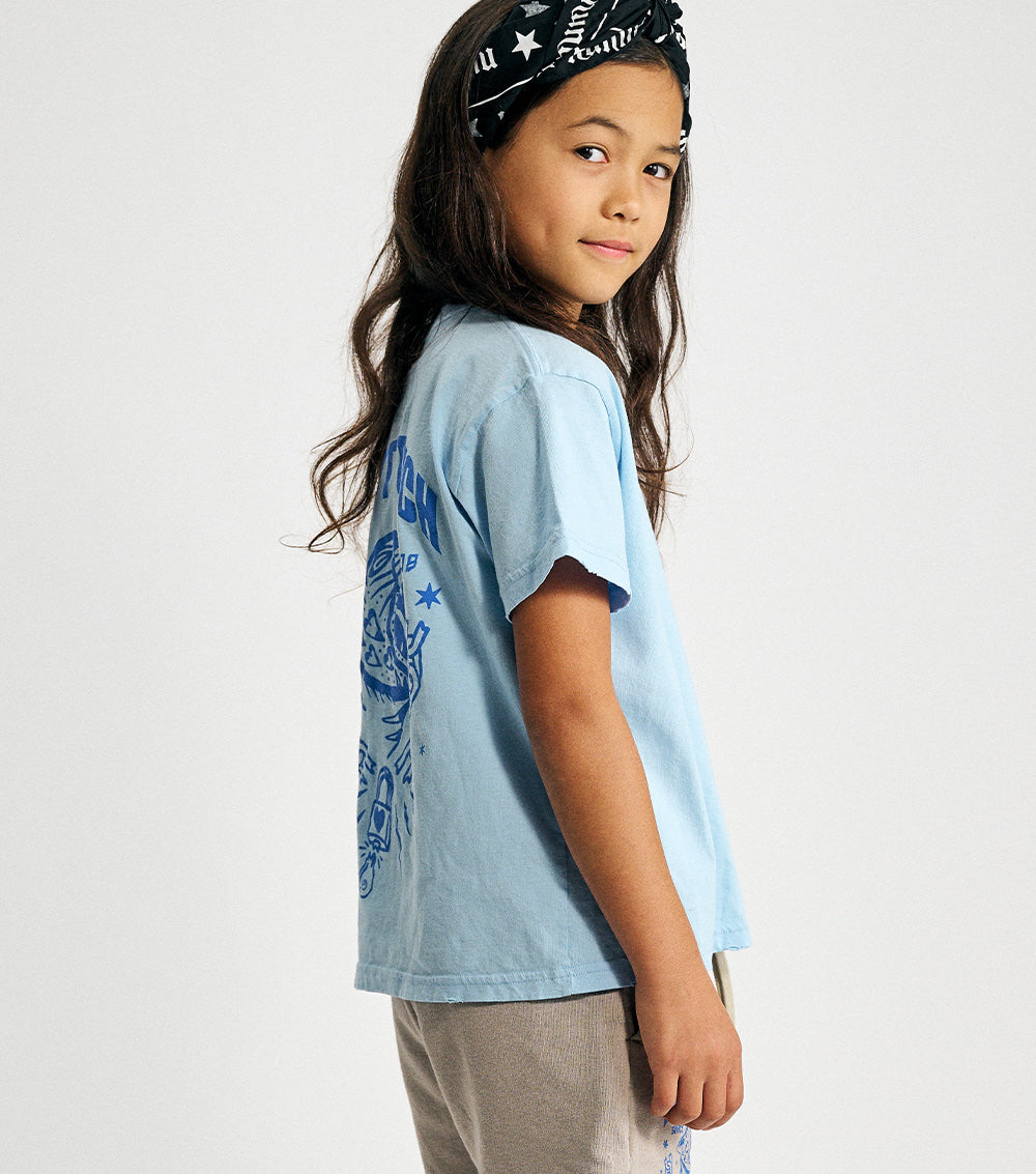 some kids purr, a nununu kid roars. a fact that’s written loud & clear on the back of this foggy blue cotton t-shirt. it’s the perfect cut with custom deconstruction details and a whole lot of don’t-mess-with-me energy courtesy of the words do not touch written in an arch above a fierce tiger breaking through chains with nothing but the power of love. kinda like your kid with unrealistic expectations, like “sit still” or “behave.” of course, the print on the back is striking blue just so no one misses out.