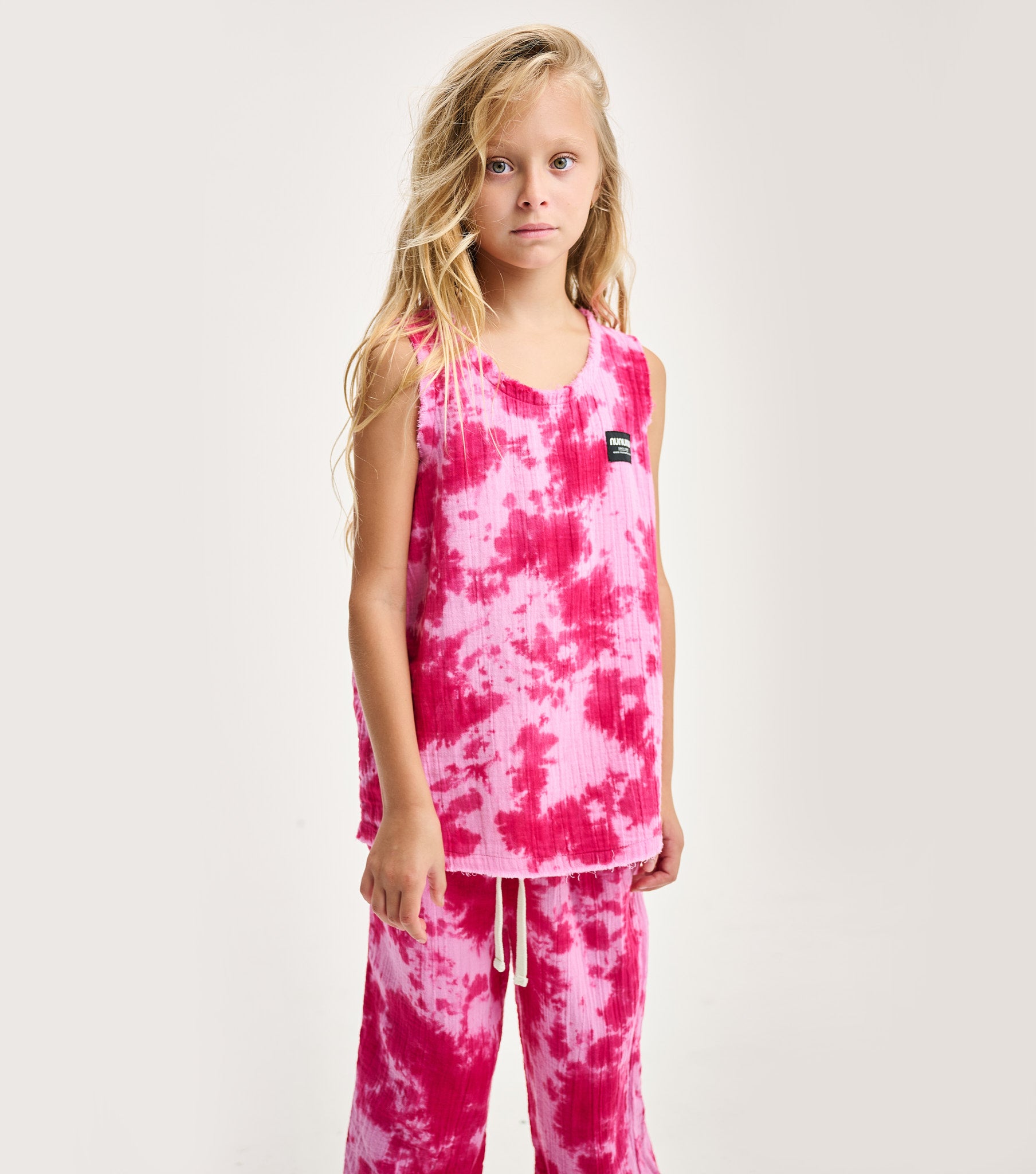 nothing says summer like a breezy tank made of fabric that feels barely there, even on the hottest of days. this one’s a gender-neutral fit in hot pink muslin with a totally chill tie dye effect. it’s got a round neck & frayed edges all around to give it full on island vibes. yeah, it’s so relaxed all they’ll want to do is sip strawberry slushies on the sand. of course, the tag rides right up front in contrasting black so you don’t have to constantly tell people where you got it.