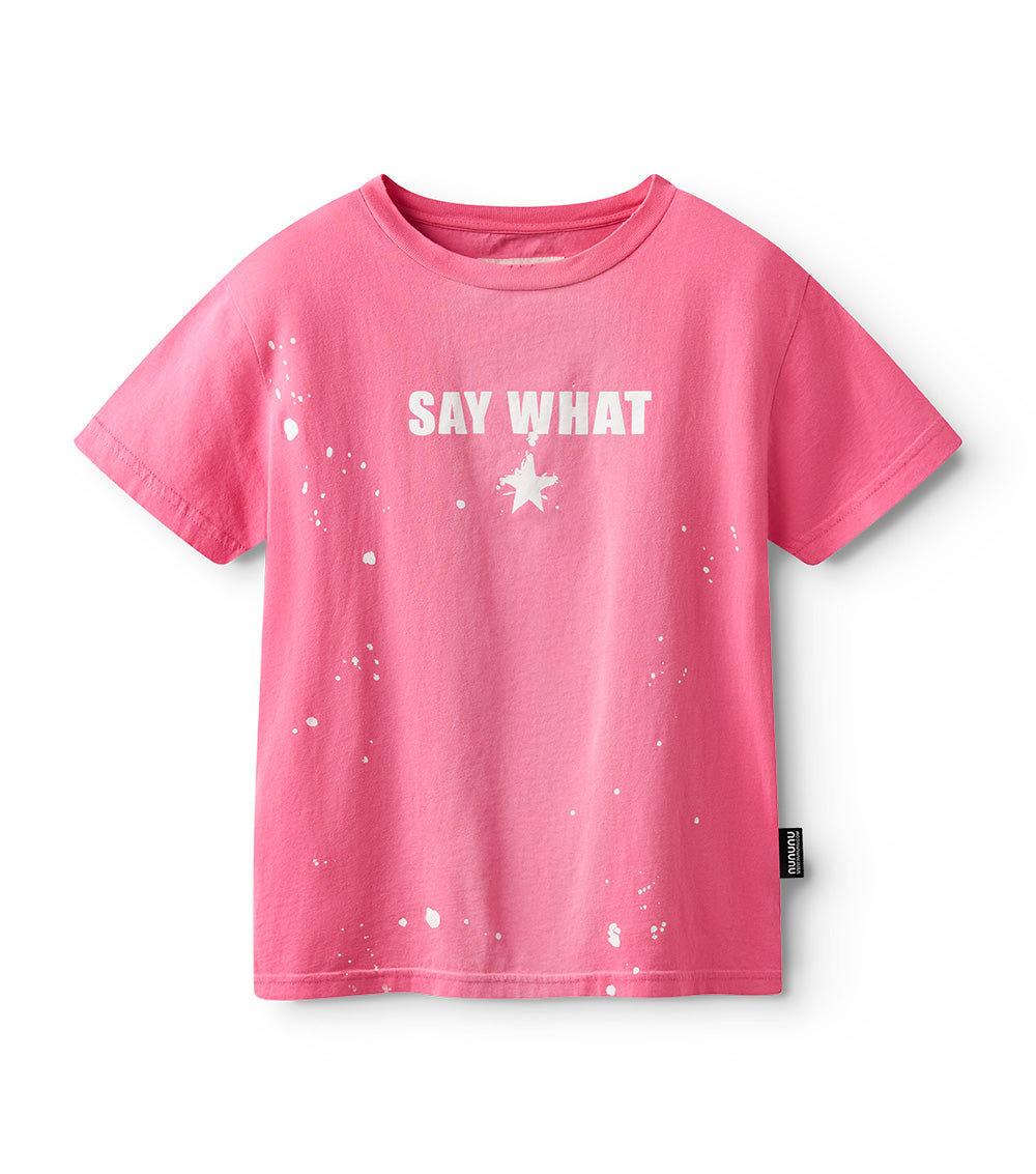 if your kid is always adding some drama when it's time to finish their chores, this tee is a total representation of them. it’s made of comfy hot pink single cotton in a gender neutral cut with say what printed in capital letters on the chest. because every time they’re told what to do they’re sure to act surprised. of course, that's why we’ve got a splatted star right underneath. to remind adults how this kid is going to look as soon as they’ve finished their to-do list.