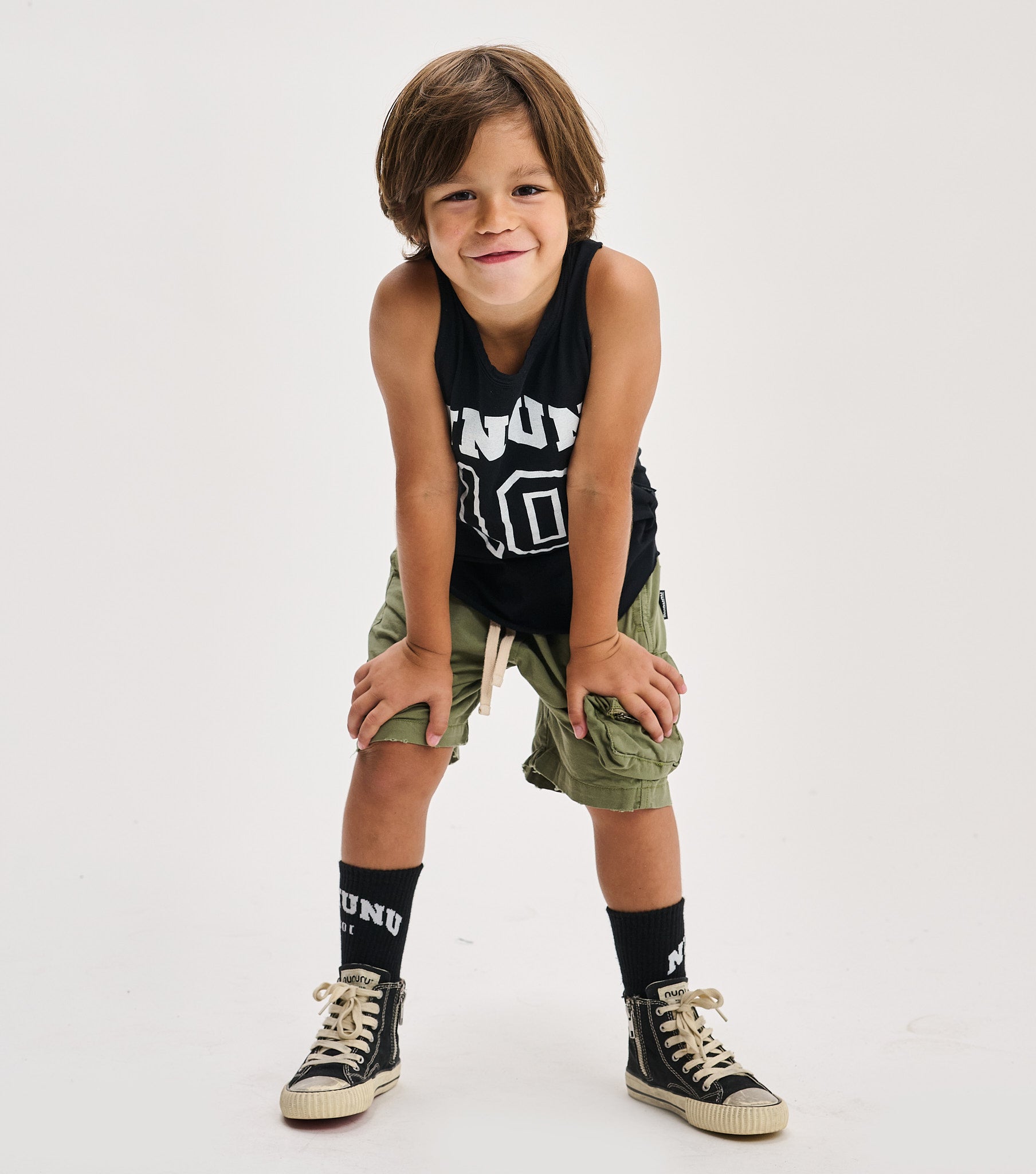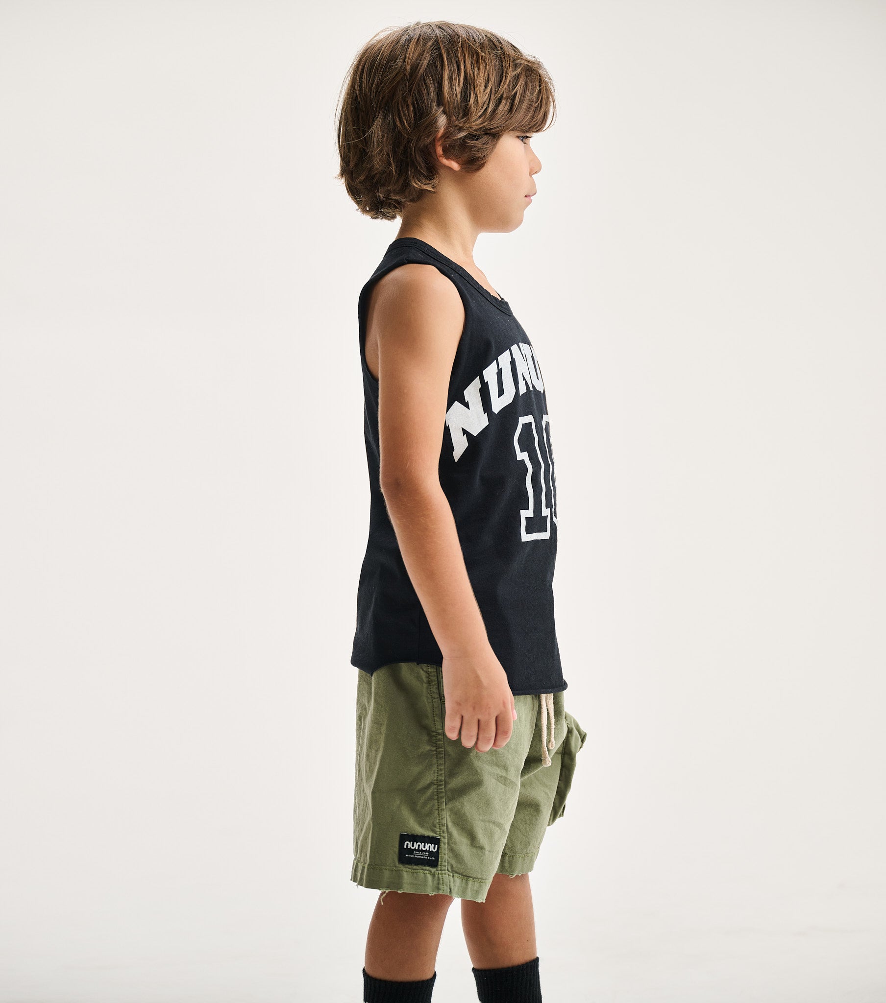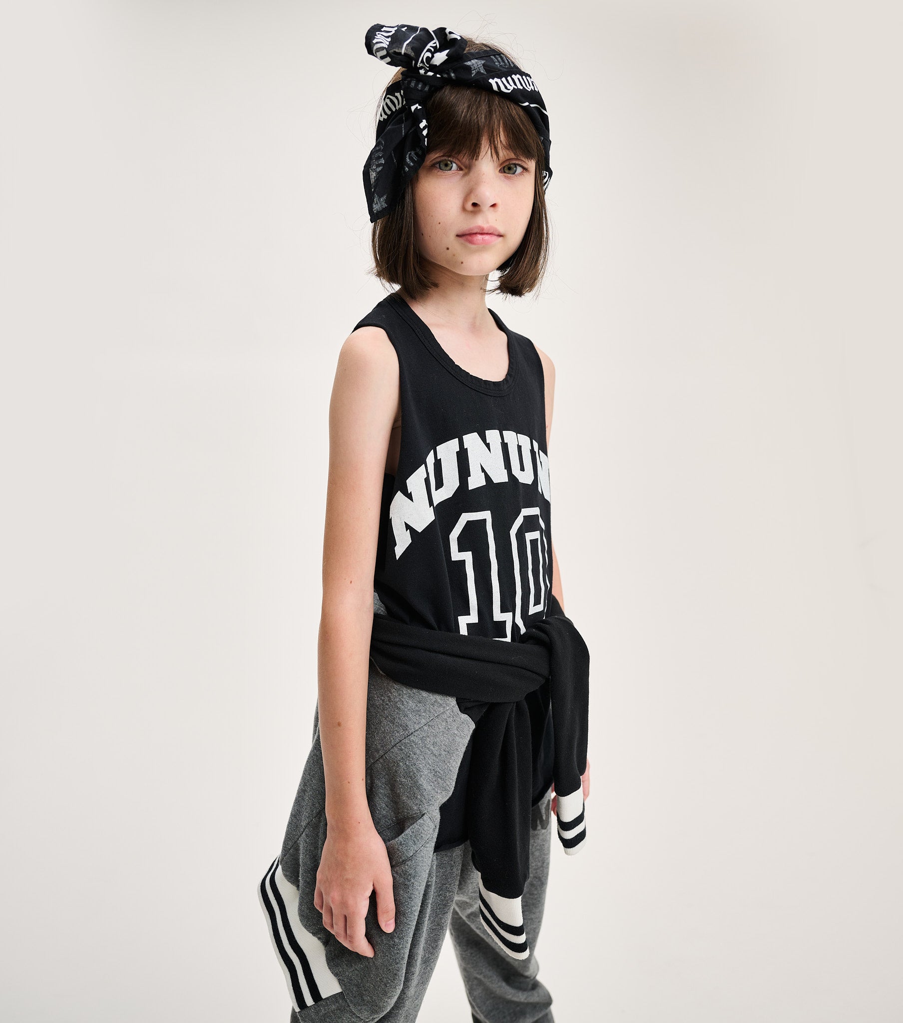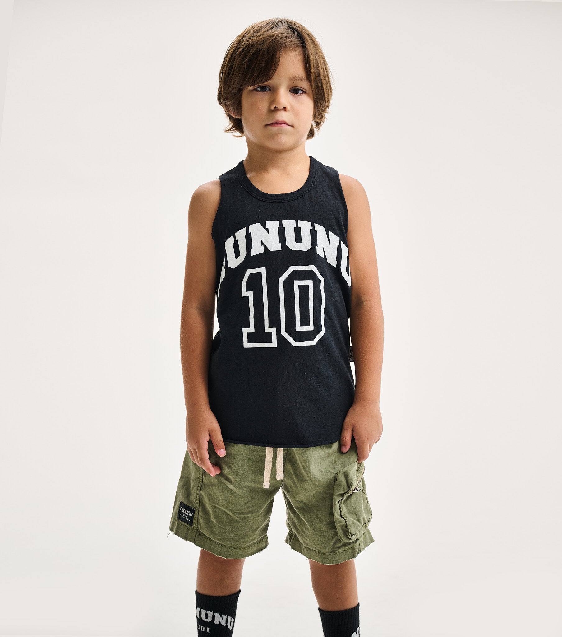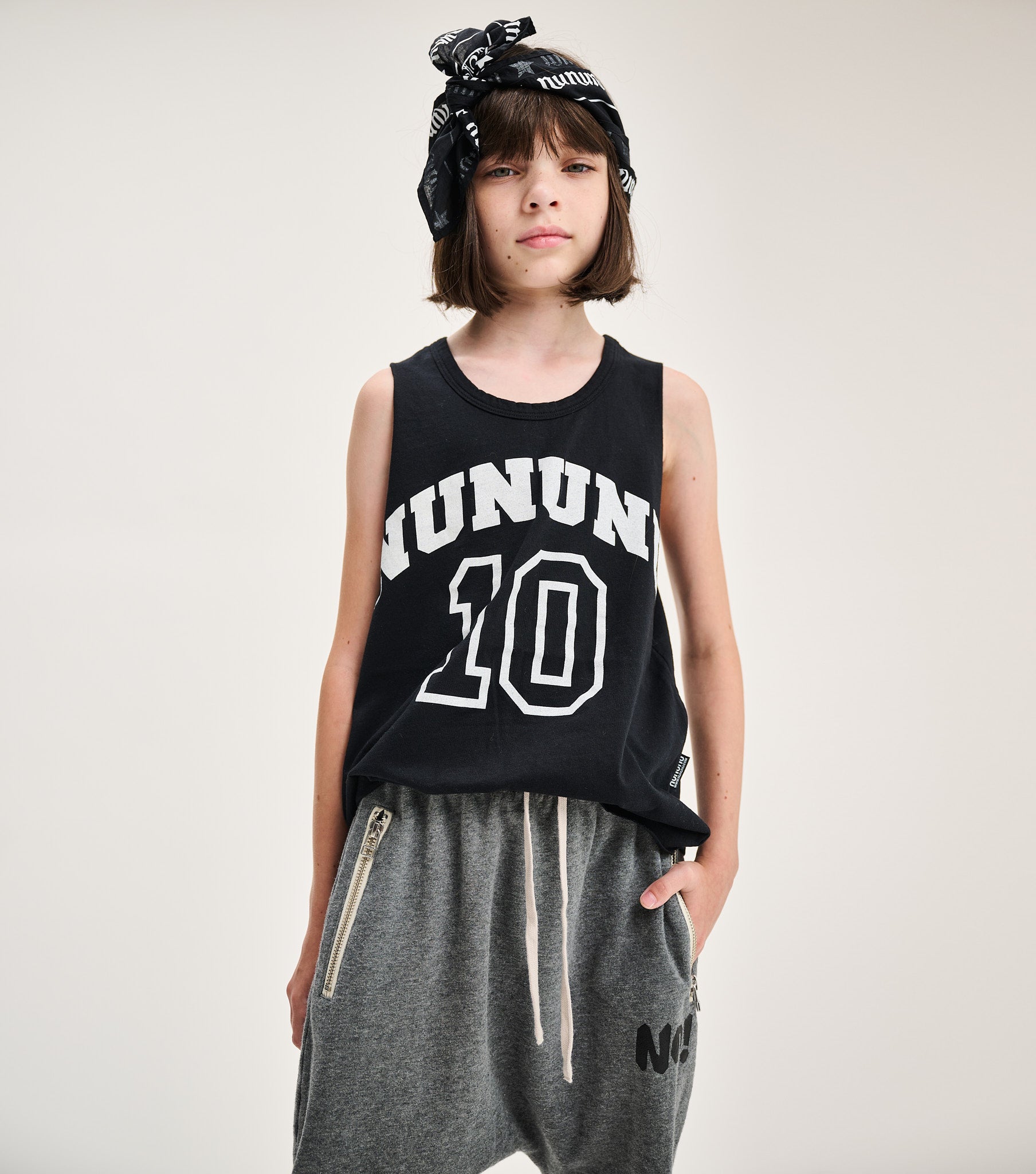 team nununu just held tryouts and of course your kid made the team. that’s why we’ve got a super cool tank ready for them. it’s a gender neutral cut made of black single cotton with raw hems where the sleeves would be, plus a raw & rounded bottom hem. it says nununu in white in a font that screams mvp and 10 is printed huge underneath like an outline because that’s their number and pretty much always their score. as long as the game they’re playing is out of 10.