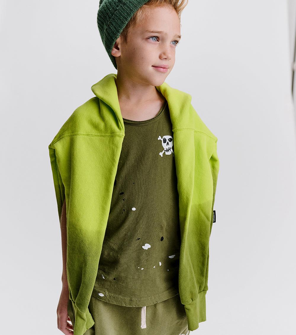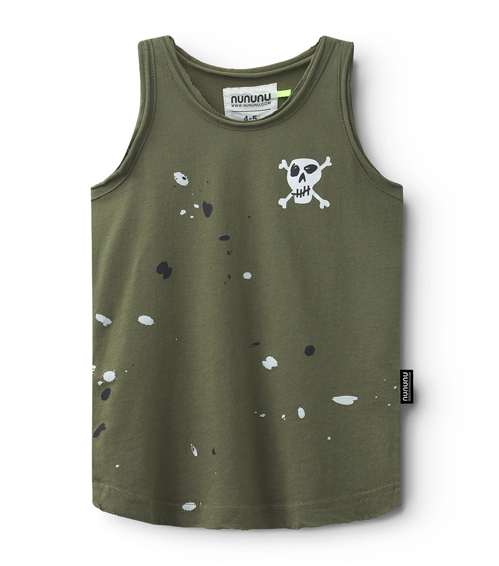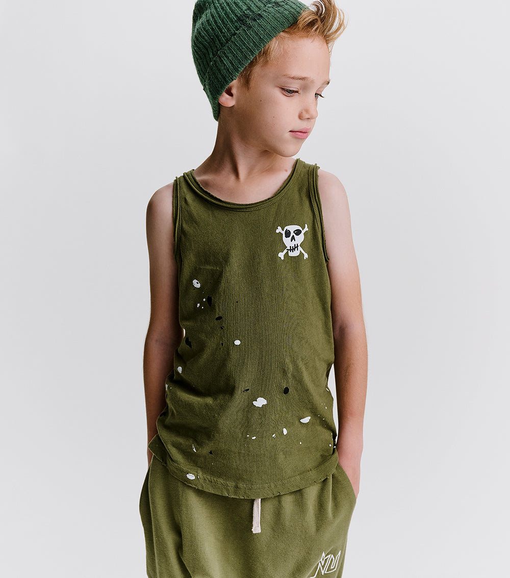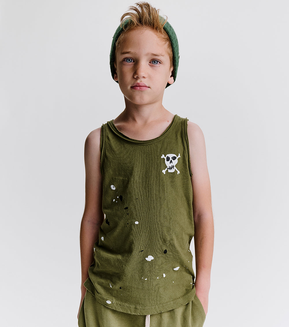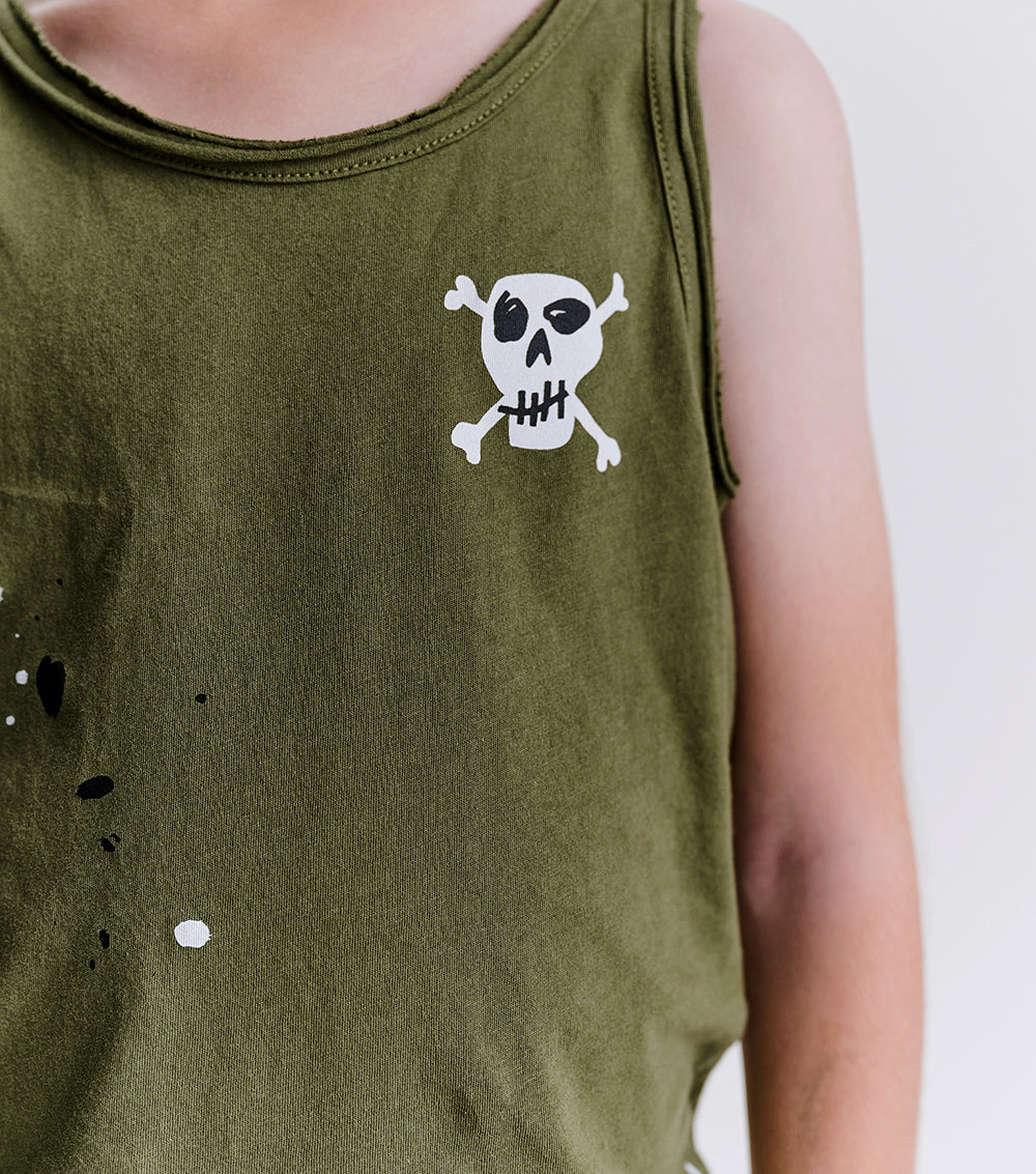 this artsy tank makes a statement to the whole playground: don’t cross the kid repping these crossbones. it’s a gender neutral cut made of olive single cotton with a raw rolled up collar & sleeve hems. the chest features a tiny woozy skull print on the chest that almost looks drawn on in pencil by your little rebel. if that wasn't enough, we’ve added black & white splashes of print kinda like your kid got carried away creating this wearable masterpiece.