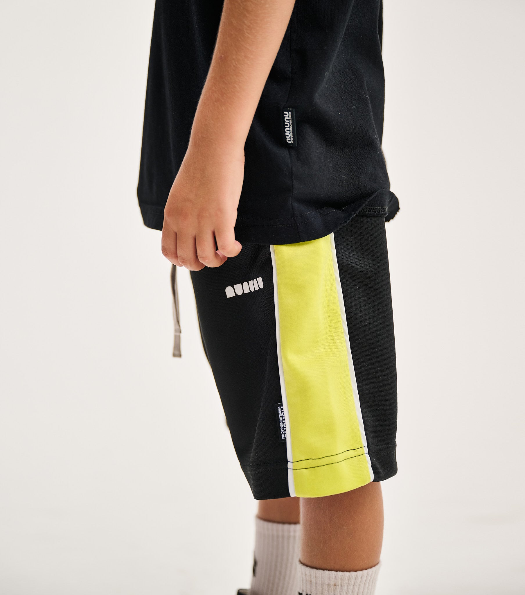 for the kid who’s never sitting out, these black active poly shorts have got lines to sit out for them. they’re a gender neutral cut with a stretchy waistband that makes it easy to pull skillful maneuvers in any game. hot lime runs across the top & sides with white trim to ensure these shorts stand out as much as they do. plus, sleek side pockets & a low profile back pocket are the perfect spot for storing genius game plans. oh yeah, and for that extra edge we’ve got our signature spookies spelling out nununu on the leg. because it’s never a bad idea to warn the competition about the scary good player they’ll be up against.