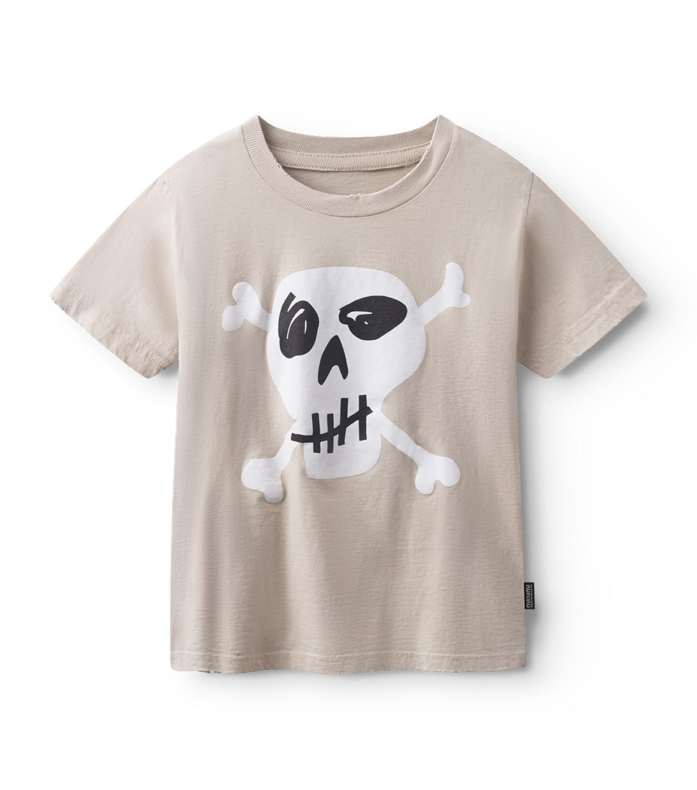 cool, classic and just a little bit kooky. this tee is a total match for your kid. it’s a gender neutral cut with custom deconstruction details that give it a loved to death look. it’s made of smokey natural single cotton with a skull print that  looks drawn on in pencil. obviously, we’re all about it and we’re sure your kid will be too.