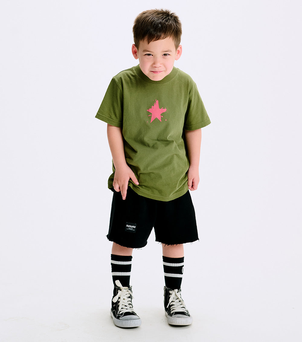 some days your kid just wants to lie flat & chill. this is the tee they’re going to want to do it in. it’s a simple gender neutral cut made of seriously comfy olive single cotton. a hot pink star is splatted on the chest kinda like your kid on their bed after a long day of running around & playing too hard. of course, the custom deconstruction is there to complete the full worn out look.