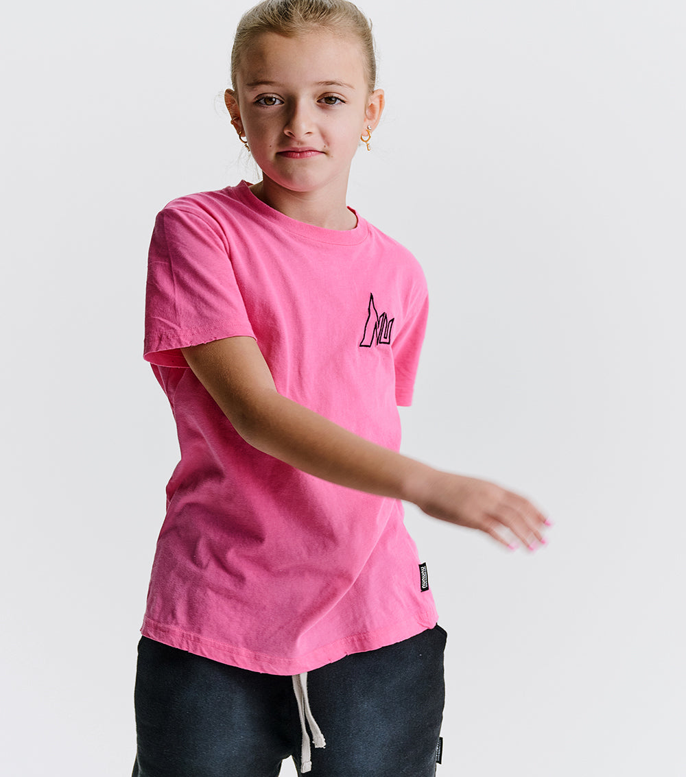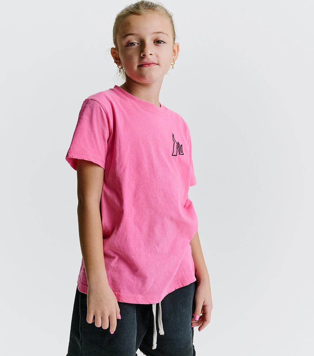 meet the perfect tee for the kid who loves to live life on the edge. it’s a gender neutral cut in hot pink single cotton with a bit of a washed texture. evidence that it’s soon-to-be your kid’s favorite fit. even better, nu is stitched on in a font that’s got major super hero (or villain) vibes. of course, the custom deconstruction is there to show this kid is ready to fight for the ones they love, or at least be a bit of a menace if it seems like they might not get their way.