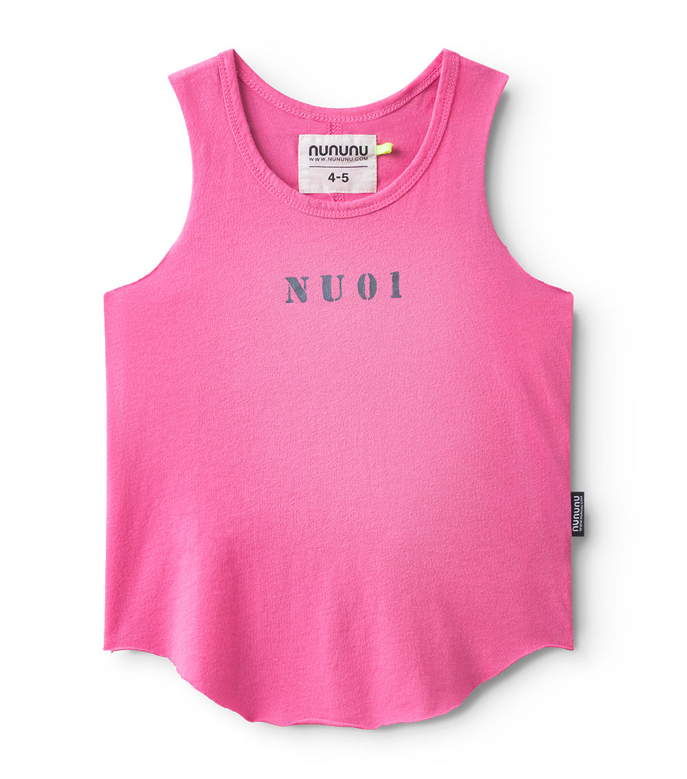 you know your kid is number one so let’s make sure the world always knows it too. this tank is the perfect place to start. it’s a gender neutral cut made of hot pink single cotton with super rounded & raw hems at the bottom & where the sleeves would be. of course, it says nu01 in a serious font because your kid is always number one. a fact that’s never up for debate.