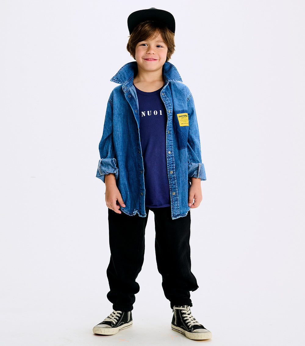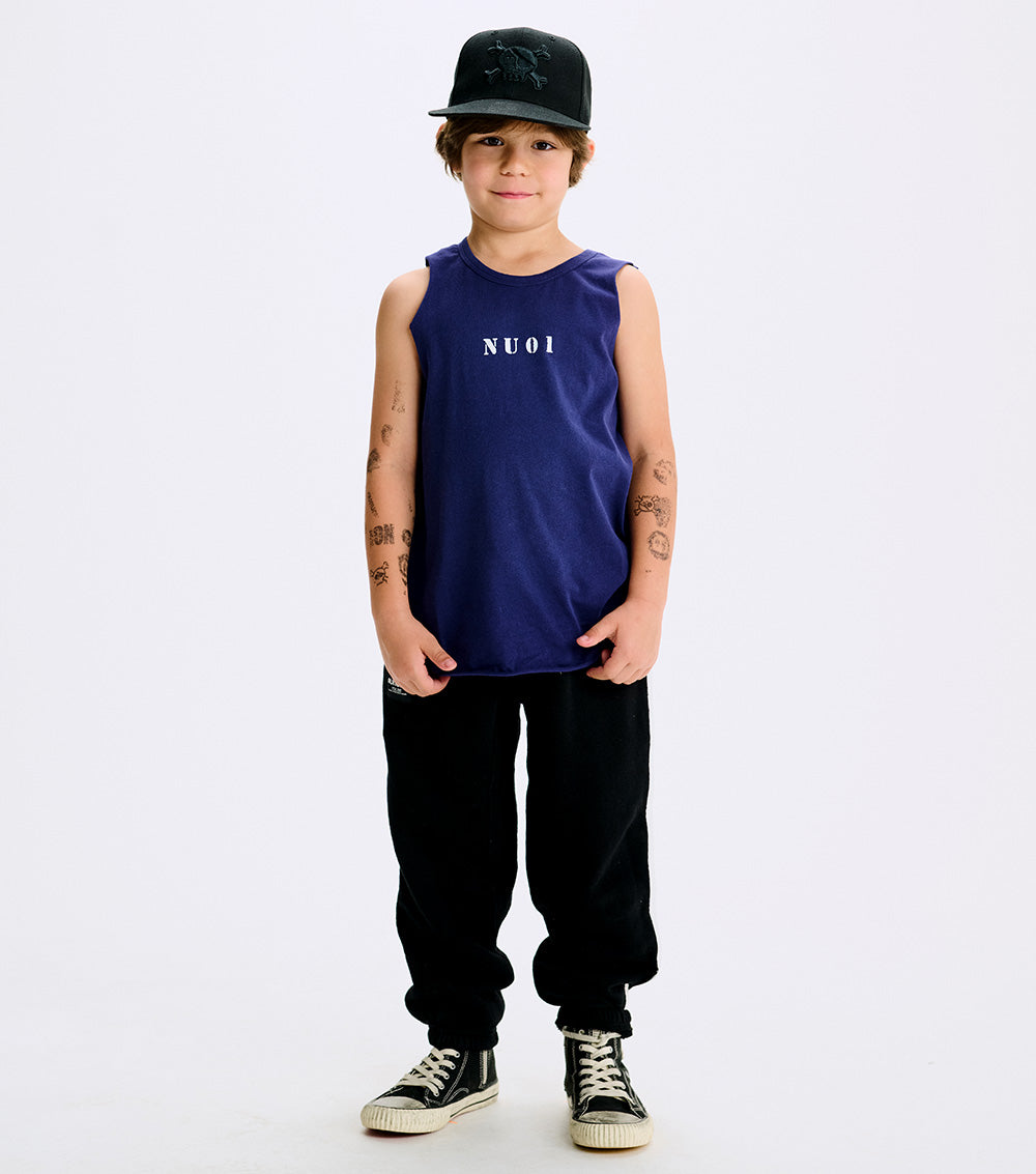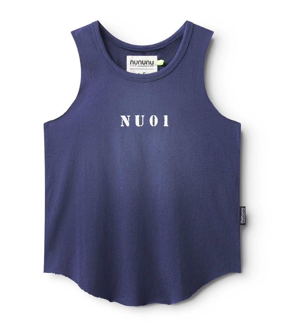 you know your kid is number one so let’s make sure the world always knows it too. this tank is the perfect place to start. it’s a gender neutral cut made of indigo single cotton with super rounded & raw hems at the bottom & where the sleeves would be. of course, it says nu01 in a serious font because your kid is always number one. a fact that’s never up for debate.