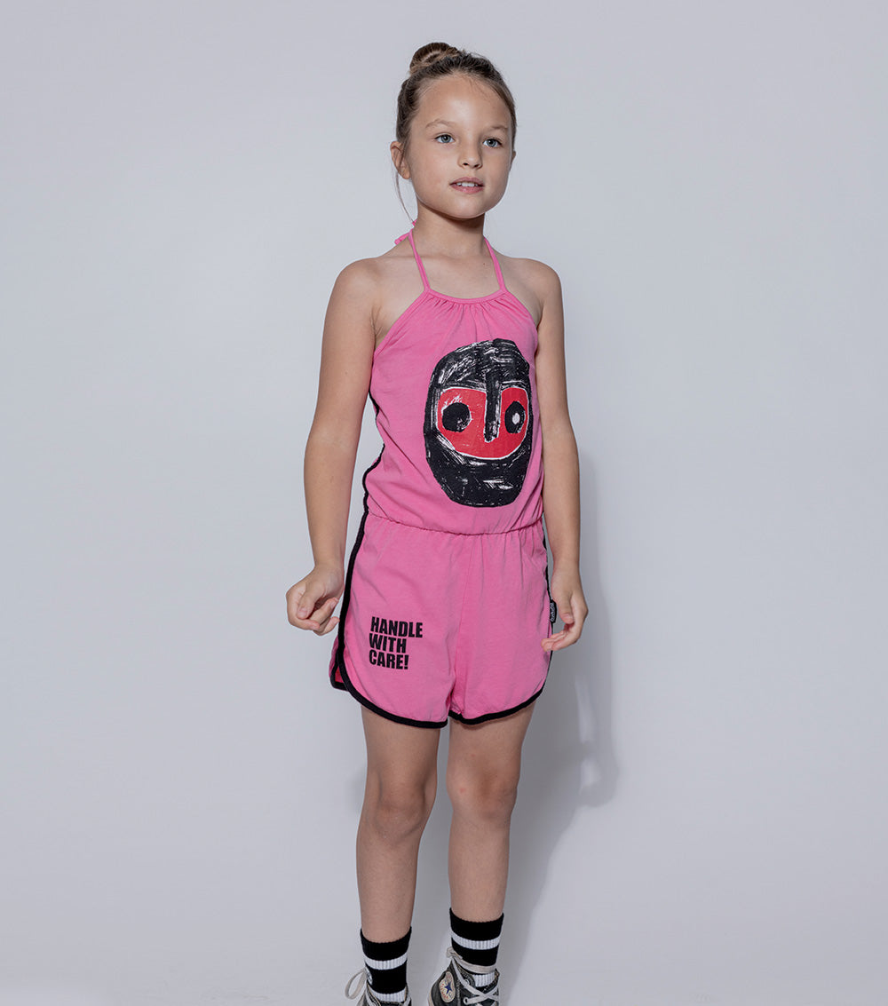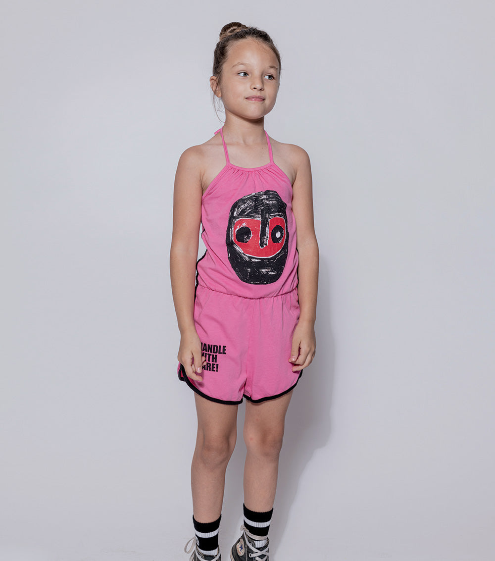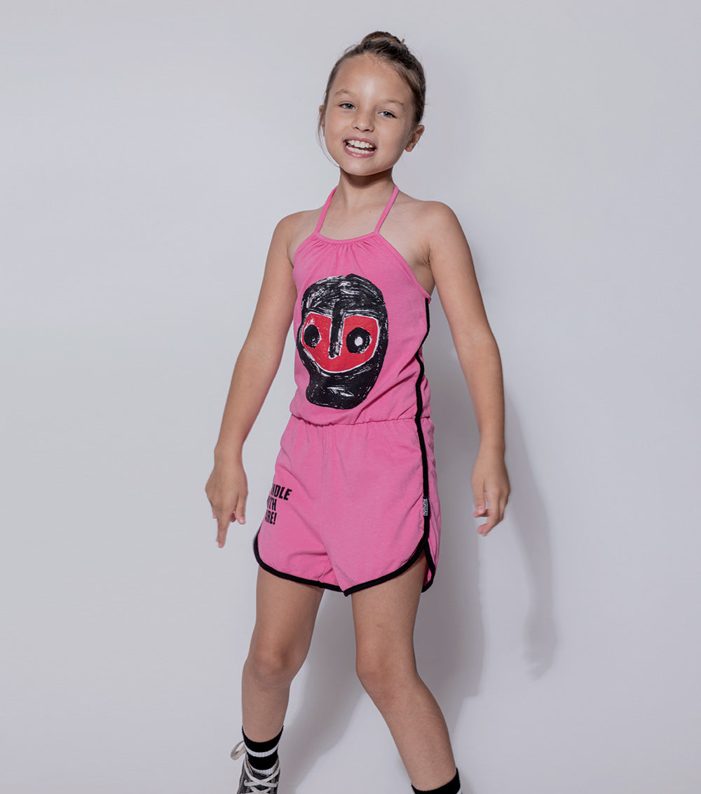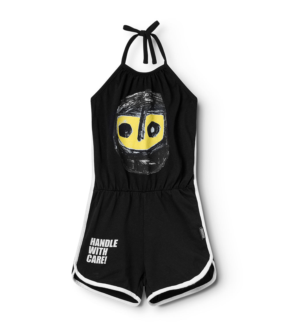 there’s a real ‘7s feel to this summer fun one-piece black overall for girls. on the bottom, they’re the classic gym shorts with contrast piping. on top, it’s a sleeveless shirt with a tie-neck halter. our warrior shows up on the front. this very nununu design is a fun take on the global culture of face-covering that defines our times, a symbol of human unity. on the leg, it says “handle with care” in case there was any question.
