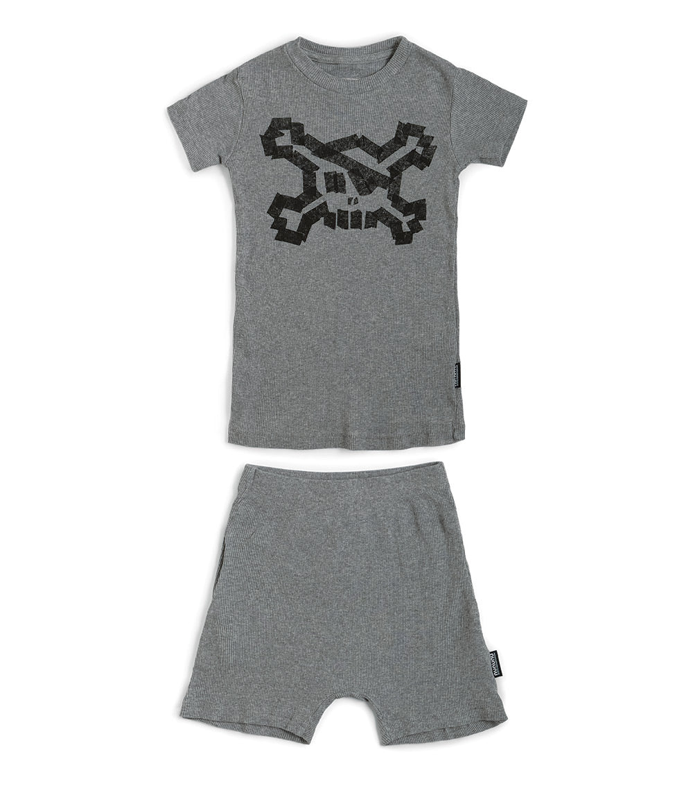 this heather grey unisex ribbed t shirt & shorts black loungewear set features the beloved skull logo in our new masking tape effect, which is our way of saying it’s cool to have fun & express yourself with whatever is lying around the house. soft as hell and totally swaggy, it’s the best way to keep some semblance of style dignity, even as the summer months present the opportunity for a level of lounging that could be considered excessive.
