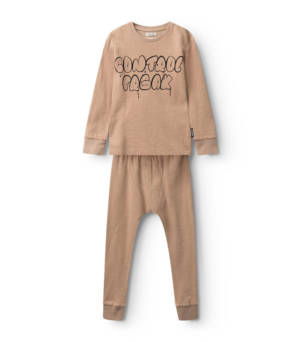 kids can reign over any sleepover with this totally rad coffee-colored loungewear set. it’s got control freak tagged across the chest in bubbly, drippy graffiti letters for that boss kid energy. this extremely cozy fit lets boys & girls chill out in chic style with a long sleeve t-shirt & long bottoms. the slub material is flexible with a bit of texture. it’s got shell fabric cuffs and a soft waistband for maximum comfort so it’s ready for pillow fights and nerf battles.