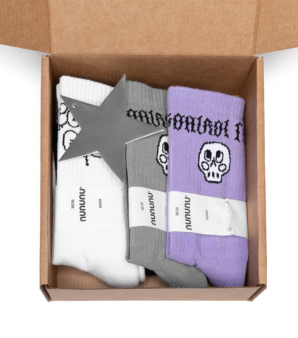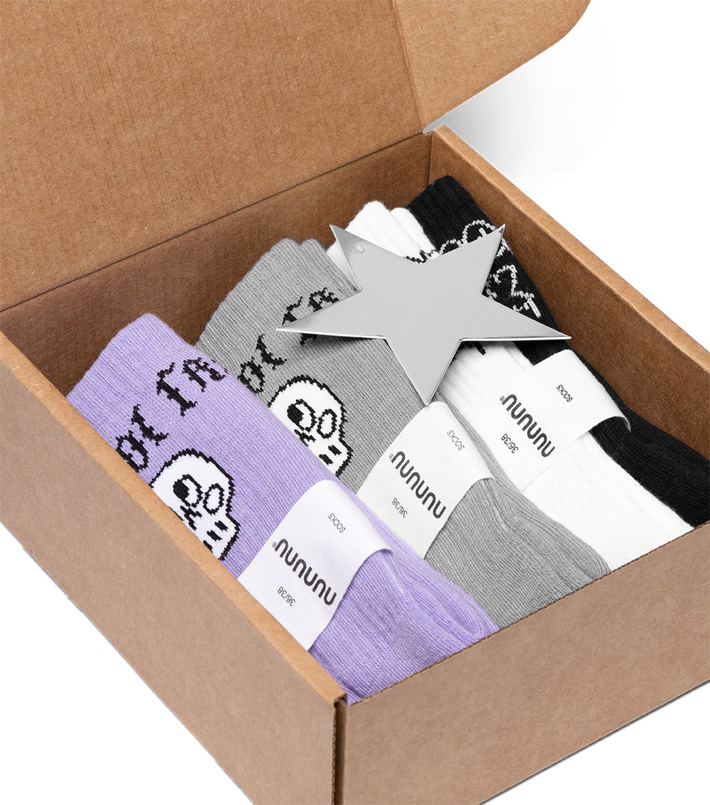 celebrate the holiday season with the nununu 4-sock gift box—a festive treat for all ages and sizes! pre-packed with four pairs of comfy nununu crew socks in bold designs, this holiday-ready gift box is wrapped with a sequin elastic band and includes a festive metallic star for added sparkle. whether you're stuffing stockings or looking for the perfect all-around gift, this sock box delivers the holiday bling. all you need to do is choose your size and you're set for a treat.