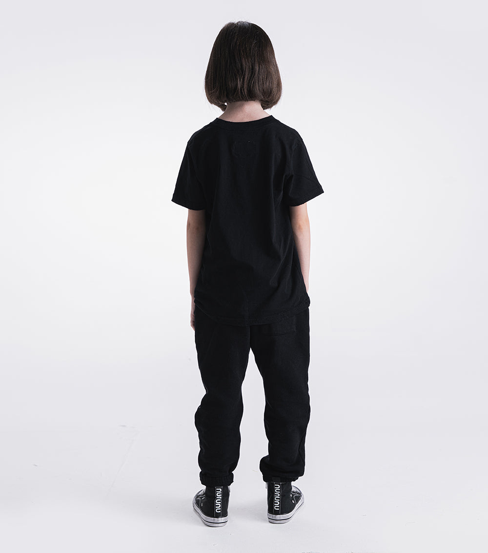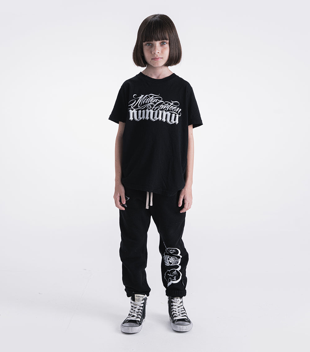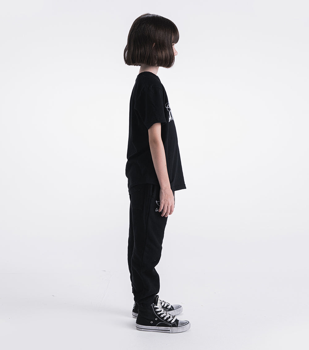 these basic cut sweatpants for boys & girls are all black with a peek of white detail because we like to keep it dark. they’re printed with a totally rad design made in collab with super talented tattoo artist, mister cartoon. it's got his iconic winged dude to remind us all of our roots and control freak written underneath to remind us of ours. top it off we added a back pocket with a logo label for when everyone asks where you got this cool fit. tell them they’re made of way too soft & comfy french terry so they’re basically impossible to want to take off. oh yeah, and it’s got jogger-style cuffs because your kid is always either in a mood or on the move.