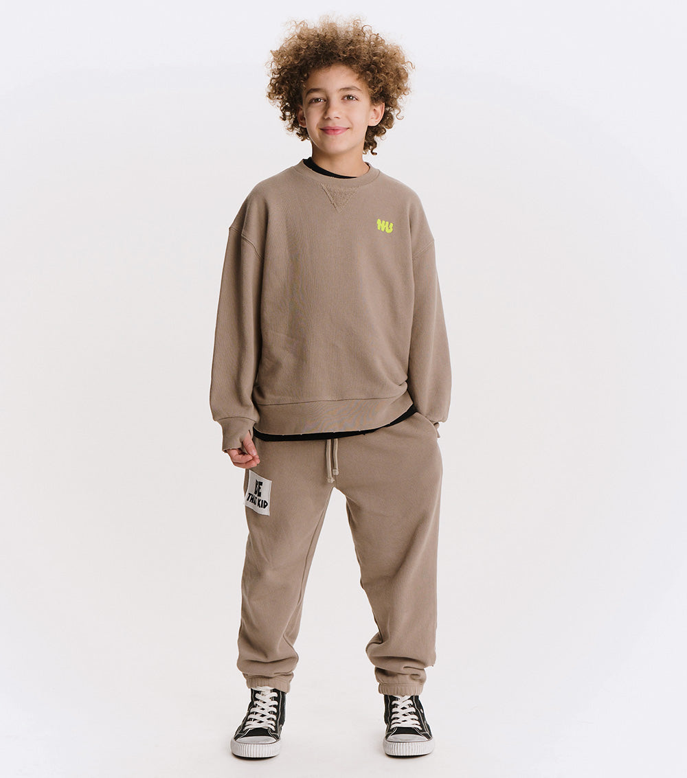 keep it simple, but say it loud in these gender neutral stone-hued french terry sweatpants. they bring cozy comfort with a creative streak, featuring a patch that says “be that kid” in a font that looks like they drew it on themselves. it’s there to remind the world that they’ll always be unapologetically themself. elastic waist, elastic cuffs, & side pockets, make it equal parts comfy & functional. perfect for living life to the fullest and never holding back. as kids do.