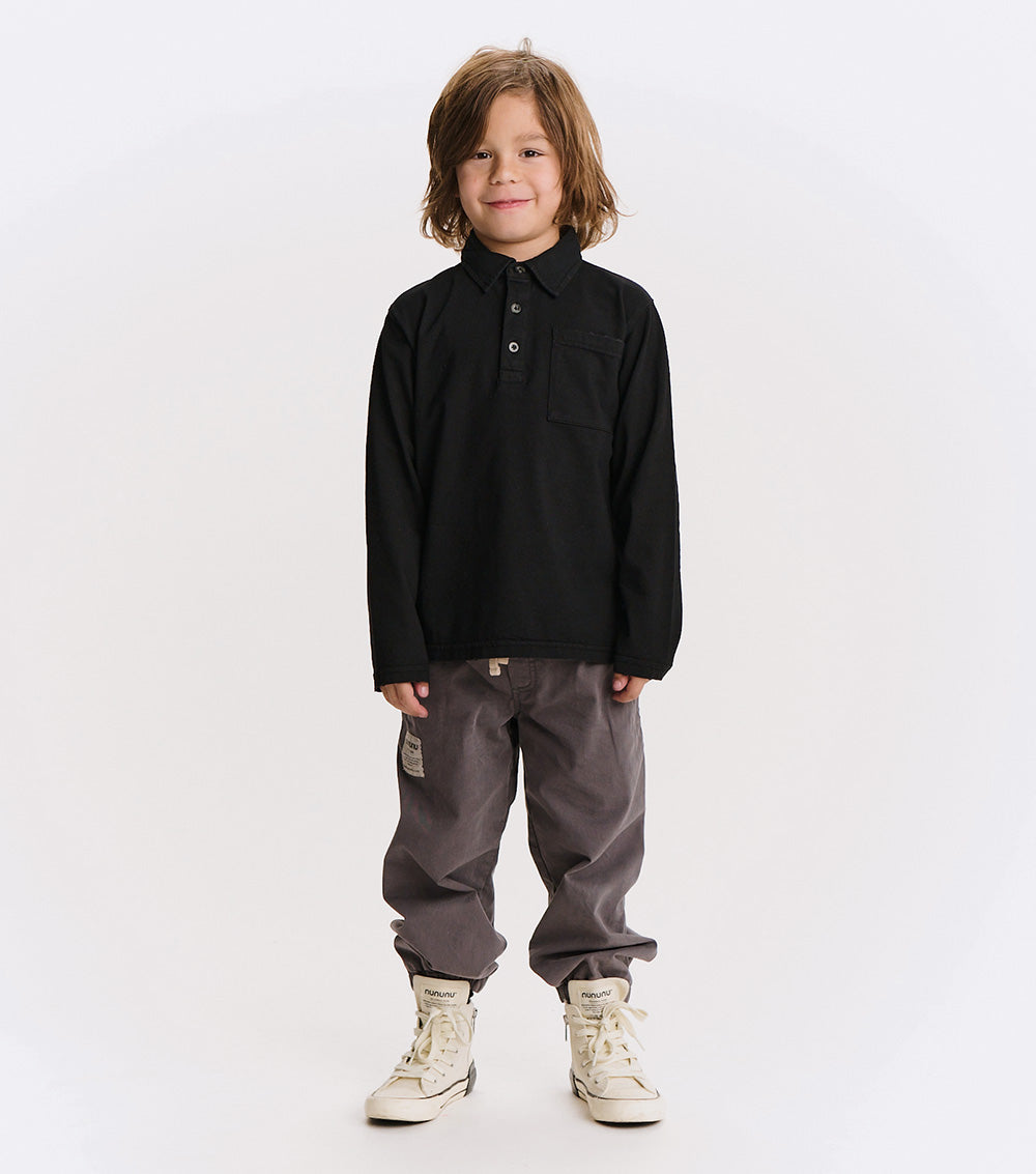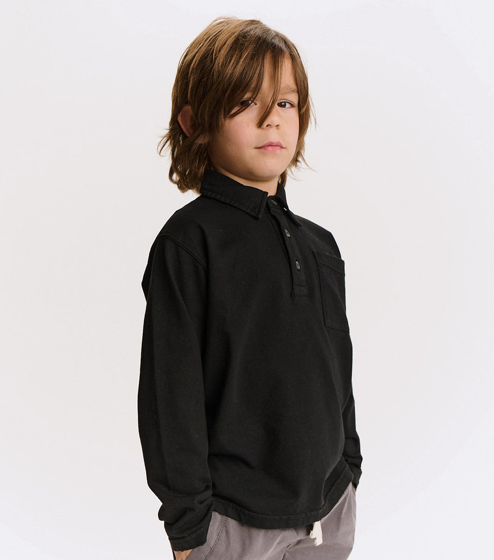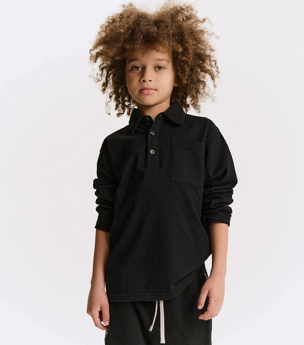 watch out dad’s closet, this shirt is coming for your all-time favorite look. it’s a classic, long sleeved polo made of a black pique so it’s super breathable with a ribbed collar just waiting to be popped. it’s a gender neutral cut with a washed sort of look that gives it a pre-loved through the decades feel. it’s a little faded and a little vintage in a way that seems like maybe it was a back to the future vibe.