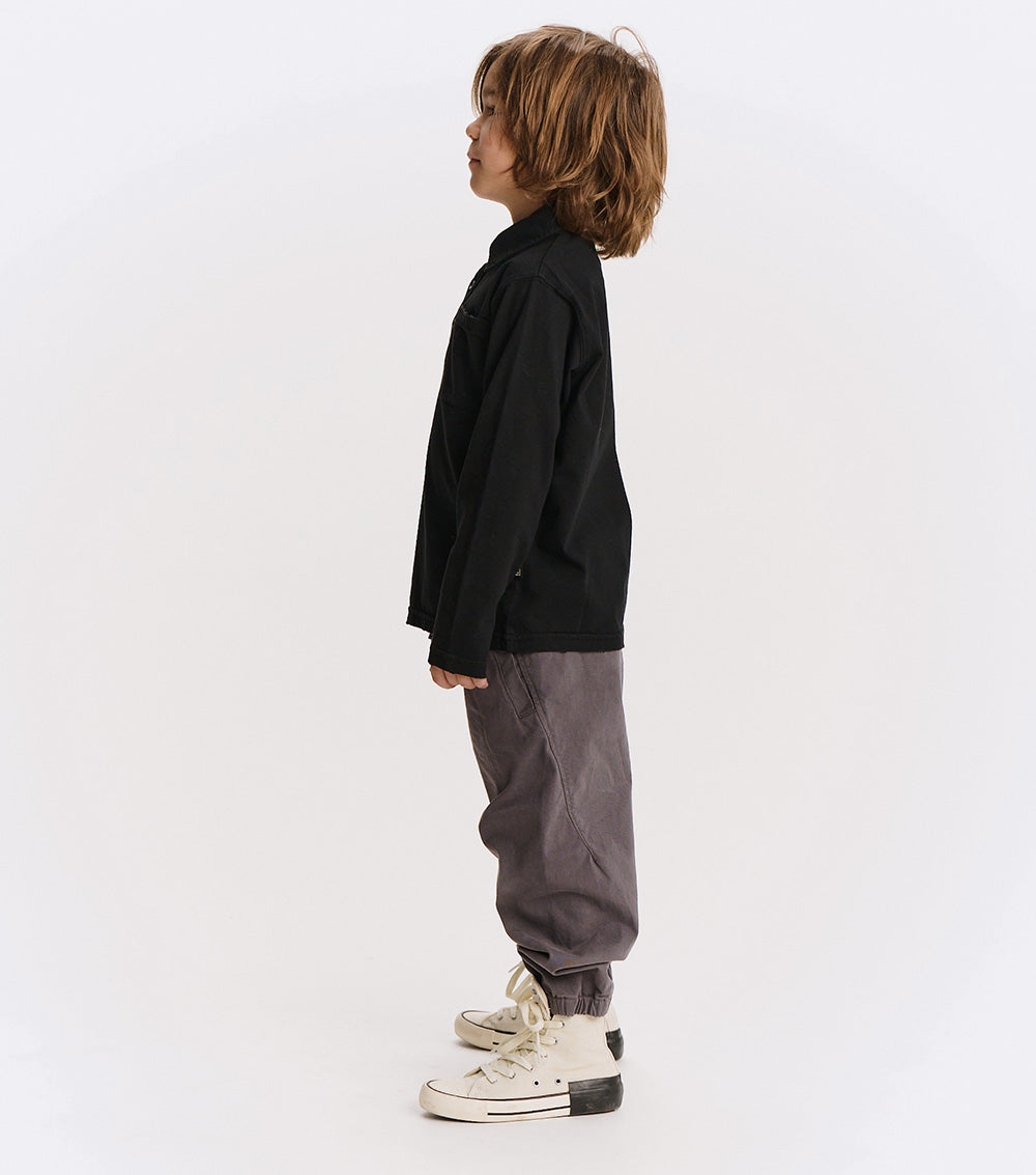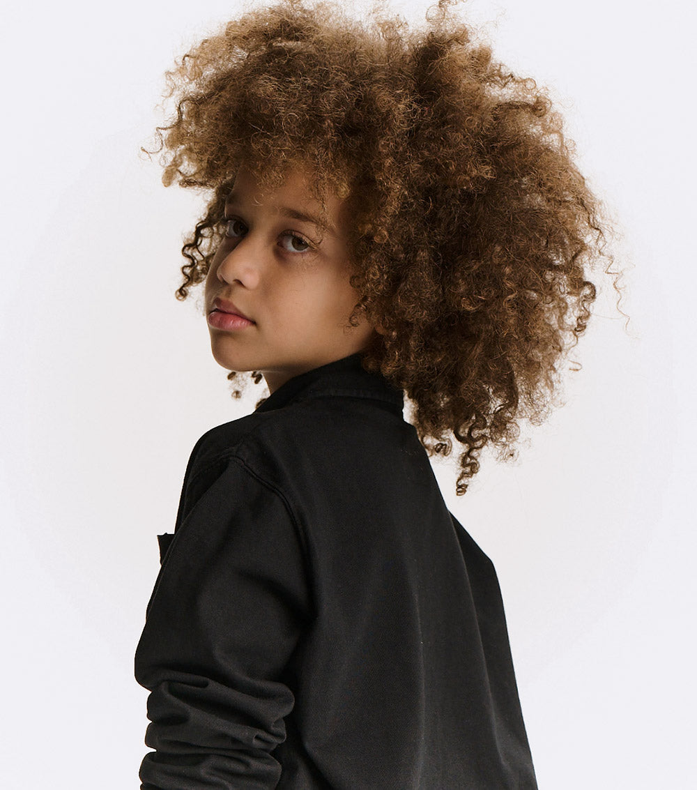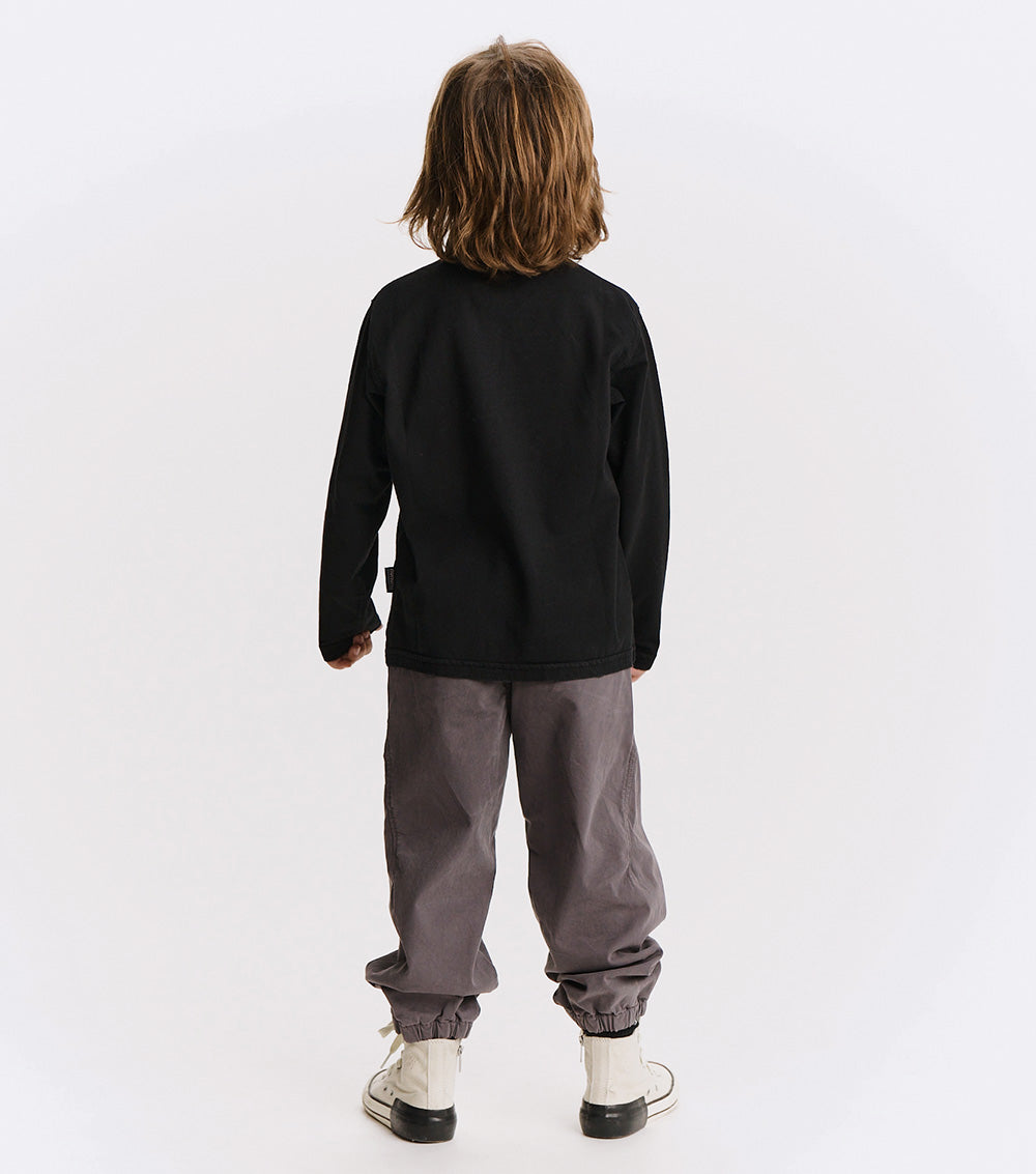 watch out dad’s closet, this shirt is coming for your all-time favorite look. it’s a classic, long sleeved polo made of a black pique so it’s super breathable with a ribbed collar just waiting to be popped. it’s a gender neutral cut with a washed sort of look that gives it a pre-loved through the decades feel. it’s a little faded and a little vintage in a way that seems like maybe it was a back to the future vibe.