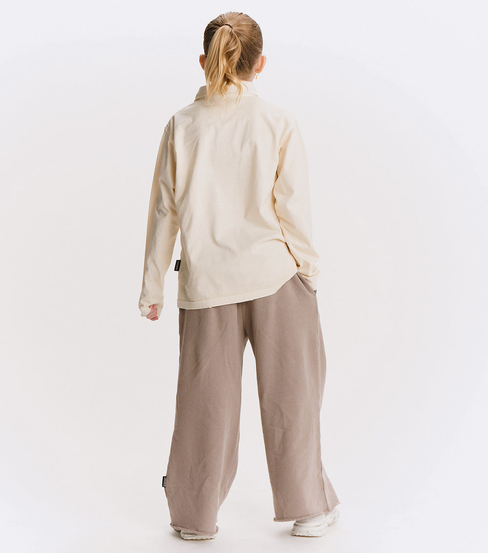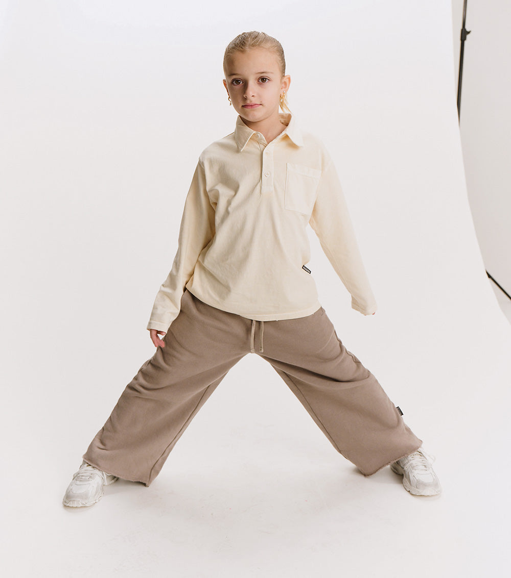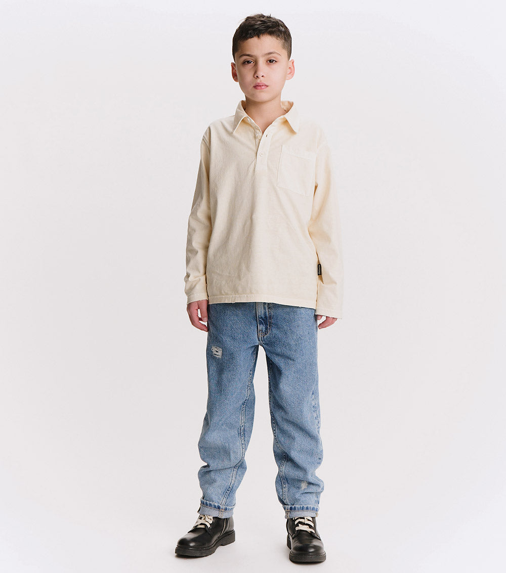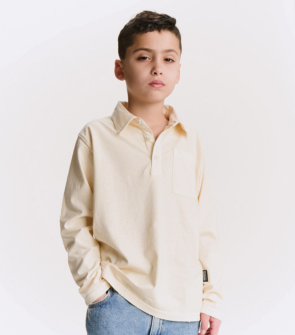 watch out dad’s closet, this shirt is coming for your all-time favorite look. it’s a classic, long sleeved polo made of a natural pique so it’s super breathable with a ribbed collar just waiting to be popped. it’s a gender neutral cut with a washed sort of look that gives it a pre-loved through the decades feel. it’s a little faded and a little vintage in a way that seems like maybe it was a back to the future vibe.