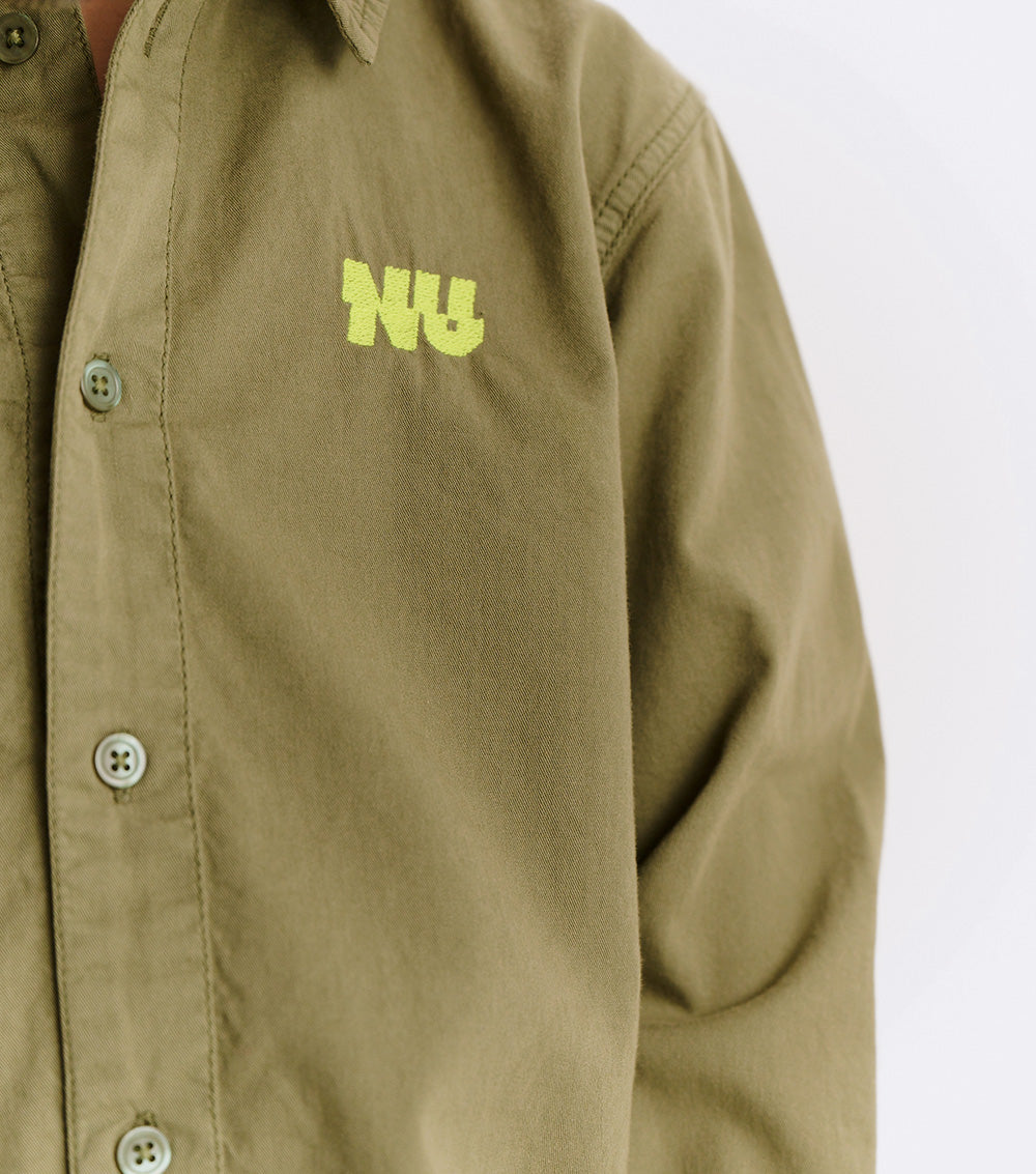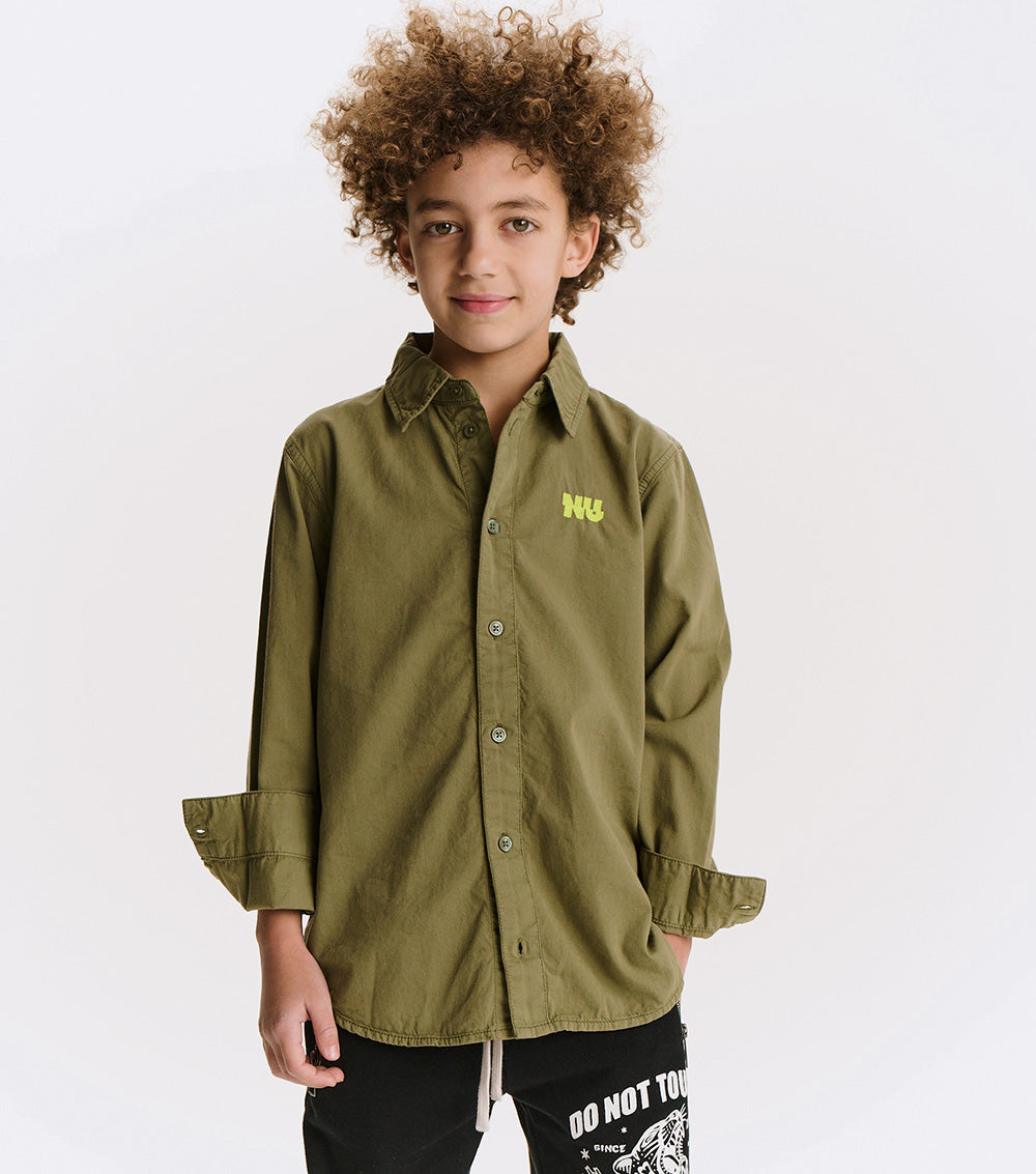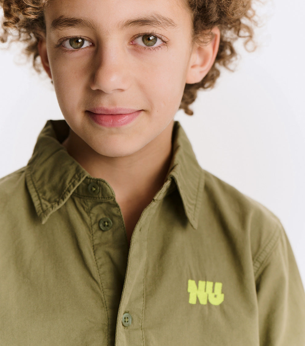 button up, but make it cool. this isn't your stiff, scratchy oxford - it's woven, but soft like your kid's fave tee. made to move, made to chill, made to impress. wear it to a wedding or the playground. nu pops loud in hot lime, embroidered right where it counts. no frills. just a clean, classic look with a nununu twist. play hard, look sharp.