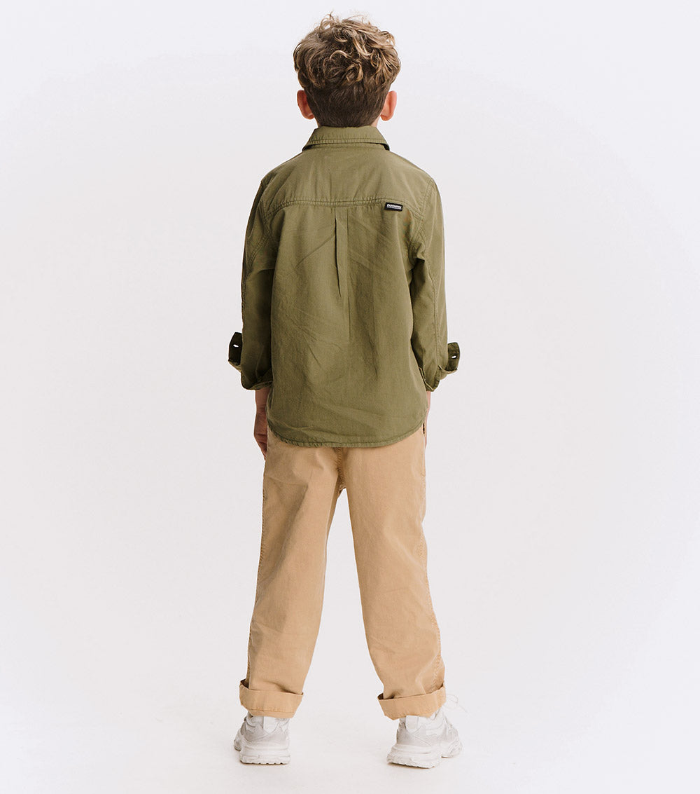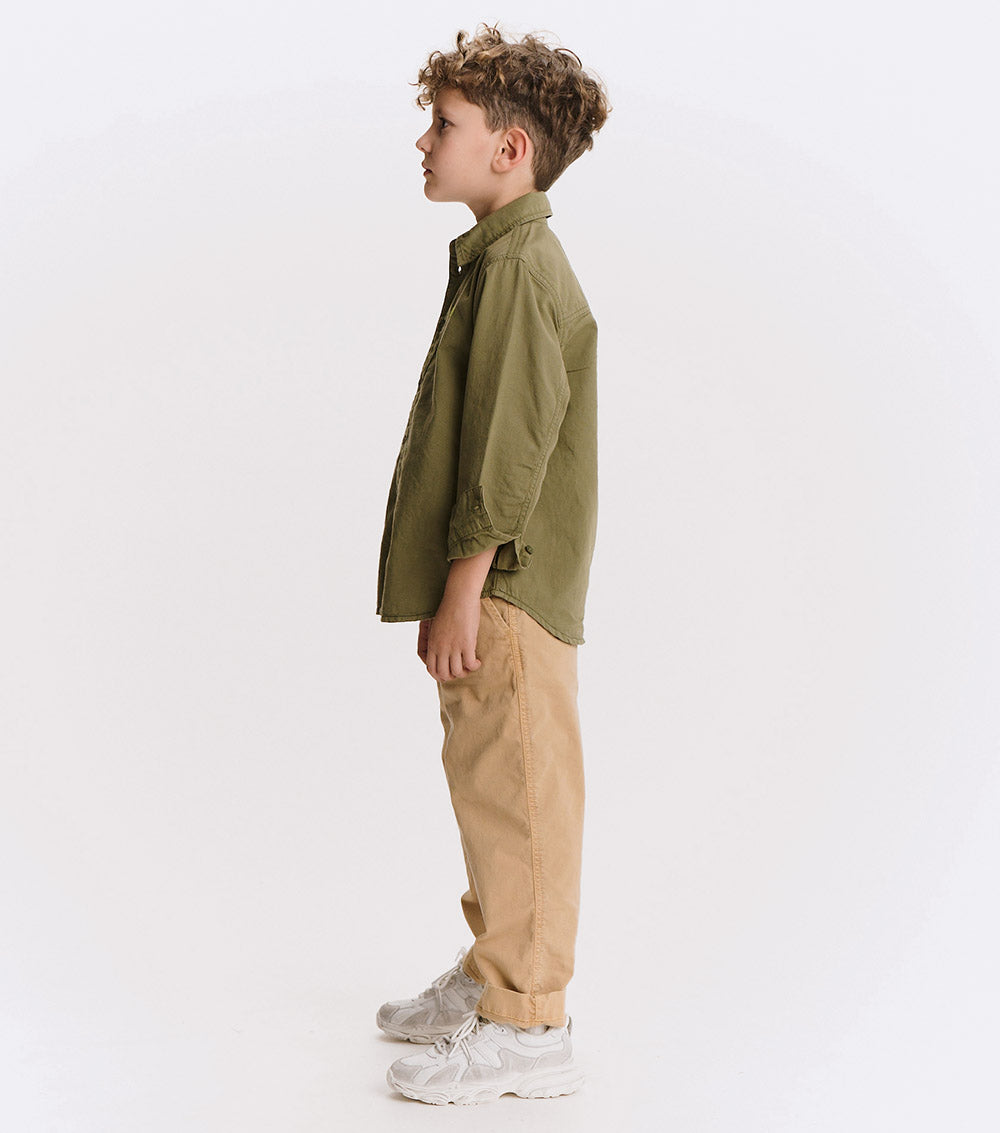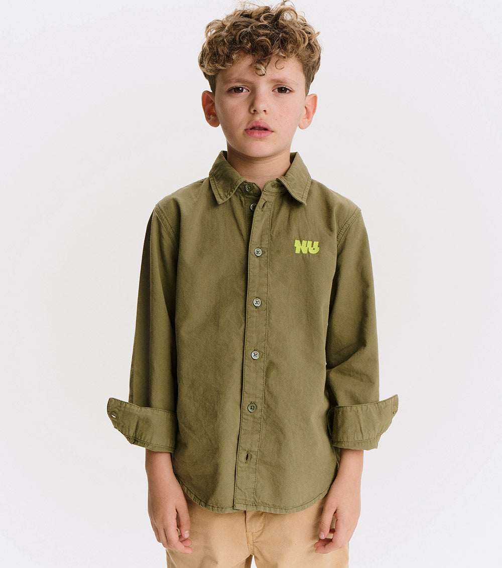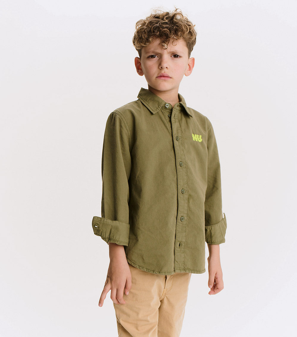 button up, but make it cool. this isn't your stiff, scratchy oxford - it's woven, but soft like your kid's fave tee. made to move, made to chill, made to impress. wear it to a wedding or the playground. nu pops loud in hot lime, embroidered right where it counts. no frills. just a clean, classic look with a nununu twist. play hard, look sharp.