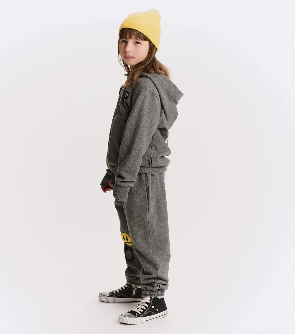 we know your kid has stories to tell. so, here's a pair of sweatpants to get them started. this gender-neutral french terry fit brings that worn-in, world-traveled feel. they’ve got a clean grey base with a bold graphic that looks like a remix of those classic i heart nyc tourist tees but with a bold smirky print. elastic waistband, cuffed ankles, and side pockets keep it comfy & cool. pair with the hoodie for the full nostalgia trip.