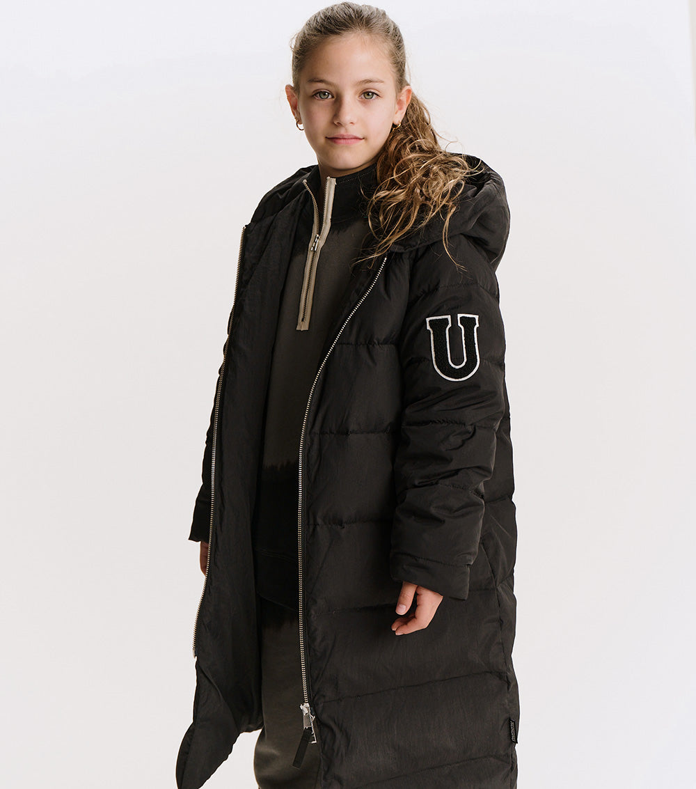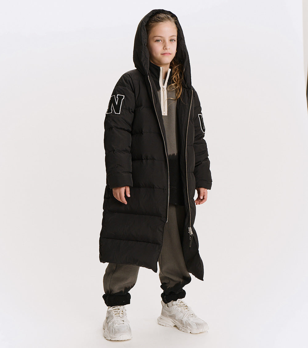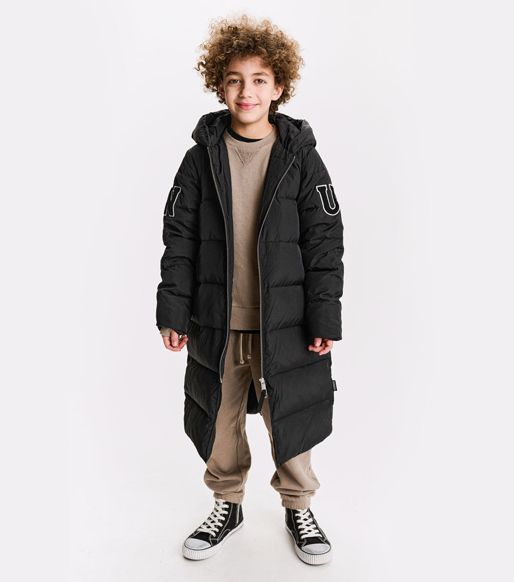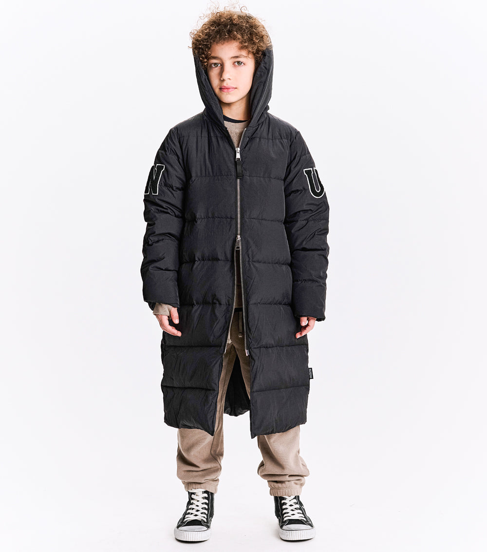 the ultimate nununu outerwear staple, this long black down coat will keep boys & girls rocking through winter in sleek style and a classic N patch on the sleeves. with an oversized hood & deep front pockets, it’s quilted for shape & equipped to keep your kid cozy. no worries about overheating though, we’ve got shoulder straps inside so kids can take it off and wear it like a backpack because they would never want to lose this killer piece.