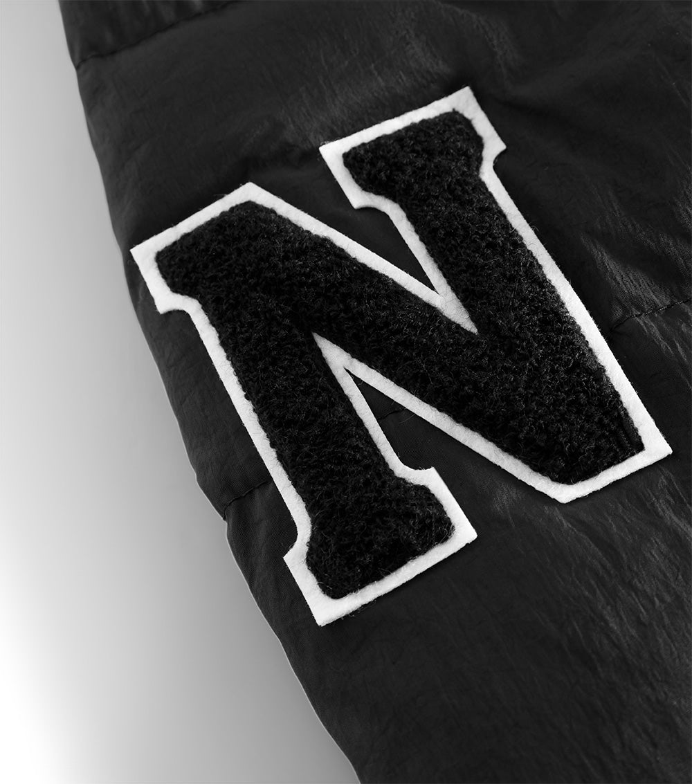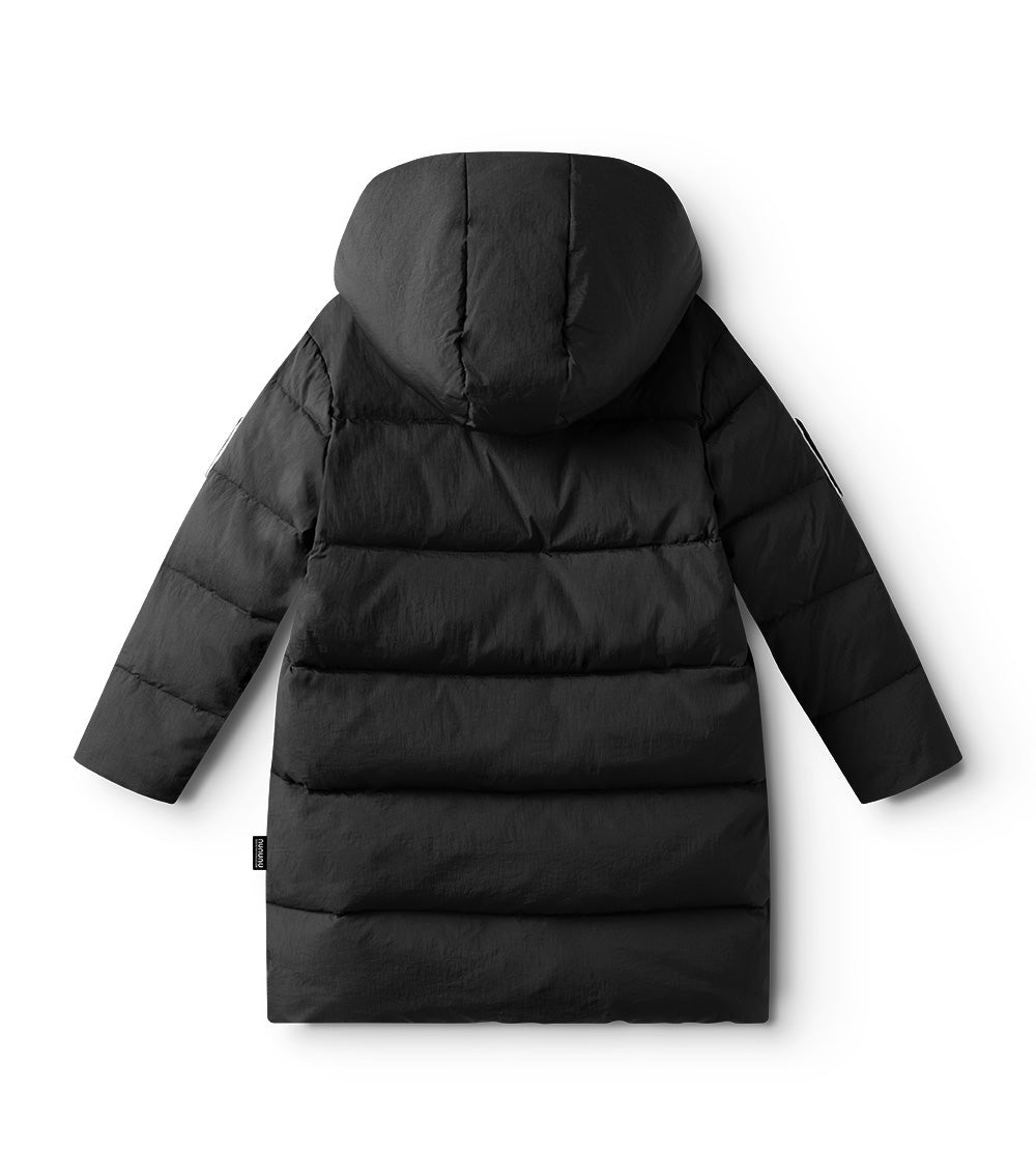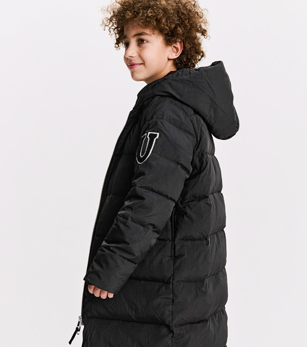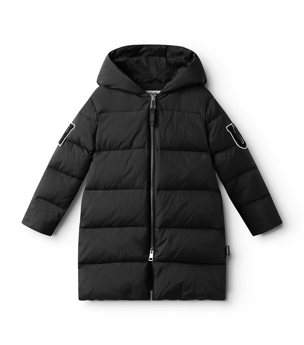 the ultimate nununu outerwear staple, this long black down coat will keep boys & girls rocking through winter in sleek style and a classic N patch on the sleeves. with an oversized hood & deep front pockets, it’s quilted for shape & equipped to keep your kid cozy. no worries about overheating though, we’ve got shoulder straps inside so kids can take it off and wear it like a backpack because they would never want to lose this killer piece.
