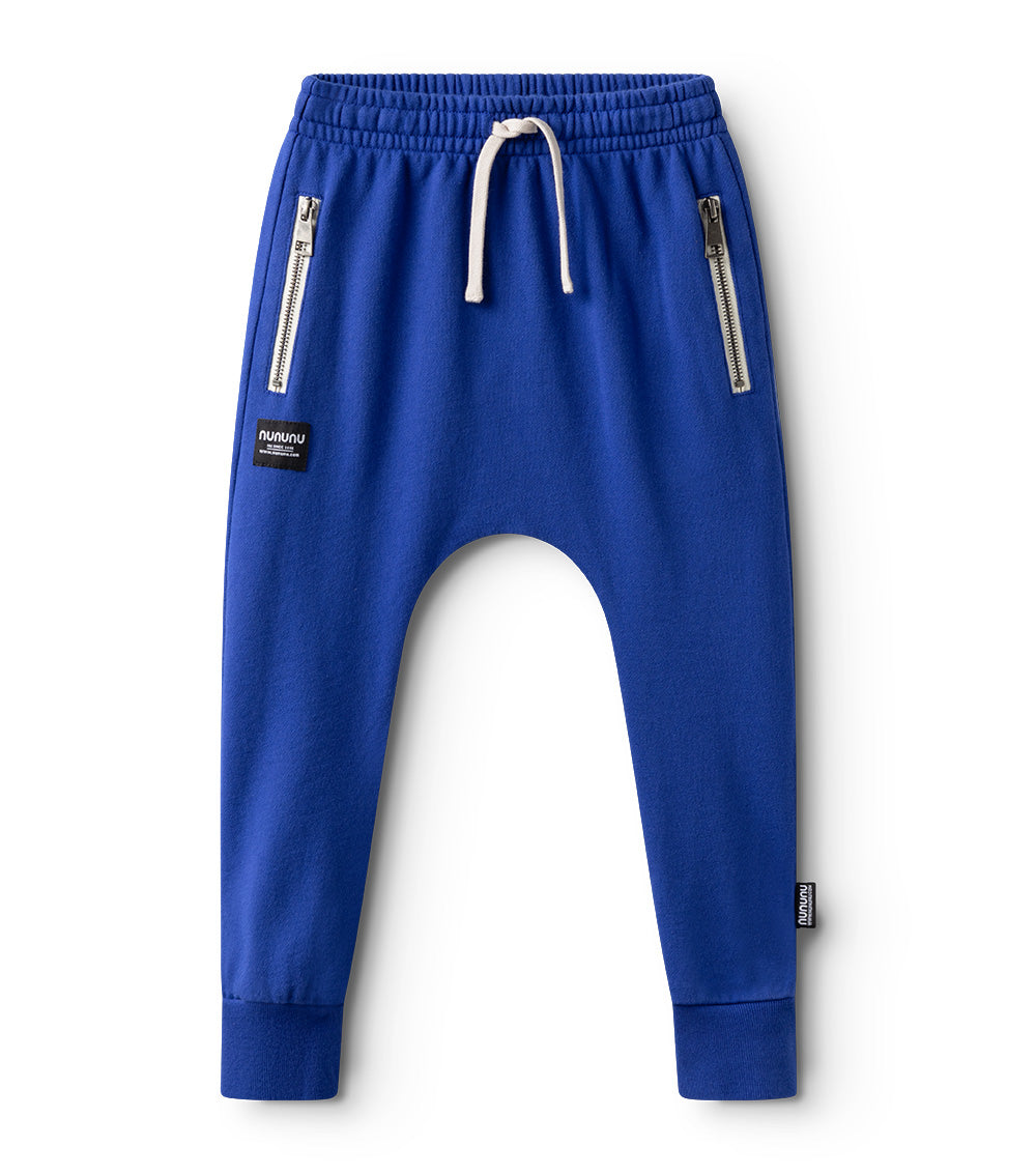 slouch mode: activated. these gender-neutral blue french terry pants bring the cool factor with a comfy dropped crotch & contrasting side zipper pockets. the drawstring waistband keeps it all in place while ankles cuffs give it a clean finish to pair with your favorite dirty kicks. made for movement, ideal for lounging, perfect for whatever.