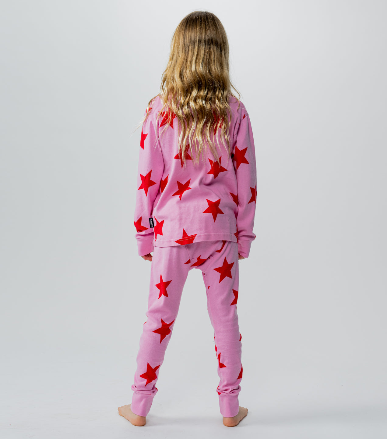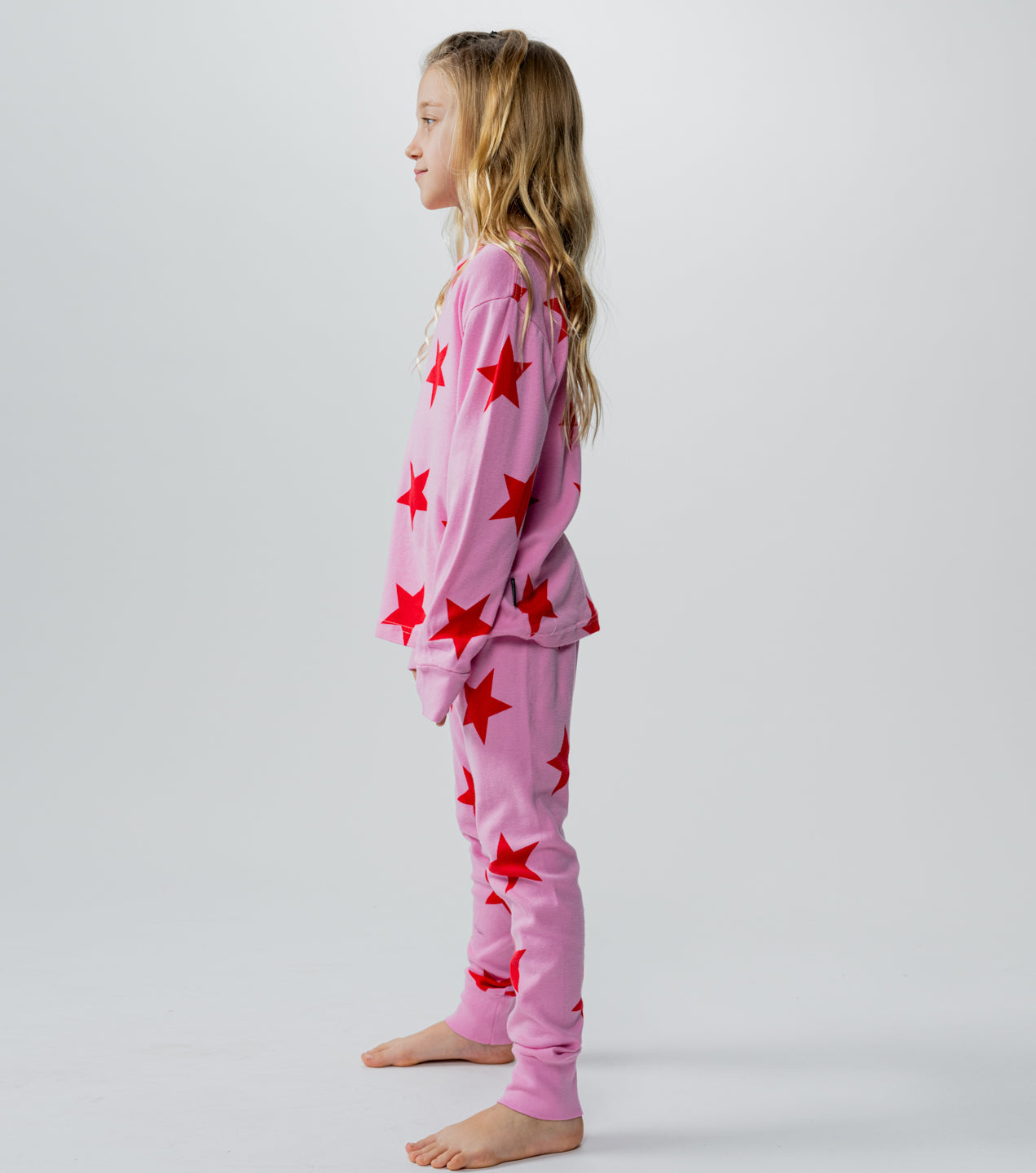 you know you can’t get enough of our signature star print and we can’t either. that’s why we’ve spangled it all over this super pink fine rib cotton lounge set for boys & girls. it’s got shell fabric cuffs and a soft waistband for maximum comfort. worn together or separately, this set has a long-sleeve t-shirt & bottoms & is soft as hell & totally swaggy. it’s the best way to keep some semblance of style dignity, even as the cold winter months present the opportunity for a level of indoor lounging that could be considered excessive.