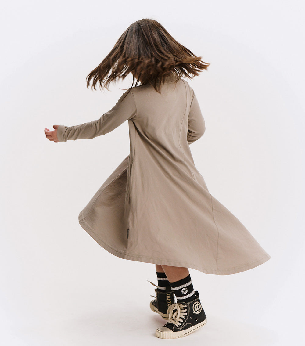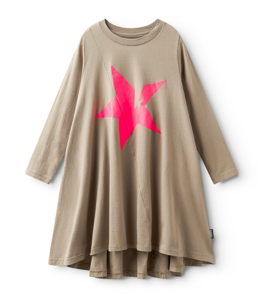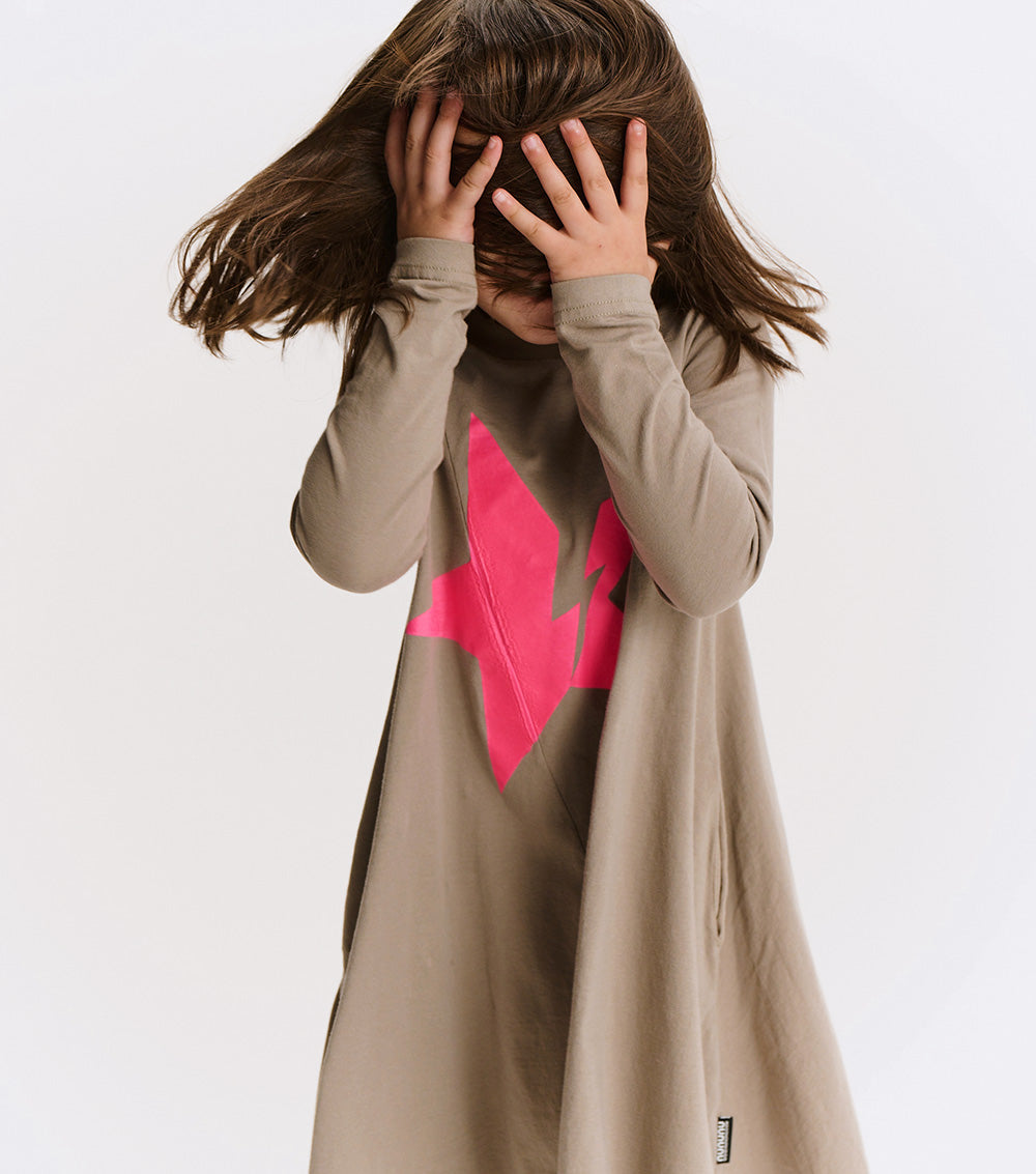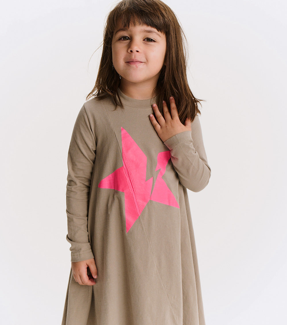 the iconic 360 dress is now fully charged. it’s made of soft, stone-colored single cotton with long sleeves and that flowy, twirl-ready silhouette that kids & grown-ups obsess over. the bold hot pink star gets hit with a lightning bolt for an extra energy surge your kid didn’t know they needed. a diagonal seam slices through the middle, upping the edge factor. feels like power. wears like a dream.
