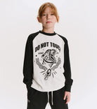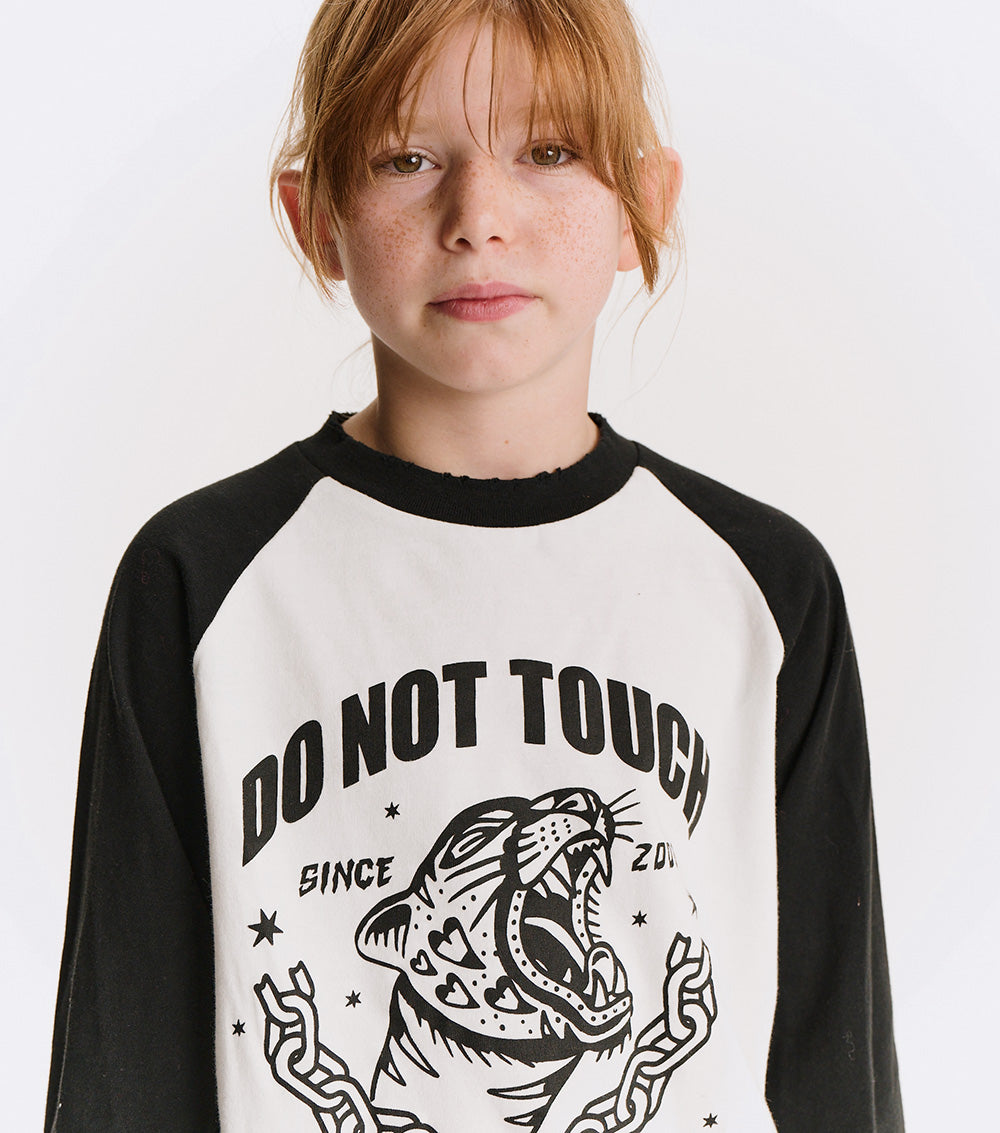 meet the tee that’ll set your kid’s wild side free. it’s a black on white gender neutral baseball raglan-style look made of single cotton with custom deconstruction for that cool kid flair. but what really stands out is the contrasting black print that warns onlookers with a nice & big do not touch print. it’s right above a super fierce tiger breaking free, just like your kid is breaking the mold and always doing their thing. the hearts on the tiger’s cheeks let us know that it's all about strength in love, symbolic of your kid’s innate power to do anything they set their mind to, with love in their hearts.